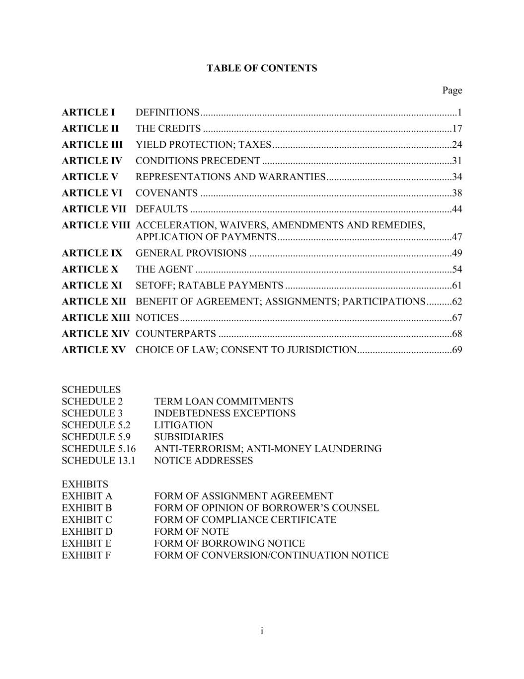 i TABLE OF CONTENTS Page ARTICLE I DEFINITIONS ....................................................................................................1  ARTICLE II THE CREDITS .................................................................................................17  ARTICLE III YIELD PROTECTION; TAXES ......................................................................24  ARTICLE IV CONDITIONS PRECEDENT ..........................................................................31  ARTICLE V REPRESENTATIONS AND WARRANTIES .................................................34  ARTICLE VI COVENANTS ..................................................................................................38  ARTICLE VII DEFAULTS ......................................................................................................44  ARTICLE VIII ACCELERATION, WAIVERS, AMENDMENTS AND REMEDIES, APPLICATION OF PAYMENTS ....................................................................47  ARTICLE IX GENERAL PROVISIONS ...............................................................................49  ARTICLE X THE AGENT ....................................................................................................54  ARTICLE XI SETOFF; RATABLE PAYMENTS .................................................................61  ARTICLE XII BENEFIT OF AGREEMENT; ASSIGNMENTS; PARTICIPATIONS ..........62  ARTICLE XIII NOTICES ..........................................................................................................67  ARTICLE XIV COUNTERPARTS ...........................................................................................68  ARTICLE XV CHOICE OF LAW; CONSENT TO JURISDICTION .....................................69  SCHEDULES SCHEDULE 2 TERM LOAN COMMITMENTS SCHEDULE 3 INDEBTEDNESS EXCEPTIONS SCHEDULE 5.2 LITIGATION SCHEDULE 5.9 SUBSIDIARIES SCHEDULE 5.16 ANTI-TERRORISM; ANTI-MONEY LAUNDERING SCHEDULE 13.1 NOTICE ADDRESSES EXHIBITS EXHIBIT A FORM OF ASSIGNMENT AGREEMENT EXHIBIT B FORM OF OPINION OF BORROWER’S COUNSEL EXHIBIT C FORM OF COMPLIANCE CERTIFICATE EXHIBIT D FORM OF NOTE EXHIBIT E FORM OF BORROWING NOTICE EXHIBIT F FORM OF CONVERSION/CONTINUATION NOTICE