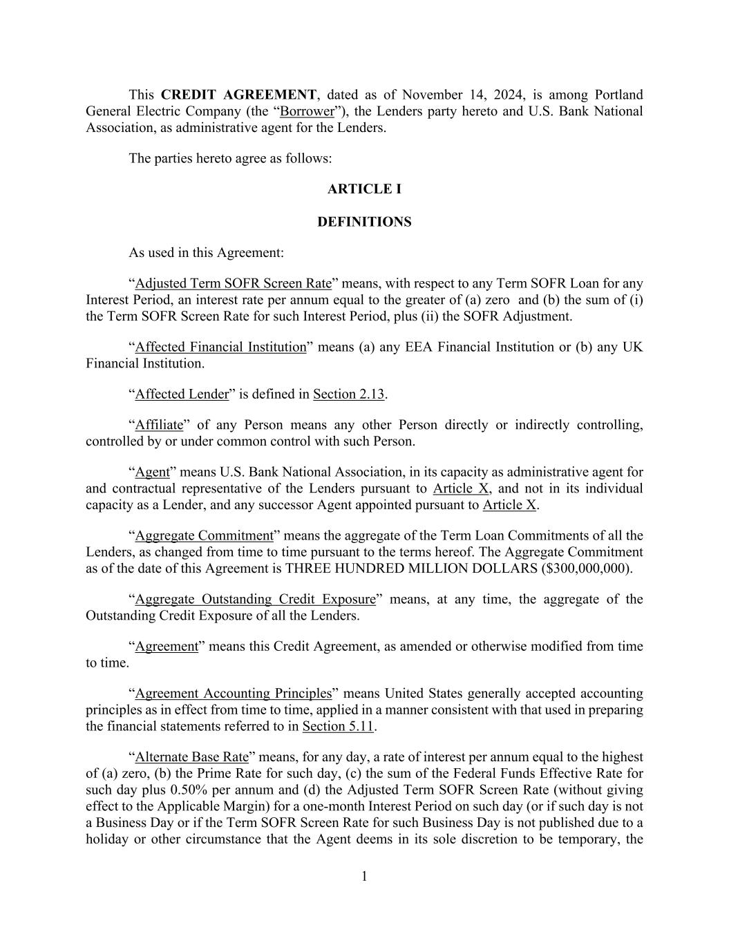 1 This CREDIT AGREEMENT, dated as of November 14, 2024, is among Portland General Electric Company (the “Borrower”), the Lenders party hereto and U.S. Bank National Association, as administrative agent for the Lenders. The parties hereto agree as follows: ARTICLE I DEFINITIONS As used in this Agreement: “Adjusted Term SOFR Screen Rate” means, with respect to any Term SOFR Loan for any Interest Period, an interest rate per annum equal to the greater of (a) zero and (b) the sum of (i) the Term SOFR Screen Rate for such Interest Period, plus (ii) the SOFR Adjustment. “Affected Financial Institution” means (a) any EEA Financial Institution or (b) any UK Financial Institution. “Affected Lender” is defined in Section 2.13. “Affiliate” of any Person means any other Person directly or indirectly controlling, controlled by or under common control with such Person. “Agent” means U.S. Bank National Association, in its capacity as administrative agent for and contractual representative of the Lenders pursuant to Article X, and not in its individual capacity as a Lender, and any successor Agent appointed pursuant to Article X. “Aggregate Commitment” means the aggregate of the Term Loan Commitments of all the Lenders, as changed from time to time pursuant to the terms hereof. The Aggregate Commitment as of the date of this Agreement is THREE HUNDRED MILLION DOLLARS ($300,000,000). “Aggregate Outstanding Credit Exposure” means, at any time, the aggregate of the Outstanding Credit Exposure of all the Lenders. “Agreement” means this Credit Agreement, as amended or otherwise modified from time to time. “Agreement Accounting Principles” means United States generally accepted accounting principles as in effect from time to time, applied in a manner consistent with that used in preparing the financial statements referred to in Section 5.11. “Alternate Base Rate” means, for any day, a rate of interest per annum equal to the highest of (a) zero, (b) the Prime Rate for such day, (c) the sum of the Federal Funds Effective Rate for such day plus 0.50% per annum and (d) the Adjusted Term SOFR Screen Rate (without giving effect to the Applicable Margin) for a one-month Interest Period on such day (or if such day is not a Business Day or if the Term SOFR Screen Rate for such Business Day is not published due to a holiday or other circumstance that the Agent deems in its sole discretion to be temporary, the