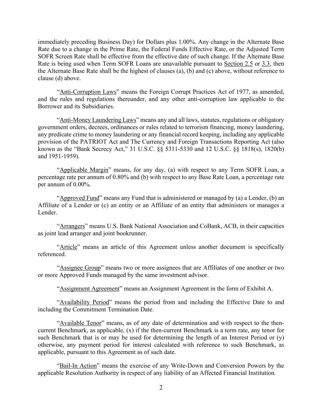 2 immediately preceding Business Day) for Dollars plus 1.00%. Any change in the Alternate Base Rate due to a change in the Prime Rate, the Federal Funds Effective Rate, or the Adjusted Term SOFR Screen Rate shall be effective from the effective date of such change. If the Alternate Base Rate is being used when Term SOFR Loans are unavailable pursuant to Section 2.5 or 3.3, then the Alternate Base Rate shall be the highest of clauses (a), (b) and (c) above, without reference to clause (d) above. “Anti-Corruption Laws” means the Foreign Corrupt Practices Act of 1977, as amended, and the rules and regulations thereunder, and any other anti-corruption law applicable to the Borrower and its Subsidiaries. “Anti-Money Laundering Laws” means any and all laws, statutes, regulations or obligatory government orders, decrees, ordinances or rules related to terrorism financing, money laundering, any predicate crime to money laundering or any financial record keeping, including any applicable provision of the PATRIOT Act and The Currency and Foreign Transactions Reporting Act (also known as the “Bank Secrecy Act,” 31 U.S.C. §§ 5311-5330 and 12 U.S.C. §§ 1818(s), 1820(b) and 1951-1959). “Applicable Margin” means, for any day, (a) with respect to any Term SOFR Loan, a percentage rate per annum of 0.80% and (b) with respect to any Base Rate Loan, a percentage rate per annum of 0.00%. “Approved Fund” means any Fund that is administered or managed by (a) a Lender, (b) an Affiliate of a Lender or (c) an entity or an Affiliate of an entity that administers or manages a Lender. “Arrangers” means U.S. Bank National Association and CoBank, ACB, in their capacities as joint lead arranger and joint bookrunner. “Article” means an article of this Agreement unless another document is specifically referenced. “Assignee Group” means two or more assignees that are Affiliates of one another or two or more Approved Funds managed by the same investment advisor. “Assignment Agreement” means an Assignment Agreement in the form of Exhibit A. “Availability Period” means the period from and including the Effective Date to and including the Commitment Termination Date. “Available Tenor” means, as of any date of determination and with respect to the then- current Benchmark, as applicable, (x) if the then-current Benchmark is a term rate, any tenor for such Benchmark that is or may be used for determining the length of an Interest Period or (y) otherwise, any payment period for interest calculated with reference to such Benchmark, as applicable, pursuant to this Agreement as of such date. “Bail-In Action” means the exercise of any Write-Down and Conversion Powers by the applicable Resolution Authority in respect of any liability of an Affected Financial Institution.