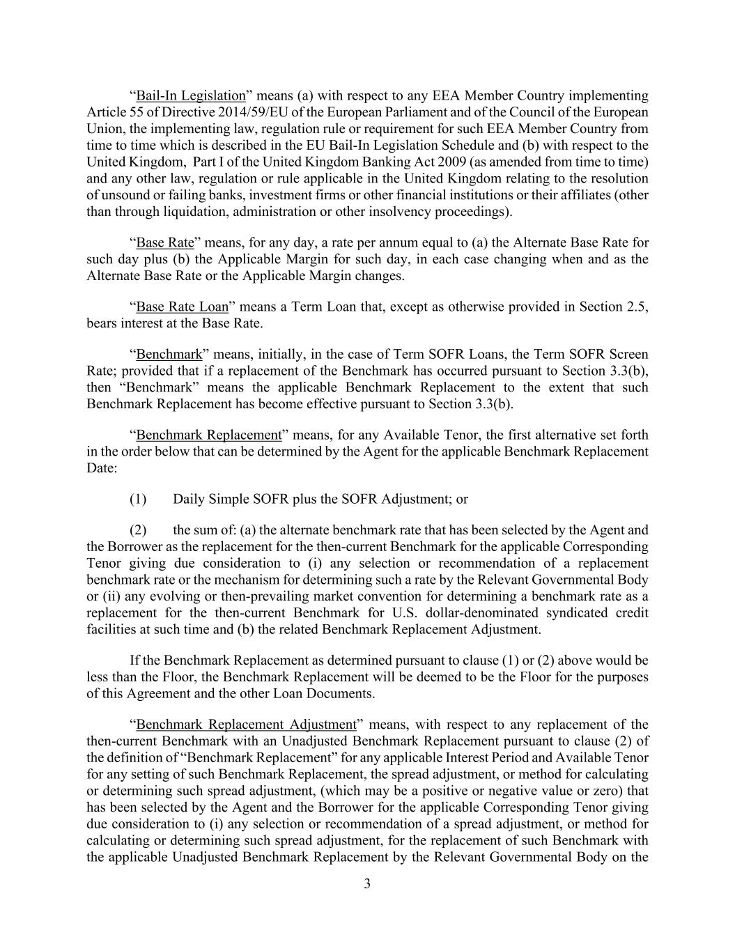 3 “Bail-In Legislation” means (a) with respect to any EEA Member Country implementing Article 55 of Directive 2014/59/EU of the European Parliament and of the Council of the European Union, the implementing law, regulation rule or requirement for such EEA Member Country from time to time which is described in the EU Bail-In Legislation Schedule and (b) with respect to the United Kingdom, Part I of the United Kingdom Banking Act 2009 (as amended from time to time) and any other law, regulation or rule applicable in the United Kingdom relating to the resolution of unsound or failing banks, investment firms or other financial institutions or their affiliates (other than through liquidation, administration or other insolvency proceedings). “Base Rate” means, for any day, a rate per annum equal to (a) the Alternate Base Rate for such day plus (b) the Applicable Margin for such day, in each case changing when and as the Alternate Base Rate or the Applicable Margin changes. “Base Rate Loan” means a Term Loan that, except as otherwise provided in Section 2.5, bears interest at the Base Rate. “Benchmark” means, initially, in the case of Term SOFR Loans, the Term SOFR Screen Rate; provided that if a replacement of the Benchmark has occurred pursuant to Section 3.3(b), then “Benchmark” means the applicable Benchmark Replacement to the extent that such Benchmark Replacement has become effective pursuant to Section 3.3(b). “Benchmark Replacement” means, for any Available Tenor, the first alternative set forth in the order below that can be determined by the Agent for the applicable Benchmark Replacement Date: (1) Daily Simple SOFR plus the SOFR Adjustment; or (2) the sum of: (a) the alternate benchmark rate that has been selected by the Agent and the Borrower as the replacement for the then-current Benchmark for the applicable Corresponding Tenor giving due consideration to (i) any selection or recommendation of a replacement benchmark rate or the mechanism for determining such a rate by the Relevant Governmental Body or (ii) any evolving or then-prevailing market convention for determining a benchmark rate as a replacement for the then-current Benchmark for U.S. dollar-denominated syndicated credit facilities at such time and (b) the related Benchmark Replacement Adjustment. If the Benchmark Replacement as determined pursuant to clause (1) or (2) above would be less than the Floor, the Benchmark Replacement will be deemed to be the Floor for the purposes of this Agreement and the other Loan Documents. “Benchmark Replacement Adjustment” means, with respect to any replacement of the then-current Benchmark with an Unadjusted Benchmark Replacement pursuant to clause (2) of the definition of “Benchmark Replacement” for any applicable Interest Period and Available Tenor for any setting of such Benchmark Replacement, the spread adjustment, or method for calculating or determining such spread adjustment, (which may be a positive or negative value or zero) that has been selected by the Agent and the Borrower for the applicable Corresponding Tenor giving due consideration to (i) any selection or recommendation of a spread adjustment, or method for calculating or determining such spread adjustment, for the replacement of such Benchmark with the applicable Unadjusted Benchmark Replacement by the Relevant Governmental Body on the