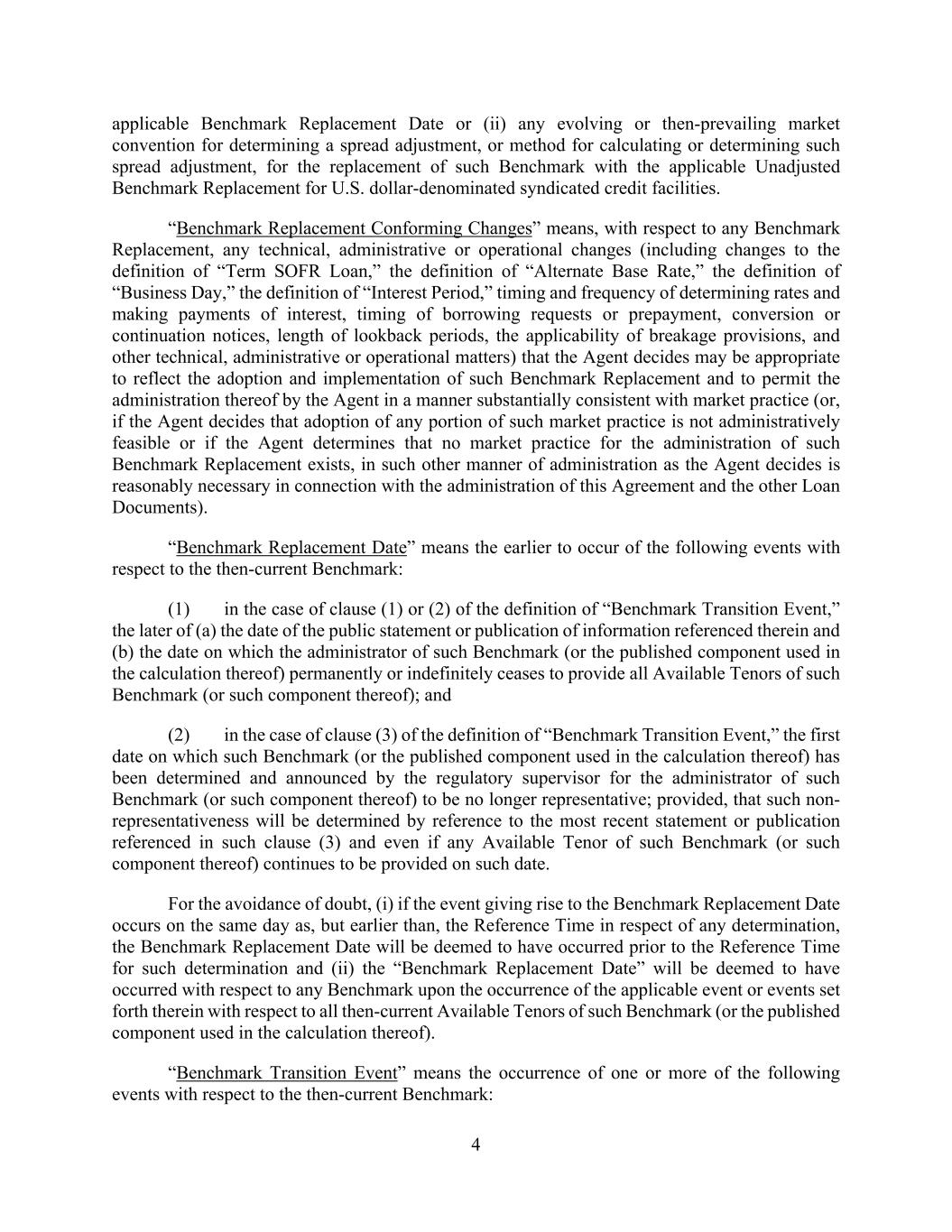 4 applicable Benchmark Replacement Date or (ii) any evolving or then-prevailing market convention for determining a spread adjustment, or method for calculating or determining such spread adjustment, for the replacement of such Benchmark with the applicable Unadjusted Benchmark Replacement for U.S. dollar-denominated syndicated credit facilities. “Benchmark Replacement Conforming Changes” means, with respect to any Benchmark Replacement, any technical, administrative or operational changes (including changes to the definition of “Term SOFR Loan,” the definition of “Alternate Base Rate,” the definition of “Business Day,” the definition of “Interest Period,” timing and frequency of determining rates and making payments of interest, timing of borrowing requests or prepayment, conversion or continuation notices, length of lookback periods, the applicability of breakage provisions, and other technical, administrative or operational matters) that the Agent decides may be appropriate to reflect the adoption and implementation of such Benchmark Replacement and to permit the administration thereof by the Agent in a manner substantially consistent with market practice (or, if the Agent decides that adoption of any portion of such market practice is not administratively feasible or if the Agent determines that no market practice for the administration of such Benchmark Replacement exists, in such other manner of administration as the Agent decides is reasonably necessary in connection with the administration of this Agreement and the other Loan Documents). “Benchmark Replacement Date” means the earlier to occur of the following events with respect to the then-current Benchmark: (1) in the case of clause (1) or (2) of the definition of “Benchmark Transition Event,” the later of (a) the date of the public statement or publication of information referenced therein and (b) the date on which the administrator of such Benchmark (or the published component used in the calculation thereof) permanently or indefinitely ceases to provide all Available Tenors of such Benchmark (or such component thereof); and (2) in the case of clause (3) of the definition of “Benchmark Transition Event,” the first date on which such Benchmark (or the published component used in the calculation thereof) has been determined and announced by the regulatory supervisor for the administrator of such Benchmark (or such component thereof) to be no longer representative; provided, that such non- representativeness will be determined by reference to the most recent statement or publication referenced in such clause (3) and even if any Available Tenor of such Benchmark (or such component thereof) continues to be provided on such date. For the avoidance of doubt, (i) if the event giving rise to the Benchmark Replacement Date occurs on the same day as, but earlier than, the Reference Time in respect of any determination, the Benchmark Replacement Date will be deemed to have occurred prior to the Reference Time for such determination and (ii) the “Benchmark Replacement Date” will be deemed to have occurred with respect to any Benchmark upon the occurrence of the applicable event or events set forth therein with respect to all then-current Available Tenors of such Benchmark (or the published component used in the calculation thereof). “Benchmark Transition Event” means the occurrence of one or more of the following events with respect to the then-current Benchmark: