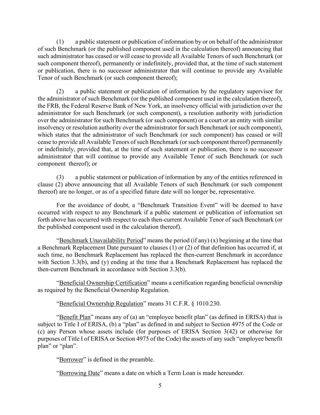 5 (1) a public statement or publication of information by or on behalf of the administrator of such Benchmark (or the published component used in the calculation thereof) announcing that such administrator has ceased or will cease to provide all Available Tenors of such Benchmark (or such component thereof), permanently or indefinitely, provided that, at the time of such statement or publication, there is no successor administrator that will continue to provide any Available Tenor of such Benchmark (or such component thereof); (2) a public statement or publication of information by the regulatory supervisor for the administrator of such Benchmark (or the published component used in the calculation thereof), the FRB, the Federal Reserve Bank of New York, an insolvency official with jurisdiction over the administrator for such Benchmark (or such component), a resolution authority with jurisdiction over the administrator for such Benchmark (or such component) or a court or an entity with similar insolvency or resolution authority over the administrator for such Benchmark (or such component), which states that the administrator of such Benchmark (or such component) has ceased or will cease to provide all Available Tenors of such Benchmark (or such component thereof) permanently or indefinitely, provided that, at the time of such statement or publication, there is no successor administrator that will continue to provide any Available Tenor of such Benchmark (or such component thereof); or (3) a public statement or publication of information by any of the entities referenced in clause (2) above announcing that all Available Tenors of such Benchmark (or such component thereof) are no longer, or as of a specified future date will no longer be, representative. For the avoidance of doubt, a “Benchmark Transition Event” will be deemed to have occurred with respect to any Benchmark if a public statement or publication of information set forth above has occurred with respect to each then-current Available Tenor of such Benchmark (or the published component used in the calculation thereof). “Benchmark Unavailability Period” means the period (if any) (x) beginning at the time that a Benchmark Replacement Date pursuant to clauses (1) or (2) of that definition has occurred if, at such time, no Benchmark Replacement has replaced the then-current Benchmark in accordance with Section 3.3(b), and (y) ending at the time that a Benchmark Replacement has replaced the then-current Benchmark in accordance with Section 3.3(b). “Beneficial Ownership Certification” means a certification regarding beneficial ownership as required by the Beneficial Ownership Regulation. “Beneficial Ownership Regulation” means 31 C.F.R. § 1010.230. “Benefit Plan” means any of (a) an “employee benefit plan” (as defined in ERISA) that is subject to Title I of ERISA, (b) a “plan” as defined in and subject to Section 4975 of the Code or (c) any Person whose assets include (for purposes of ERISA Section 3(42) or otherwise for purposes of Title I of ERISA or Section 4975 of the Code) the assets of any such “employee benefit plan” or “plan”. “Borrower” is defined in the preamble. “Borrowing Date” means a date on which a Term Loan is made hereunder.