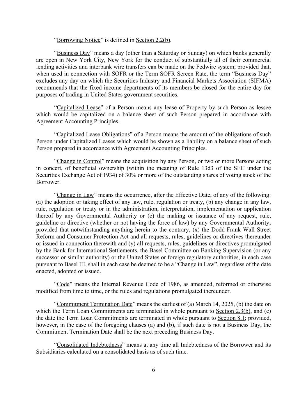6 “Borrowing Notice” is defined in Section 2.2(b). “Business Day” means a day (other than a Saturday or Sunday) on which banks generally are open in New York City, New York for the conduct of substantially all of their commercial lending activities and interbank wire transfers can be made on the Fedwire system; provided that, when used in connection with SOFR or the Term SOFR Screen Rate, the term “Business Day” excludes any day on which the Securities Industry and Financial Markets Association (SIFMA) recommends that the fixed income departments of its members be closed for the entire day for purposes of trading in United States government securities. “Capitalized Lease” of a Person means any lease of Property by such Person as lessee which would be capitalized on a balance sheet of such Person prepared in accordance with Agreement Accounting Principles. “Capitalized Lease Obligations” of a Person means the amount of the obligations of such Person under Capitalized Leases which would be shown as a liability on a balance sheet of such Person prepared in accordance with Agreement Accounting Principles. “Change in Control” means the acquisition by any Person, or two or more Persons acting in concert, of beneficial ownership (within the meaning of Rule 13d3 of the SEC under the Securities Exchange Act of 1934) of 30% or more of the outstanding shares of voting stock of the Borrower. “Change in Law” means the occurrence, after the Effective Date, of any of the following: (a) the adoption or taking effect of any law, rule, regulation or treaty, (b) any change in any law, rule, regulation or treaty or in the administration, interpretation, implementation or application thereof by any Governmental Authority or (c) the making or issuance of any request, rule, guideline or directive (whether or not having the force of law) by any Governmental Authority; provided that notwithstanding anything herein to the contrary, (x) the Dodd-Frank Wall Street Reform and Consumer Protection Act and all requests, rules, guidelines or directives thereunder or issued in connection therewith and (y) all requests, rules, guidelines or directives promulgated by the Bank for International Settlements, the Basel Committee on Banking Supervision (or any successor or similar authority) or the United States or foreign regulatory authorities, in each case pursuant to Basel III, shall in each case be deemed to be a “Change in Law”, regardless of the date enacted, adopted or issued. “Code” means the Internal Revenue Code of 1986, as amended, reformed or otherwise modified from time to time, or the rules and regulations promulgated thereunder. “Commitment Termination Date” means the earliest of (a) March 14, 2025, (b) the date on which the Term Loan Commitments are terminated in whole pursuant to Section 2.3(b), and (c) the date the Term Loan Commitments are terminated in whole pursuant to Section 8.1; provided, however, in the case of the foregoing clauses (a) and (b), if such date is not a Business Day, the Commitment Termination Date shall be the next preceding Business Day. “Consolidated Indebtedness” means at any time all Indebtedness of the Borrower and its Subsidiaries calculated on a consolidated basis as of such time.