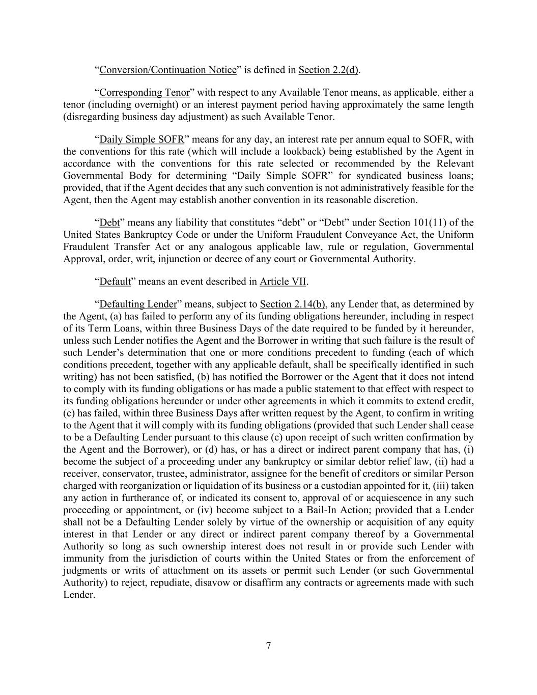 7 “Conversion/Continuation Notice” is defined in Section 2.2(d). “Corresponding Tenor” with respect to any Available Tenor means, as applicable, either a tenor (including overnight) or an interest payment period having approximately the same length (disregarding business day adjustment) as such Available Tenor. “Daily Simple SOFR” means for any day, an interest rate per annum equal to SOFR, with the conventions for this rate (which will include a lookback) being established by the Agent in accordance with the conventions for this rate selected or recommended by the Relevant Governmental Body for determining “Daily Simple SOFR” for syndicated business loans; provided, that if the Agent decides that any such convention is not administratively feasible for the Agent, then the Agent may establish another convention in its reasonable discretion. “Debt” means any liability that constitutes “debt” or “Debt” under Section 101(11) of the United States Bankruptcy Code or under the Uniform Fraudulent Conveyance Act, the Uniform Fraudulent Transfer Act or any analogous applicable law, rule or regulation, Governmental Approval, order, writ, injunction or decree of any court or Governmental Authority. “Default” means an event described in Article VII. “Defaulting Lender” means, subject to Section 2.14(b), any Lender that, as determined by the Agent, (a) has failed to perform any of its funding obligations hereunder, including in respect of its Term Loans, within three Business Days of the date required to be funded by it hereunder, unless such Lender notifies the Agent and the Borrower in writing that such failure is the result of such Lender’s determination that one or more conditions precedent to funding (each of which conditions precedent, together with any applicable default, shall be specifically identified in such writing) has not been satisfied, (b) has notified the Borrower or the Agent that it does not intend to comply with its funding obligations or has made a public statement to that effect with respect to its funding obligations hereunder or under other agreements in which it commits to extend credit, (c) has failed, within three Business Days after written request by the Agent, to confirm in writing to the Agent that it will comply with its funding obligations (provided that such Lender shall cease to be a Defaulting Lender pursuant to this clause (c) upon receipt of such written confirmation by the Agent and the Borrower), or (d) has, or has a direct or indirect parent company that has, (i) become the subject of a proceeding under any bankruptcy or similar debtor relief law, (ii) had a receiver, conservator, trustee, administrator, assignee for the benefit of creditors or similar Person charged with reorganization or liquidation of its business or a custodian appointed for it, (iii) taken any action in furtherance of, or indicated its consent to, approval of or acquiescence in any such proceeding or appointment, or (iv) become subject to a Bail-In Action; provided that a Lender shall not be a Defaulting Lender solely by virtue of the ownership or acquisition of any equity interest in that Lender or any direct or indirect parent company thereof by a Governmental Authority so long as such ownership interest does not result in or provide such Lender with immunity from the jurisdiction of courts within the United States or from the enforcement of judgments or writs of attachment on its assets or permit such Lender (or such Governmental Authority) to reject, repudiate, disavow or disaffirm any contracts or agreements made with such Lender.