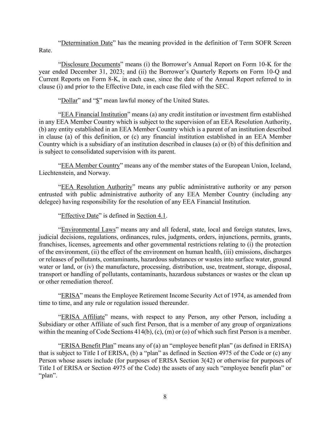 8 “Determination Date” has the meaning provided in the definition of Term SOFR Screen Rate. “Disclosure Documents” means (i) the Borrower’s Annual Report on Form 10-K for the year ended December 31, 2023; and (ii) the Borrower’s Quarterly Reports on Form 10-Q and Current Reports on Form 8-K, in each case, since the date of the Annual Report referred to in clause (i) and prior to the Effective Date, in each case filed with the SEC. “Dollar” and “$” mean lawful money of the United States. “EEA Financial Institution” means (a) any credit institution or investment firm established in any EEA Member Country which is subject to the supervision of an EEA Resolution Authority, (b) any entity established in an EEA Member Country which is a parent of an institution described in clause (a) of this definition, or (c) any financial institution established in an EEA Member Country which is a subsidiary of an institution described in clauses (a) or (b) of this definition and is subject to consolidated supervision with its parent. “EEA Member Country” means any of the member states of the European Union, Iceland, Liechtenstein, and Norway. “EEA Resolution Authority” means any public administrative authority or any person entrusted with public administrative authority of any EEA Member Country (including any delegee) having responsibility for the resolution of any EEA Financial Institution. “Effective Date” is defined in Section 4.1. “Environmental Laws” means any and all federal, state, local and foreign statutes, laws, judicial decisions, regulations, ordinances, rules, judgments, orders, injunctions, permits, grants, franchises, licenses, agreements and other governmental restrictions relating to (i) the protection of the environment, (ii) the effect of the environment on human health, (iii) emissions, discharges or releases of pollutants, contaminants, hazardous substances or wastes into surface water, ground water or land, or (iv) the manufacture, processing, distribution, use, treatment, storage, disposal, transport or handling of pollutants, contaminants, hazardous substances or wastes or the clean up or other remediation thereof. “ERISA” means the Employee Retirement Income Security Act of 1974, as amended from time to time, and any rule or regulation issued thereunder. “ERISA Affiliate” means, with respect to any Person, any other Person, including a Subsidiary or other Affiliate of such first Person, that is a member of any group of organizations within the meaning of Code Sections 414(b), (c), (m) or (o) of which such first Person is a member. “ERISA Benefit Plan” means any of (a) an “employee benefit plan” (as defined in ERISA) that is subject to Title I of ERISA, (b) a “plan” as defined in Section 4975 of the Code or (c) any Person whose assets include (for purposes of ERISA Section 3(42) or otherwise for purposes of Title I of ERISA or Section 4975 of the Code) the assets of any such “employee benefit plan” or “plan”.
