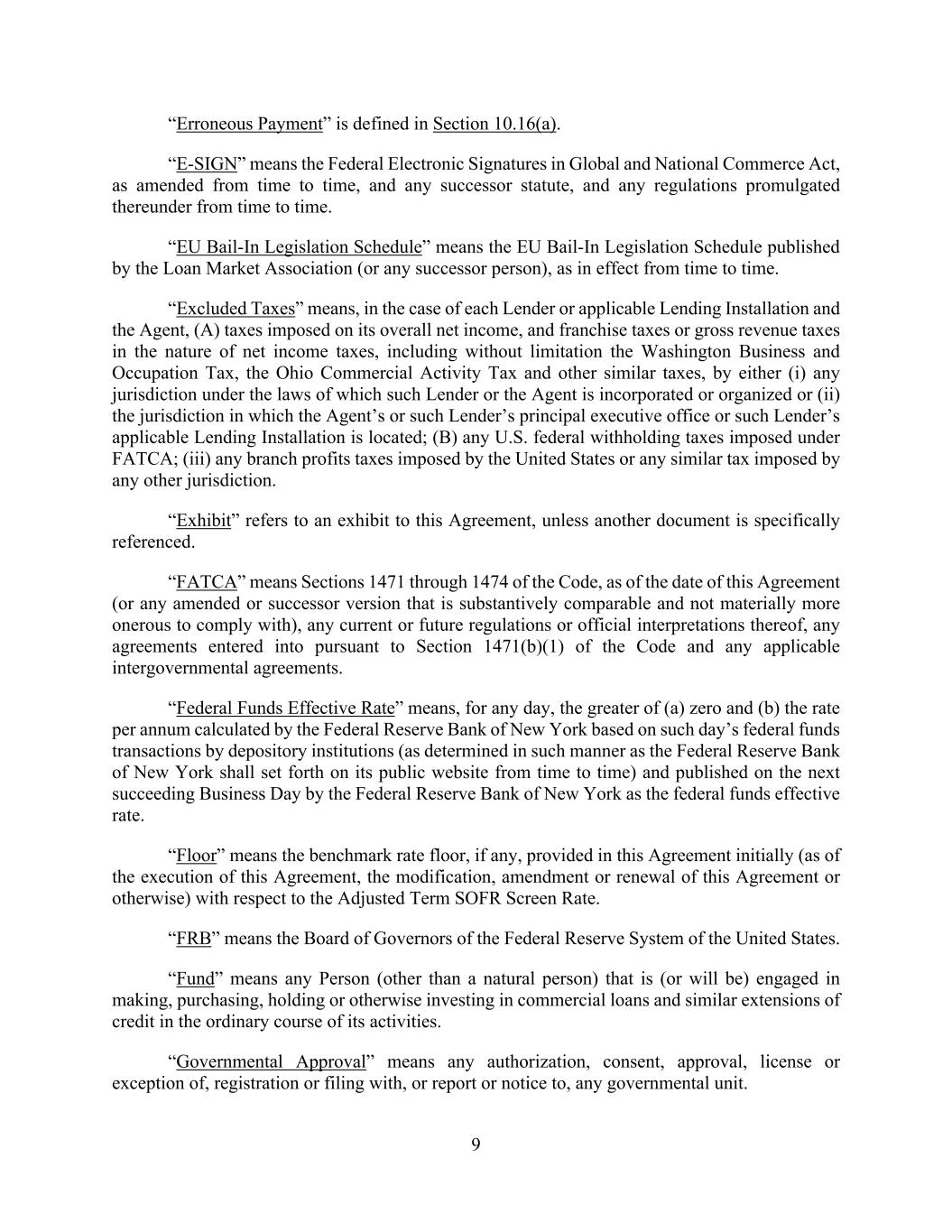 9 “Erroneous Payment” is defined in Section 10.16(a). “E-SIGN” means the Federal Electronic Signatures in Global and National Commerce Act, as amended from time to time, and any successor statute, and any regulations promulgated thereunder from time to time. “EU Bail-In Legislation Schedule” means the EU Bail-In Legislation Schedule published by the Loan Market Association (or any successor person), as in effect from time to time. “Excluded Taxes” means, in the case of each Lender or applicable Lending Installation and the Agent, (A) taxes imposed on its overall net income, and franchise taxes or gross revenue taxes in the nature of net income taxes, including without limitation the Washington Business and Occupation Tax, the Ohio Commercial Activity Tax and other similar taxes, by either (i) any jurisdiction under the laws of which such Lender or the Agent is incorporated or organized or (ii) the jurisdiction in which the Agent’s or such Lender’s principal executive office or such Lender’s applicable Lending Installation is located; (B) any U.S. federal withholding taxes imposed under FATCA; (iii) any branch profits taxes imposed by the United States or any similar tax imposed by any other jurisdiction. “Exhibit” refers to an exhibit to this Agreement, unless another document is specifically referenced. “FATCA” means Sections 1471 through 1474 of the Code, as of the date of this Agreement (or any amended or successor version that is substantively comparable and not materially more onerous to comply with), any current or future regulations or official interpretations thereof, any agreements entered into pursuant to Section 1471(b)(1) of the Code and any applicable intergovernmental agreements. “Federal Funds Effective Rate” means, for any day, the greater of (a) zero and (b) the rate per annum calculated by the Federal Reserve Bank of New York based on such day’s federal funds transactions by depository institutions (as determined in such manner as the Federal Reserve Bank of New York shall set forth on its public website from time to time) and published on the next succeeding Business Day by the Federal Reserve Bank of New York as the federal funds effective rate. “Floor” means the benchmark rate floor, if any, provided in this Agreement initially (as of the execution of this Agreement, the modification, amendment or renewal of this Agreement or otherwise) with respect to the Adjusted Term SOFR Screen Rate. “FRB” means the Board of Governors of the Federal Reserve System of the United States. “Fund” means any Person (other than a natural person) that is (or will be) engaged in making, purchasing, holding or otherwise investing in commercial loans and similar extensions of credit in the ordinary course of its activities. “Governmental Approval” means any authorization, consent, approval, license or exception of, registration or filing with, or report or notice to, any governmental unit.