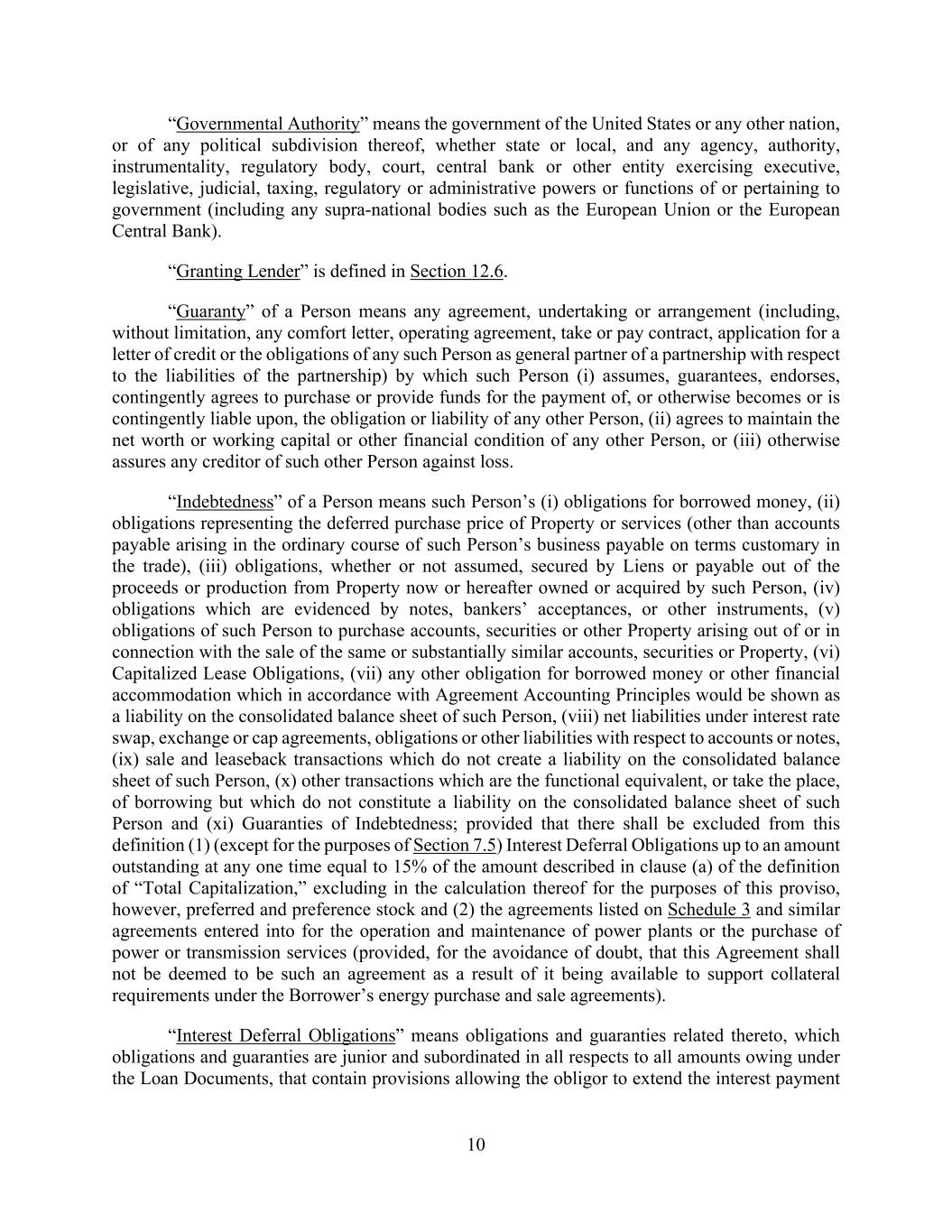 10 “Governmental Authority” means the government of the United States or any other nation, or of any political subdivision thereof, whether state or local, and any agency, authority, instrumentality, regulatory body, court, central bank or other entity exercising executive, legislative, judicial, taxing, regulatory or administrative powers or functions of or pertaining to government (including any supra-national bodies such as the European Union or the European Central Bank). “Granting Lender” is defined in Section 12.6. “Guaranty” of a Person means any agreement, undertaking or arrangement (including, without limitation, any comfort letter, operating agreement, take or pay contract, application for a letter of credit or the obligations of any such Person as general partner of a partnership with respect to the liabilities of the partnership) by which such Person (i) assumes, guarantees, endorses, contingently agrees to purchase or provide funds for the payment of, or otherwise becomes or is contingently liable upon, the obligation or liability of any other Person, (ii) agrees to maintain the net worth or working capital or other financial condition of any other Person, or (iii) otherwise assures any creditor of such other Person against loss. “Indebtedness” of a Person means such Person’s (i) obligations for borrowed money, (ii) obligations representing the deferred purchase price of Property or services (other than accounts payable arising in the ordinary course of such Person’s business payable on terms customary in the trade), (iii) obligations, whether or not assumed, secured by Liens or payable out of the proceeds or production from Property now or hereafter owned or acquired by such Person, (iv) obligations which are evidenced by notes, bankers’ acceptances, or other instruments, (v) obligations of such Person to purchase accounts, securities or other Property arising out of or in connection with the sale of the same or substantially similar accounts, securities or Property, (vi) Capitalized Lease Obligations, (vii) any other obligation for borrowed money or other financial accommodation which in accordance with Agreement Accounting Principles would be shown as a liability on the consolidated balance sheet of such Person, (viii) net liabilities under interest rate swap, exchange or cap agreements, obligations or other liabilities with respect to accounts or notes, (ix) sale and leaseback transactions which do not create a liability on the consolidated balance sheet of such Person, (x) other transactions which are the functional equivalent, or take the place, of borrowing but which do not constitute a liability on the consolidated balance sheet of such Person and (xi) Guaranties of Indebtedness; provided that there shall be excluded from this definition (1) (except for the purposes of Section 7.5) Interest Deferral Obligations up to an amount outstanding at any one time equal to 15% of the amount described in clause (a) of the definition of “Total Capitalization,” excluding in the calculation thereof for the purposes of this proviso, however, preferred and preference stock and (2) the agreements listed on Schedule 3 and similar agreements entered into for the operation and maintenance of power plants or the purchase of power or transmission services (provided, for the avoidance of doubt, that this Agreement shall not be deemed to be such an agreement as a result of it being available to support collateral requirements under the Borrower’s energy purchase and sale agreements). “Interest Deferral Obligations” means obligations and guaranties related thereto, which obligations and guaranties are junior and subordinated in all respects to all amounts owing under the Loan Documents, that contain provisions allowing the obligor to extend the interest payment