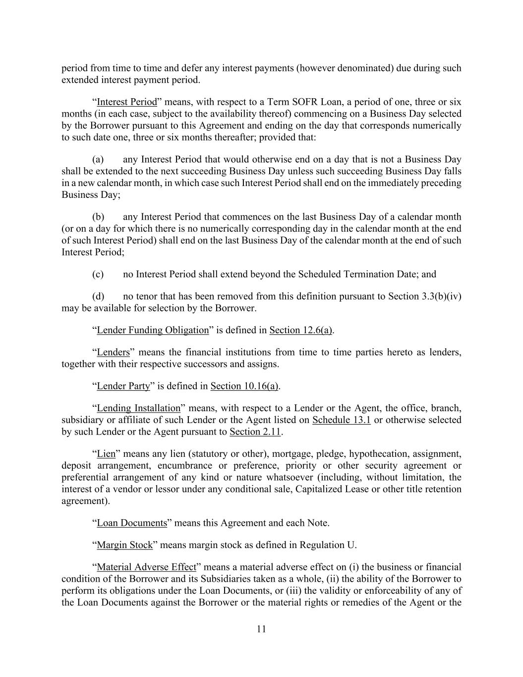 11 period from time to time and defer any interest payments (however denominated) due during such extended interest payment period. “Interest Period” means, with respect to a Term SOFR Loan, a period of one, three or six months (in each case, subject to the availability thereof) commencing on a Business Day selected by the Borrower pursuant to this Agreement and ending on the day that corresponds numerically to such date one, three or six months thereafter; provided that: (a) any Interest Period that would otherwise end on a day that is not a Business Day shall be extended to the next succeeding Business Day unless such succeeding Business Day falls in a new calendar month, in which case such Interest Period shall end on the immediately preceding Business Day; (b) any Interest Period that commences on the last Business Day of a calendar month (or on a day for which there is no numerically corresponding day in the calendar month at the end of such Interest Period) shall end on the last Business Day of the calendar month at the end of such Interest Period; (c) no Interest Period shall extend beyond the Scheduled Termination Date; and (d) no tenor that has been removed from this definition pursuant to Section 3.3(b)(iv) may be available for selection by the Borrower. “Lender Funding Obligation” is defined in Section 12.6(a). “Lenders” means the financial institutions from time to time parties hereto as lenders, together with their respective successors and assigns. “Lender Party” is defined in Section 10.16(a). “Lending Installation” means, with respect to a Lender or the Agent, the office, branch, subsidiary or affiliate of such Lender or the Agent listed on Schedule 13.1 or otherwise selected by such Lender or the Agent pursuant to Section 2.11. “Lien” means any lien (statutory or other), mortgage, pledge, hypothecation, assignment, deposit arrangement, encumbrance or preference, priority or other security agreement or preferential arrangement of any kind or nature whatsoever (including, without limitation, the interest of a vendor or lessor under any conditional sale, Capitalized Lease or other title retention agreement). “Loan Documents” means this Agreement and each Note. “Margin Stock” means margin stock as defined in Regulation U. “Material Adverse Effect” means a material adverse effect on (i) the business or financial condition of the Borrower and its Subsidiaries taken as a whole, (ii) the ability of the Borrower to perform its obligations under the Loan Documents, or (iii) the validity or enforceability of any of the Loan Documents against the Borrower or the material rights or remedies of the Agent or the