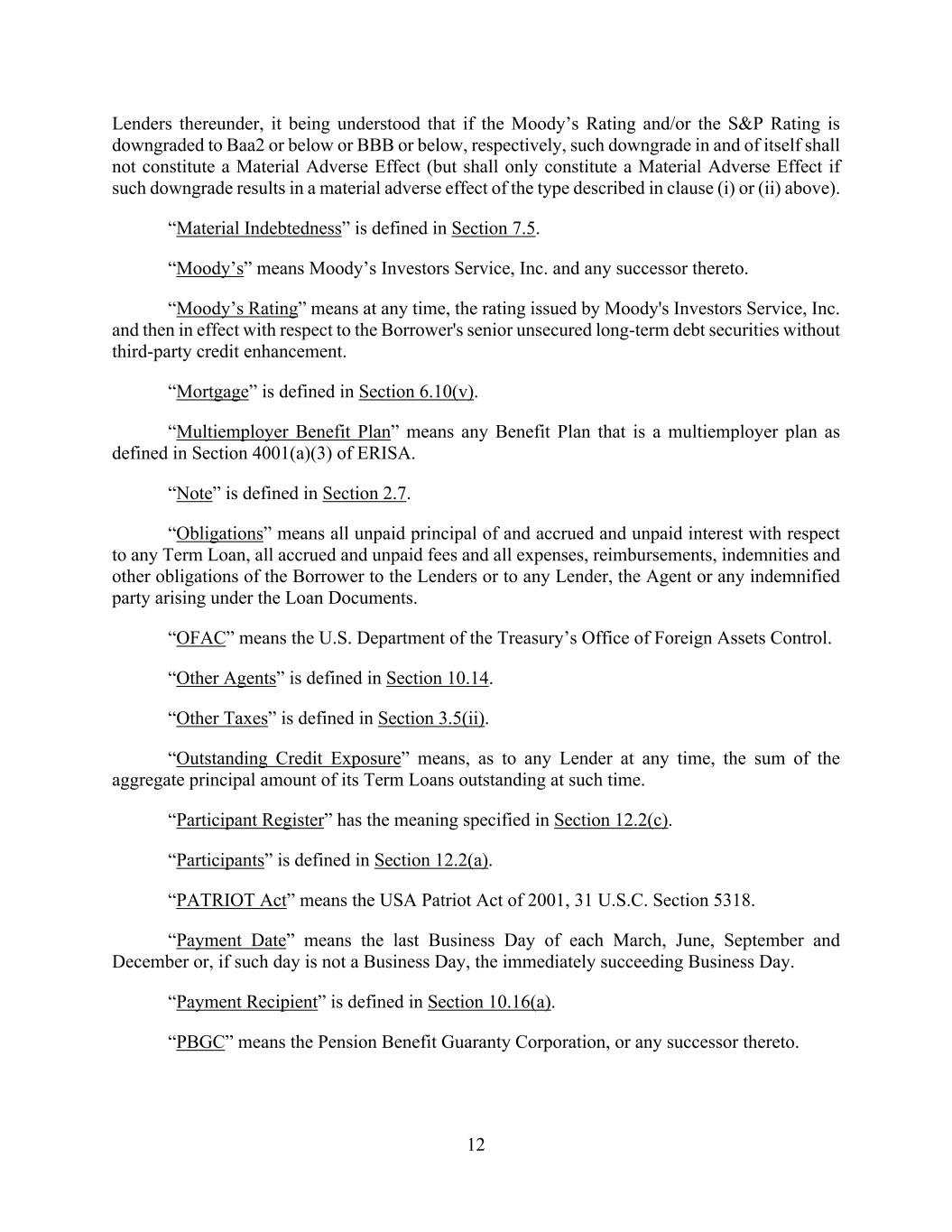 12 Lenders thereunder, it being understood that if the Moody’s Rating and/or the S&P Rating is downgraded to Baa2 or below or BBB or below, respectively, such downgrade in and of itself shall not constitute a Material Adverse Effect (but shall only constitute a Material Adverse Effect if such downgrade results in a material adverse effect of the type described in clause (i) or (ii) above). “Material Indebtedness” is defined in Section 7.5. “Moody’s” means Moody’s Investors Service, Inc. and any successor thereto. “Moody’s Rating” means at any time, the rating issued by Moody's Investors Service, Inc. and then in effect with respect to the Borrower's senior unsecured long-term debt securities without third-party credit enhancement. “Mortgage” is defined in Section 6.10(v). “Multiemployer Benefit Plan” means any Benefit Plan that is a multiemployer plan as defined in Section 4001(a)(3) of ERISA. “Note” is defined in Section 2.7. “Obligations” means all unpaid principal of and accrued and unpaid interest with respect to any Term Loan, all accrued and unpaid fees and all expenses, reimbursements, indemnities and other obligations of the Borrower to the Lenders or to any Lender, the Agent or any indemnified party arising under the Loan Documents. “OFAC” means the U.S. Department of the Treasury’s Office of Foreign Assets Control. “Other Agents” is defined in Section 10.14. “Other Taxes” is defined in Section 3.5(ii). “Outstanding Credit Exposure” means, as to any Lender at any time, the sum of the aggregate principal amount of its Term Loans outstanding at such time. “Participant Register” has the meaning specified in Section 12.2(c). “Participants” is defined in Section 12.2(a). “PATRIOT Act” means the USA Patriot Act of 2001, 31 U.S.C. Section 5318. “Payment Date” means the last Business Day of each March, June, September and December or, if such day is not a Business Day, the immediately succeeding Business Day. “Payment Recipient” is defined in Section 10.16(a). “PBGC” means the Pension Benefit Guaranty Corporation, or any successor thereto.