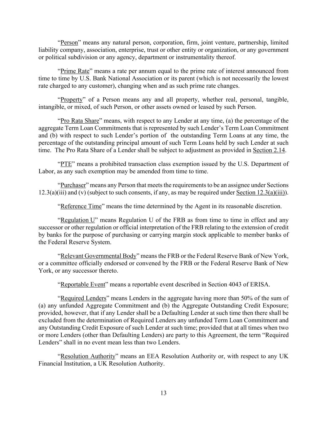 13 “Person” means any natural person, corporation, firm, joint venture, partnership, limited liability company, association, enterprise, trust or other entity or organization, or any government or political subdivision or any agency, department or instrumentality thereof. “Prime Rate” means a rate per annum equal to the prime rate of interest announced from time to time by U.S. Bank National Association or its parent (which is not necessarily the lowest rate charged to any customer), changing when and as such prime rate changes. “Property” of a Person means any and all property, whether real, personal, tangible, intangible, or mixed, of such Person, or other assets owned or leased by such Person. “Pro Rata Share” means, with respect to any Lender at any time, (a) the percentage of the aggregate Term Loan Commitments that is represented by such Lender’s Term Loan Commitment and (b) with respect to such Lender’s portion of the outstanding Term Loans at any time, the percentage of the outstanding principal amount of such Term Loans held by such Lender at such time. The Pro Rata Share of a Lender shall be subject to adjustment as provided in Section 2.14. “PTE” means a prohibited transaction class exemption issued by the U.S. Department of Labor, as any such exemption may be amended from time to time. “Purchaser” means any Person that meets the requirements to be an assignee under Sections 12.3(a)(iii) and (v) (subject to such consents, if any, as may be required under Section 12.3(a)(iii)). “Reference Time” means the time determined by the Agent in its reasonable discretion. “Regulation U” means Regulation U of the FRB as from time to time in effect and any successor or other regulation or official interpretation of the FRB relating to the extension of credit by banks for the purpose of purchasing or carrying margin stock applicable to member banks of the Federal Reserve System. “Relevant Governmental Body” means the FRB or the Federal Reserve Bank of New York, or a committee officially endorsed or convened by the FRB or the Federal Reserve Bank of New York, or any successor thereto. “Reportable Event” means a reportable event described in Section 4043 of ERISA. “Required Lenders” means Lenders in the aggregate having more than 50% of the sum of (a) any unfunded Aggregate Commitment and (b) the Aggregate Outstanding Credit Exposure; provided, however, that if any Lender shall be a Defaulting Lender at such time then there shall be excluded from the determination of Required Lenders any unfunded Term Loan Commitment and any Outstanding Credit Exposure of such Lender at such time; provided that at all times when two or more Lenders (other than Defaulting Lenders) are party to this Agreement, the term “Required Lenders” shall in no event mean less than two Lenders. “Resolution Authority” means an EEA Resolution Authority or, with respect to any UK Financial Institution, a UK Resolution Authority.