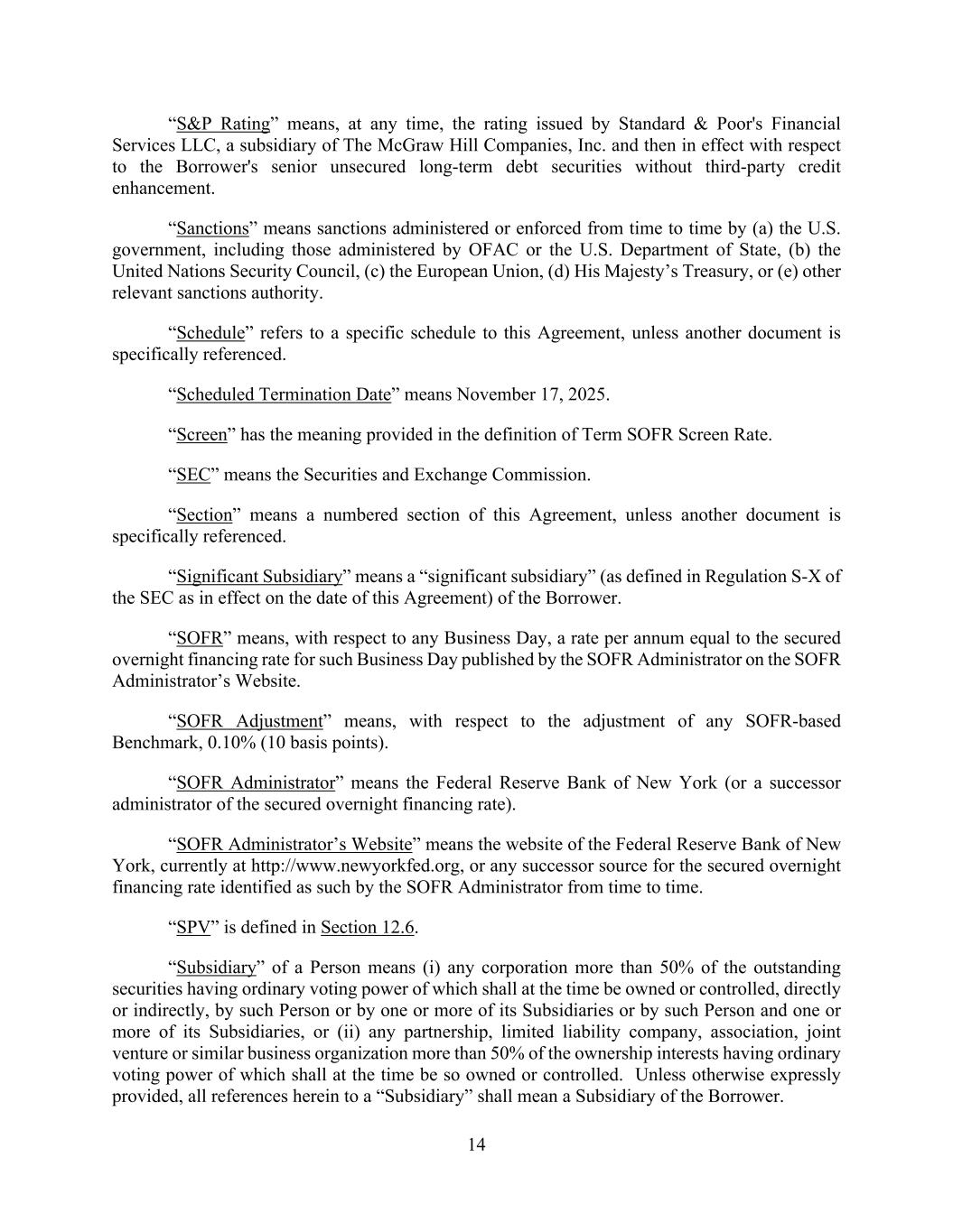 14 “S&P Rating” means, at any time, the rating issued by Standard & Poor's Financial Services LLC, a subsidiary of The McGraw Hill Companies, Inc. and then in effect with respect to the Borrower's senior unsecured long-term debt securities without third-party credit enhancement. “Sanctions” means sanctions administered or enforced from time to time by (a) the U.S. government, including those administered by OFAC or the U.S. Department of State, (b) the United Nations Security Council, (c) the European Union, (d) His Majesty’s Treasury, or (e) other relevant sanctions authority. “Schedule” refers to a specific schedule to this Agreement, unless another document is specifically referenced. “Scheduled Termination Date” means November 17, 2025. “Screen” has the meaning provided in the definition of Term SOFR Screen Rate. “SEC” means the Securities and Exchange Commission. “Section” means a numbered section of this Agreement, unless another document is specifically referenced. “Significant Subsidiary” means a “significant subsidiary” (as defined in Regulation S-X of the SEC as in effect on the date of this Agreement) of the Borrower. “SOFR” means, with respect to any Business Day, a rate per annum equal to the secured overnight financing rate for such Business Day published by the SOFR Administrator on the SOFR Administrator’s Website. “SOFR Adjustment” means, with respect to the adjustment of any SOFR-based Benchmark, 0.10% (10 basis points). “SOFR Administrator” means the Federal Reserve Bank of New York (or a successor administrator of the secured overnight financing rate). “SOFR Administrator’s Website” means the website of the Federal Reserve Bank of New York, currently at http://www.newyorkfed.org, or any successor source for the secured overnight financing rate identified as such by the SOFR Administrator from time to time. “SPV” is defined in Section 12.6. “Subsidiary” of a Person means (i) any corporation more than 50% of the outstanding securities having ordinary voting power of which shall at the time be owned or controlled, directly or indirectly, by such Person or by one or more of its Subsidiaries or by such Person and one or more of its Subsidiaries, or (ii) any partnership, limited liability company, association, joint venture or similar business organization more than 50% of the ownership interests having ordinary voting power of which shall at the time be so owned or controlled. Unless otherwise expressly provided, all references herein to a “Subsidiary” shall mean a Subsidiary of the Borrower.