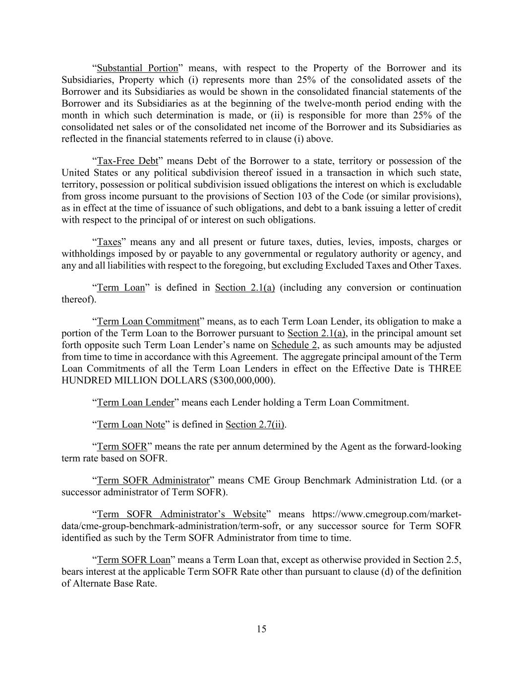 15 “Substantial Portion” means, with respect to the Property of the Borrower and its Subsidiaries, Property which (i) represents more than 25% of the consolidated assets of the Borrower and its Subsidiaries as would be shown in the consolidated financial statements of the Borrower and its Subsidiaries as at the beginning of the twelve-month period ending with the month in which such determination is made, or (ii) is responsible for more than 25% of the consolidated net sales or of the consolidated net income of the Borrower and its Subsidiaries as reflected in the financial statements referred to in clause (i) above. “Tax-Free Debt” means Debt of the Borrower to a state, territory or possession of the United States or any political subdivision thereof issued in a transaction in which such state, territory, possession or political subdivision issued obligations the interest on which is excludable from gross income pursuant to the provisions of Section 103 of the Code (or similar provisions), as in effect at the time of issuance of such obligations, and debt to a bank issuing a letter of credit with respect to the principal of or interest on such obligations. “Taxes” means any and all present or future taxes, duties, levies, imposts, charges or withholdings imposed by or payable to any governmental or regulatory authority or agency, and any and all liabilities with respect to the foregoing, but excluding Excluded Taxes and Other Taxes. “Term Loan” is defined in Section 2.1(a) (including any conversion or continuation thereof). “Term Loan Commitment” means, as to each Term Loan Lender, its obligation to make a portion of the Term Loan to the Borrower pursuant to Section 2.1(a), in the principal amount set forth opposite such Term Loan Lender’s name on Schedule 2, as such amounts may be adjusted from time to time in accordance with this Agreement. The aggregate principal amount of the Term Loan Commitments of all the Term Loan Lenders in effect on the Effective Date is THREE HUNDRED MILLION DOLLARS ($300,000,000). “Term Loan Lender” means each Lender holding a Term Loan Commitment. “Term Loan Note” is defined in Section 2.7(ii). “Term SOFR” means the rate per annum determined by the Agent as the forward-looking term rate based on SOFR. “Term SOFR Administrator” means CME Group Benchmark Administration Ltd. (or a successor administrator of Term SOFR). “Term SOFR Administrator’s Website” means https://www.cmegroup.com/market- data/cme-group-benchmark-administration/term-sofr, or any successor source for Term SOFR identified as such by the Term SOFR Administrator from time to time. “Term SOFR Loan” means a Term Loan that, except as otherwise provided in Section 2.5, bears interest at the applicable Term SOFR Rate other than pursuant to clause (d) of the definition of Alternate Base Rate.