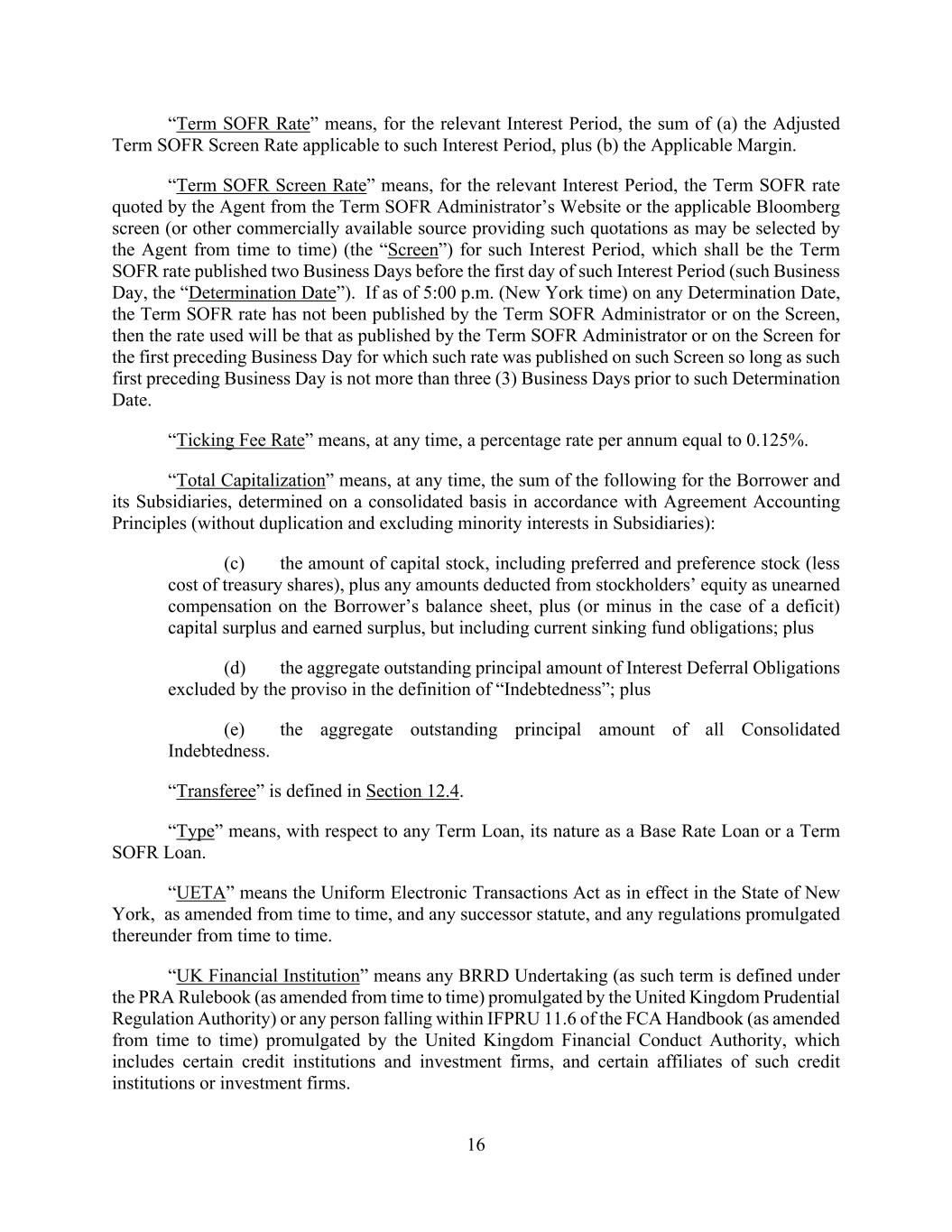 16 “Term SOFR Rate” means, for the relevant Interest Period, the sum of (a) the Adjusted Term SOFR Screen Rate applicable to such Interest Period, plus (b) the Applicable Margin. “Term SOFR Screen Rate” means, for the relevant Interest Period, the Term SOFR rate quoted by the Agent from the Term SOFR Administrator’s Website or the applicable Bloomberg screen (or other commercially available source providing such quotations as may be selected by the Agent from time to time) (the “Screen”) for such Interest Period, which shall be the Term SOFR rate published two Business Days before the first day of such Interest Period (such Business Day, the “Determination Date”). If as of 5:00 p.m. (New York time) on any Determination Date, the Term SOFR rate has not been published by the Term SOFR Administrator or on the Screen, then the rate used will be that as published by the Term SOFR Administrator or on the Screen for the first preceding Business Day for which such rate was published on such Screen so long as such first preceding Business Day is not more than three (3) Business Days prior to such Determination Date. “Ticking Fee Rate” means, at any time, a percentage rate per annum equal to 0.125%. “Total Capitalization” means, at any time, the sum of the following for the Borrower and its Subsidiaries, determined on a consolidated basis in accordance with Agreement Accounting Principles (without duplication and excluding minority interests in Subsidiaries): (c) the amount of capital stock, including preferred and preference stock (less cost of treasury shares), plus any amounts deducted from stockholders’ equity as unearned compensation on the Borrower’s balance sheet, plus (or minus in the case of a deficit) capital surplus and earned surplus, but including current sinking fund obligations; plus (d) the aggregate outstanding principal amount of Interest Deferral Obligations excluded by the proviso in the definition of “Indebtedness”; plus (e) the aggregate outstanding principal amount of all Consolidated Indebtedness. “Transferee” is defined in Section 12.4. “Type” means, with respect to any Term Loan, its nature as a Base Rate Loan or a Term SOFR Loan. “UETA” means the Uniform Electronic Transactions Act as in effect in the State of New York, as amended from time to time, and any successor statute, and any regulations promulgated thereunder from time to time. “UK Financial Institution” means any BRRD Undertaking (as such term is defined under the PRA Rulebook (as amended from time to time) promulgated by the United Kingdom Prudential Regulation Authority) or any person falling within IFPRU 11.6 of the FCA Handbook (as amended from time to time) promulgated by the United Kingdom Financial Conduct Authority, which includes certain credit institutions and investment firms, and certain affiliates of such credit institutions or investment firms.