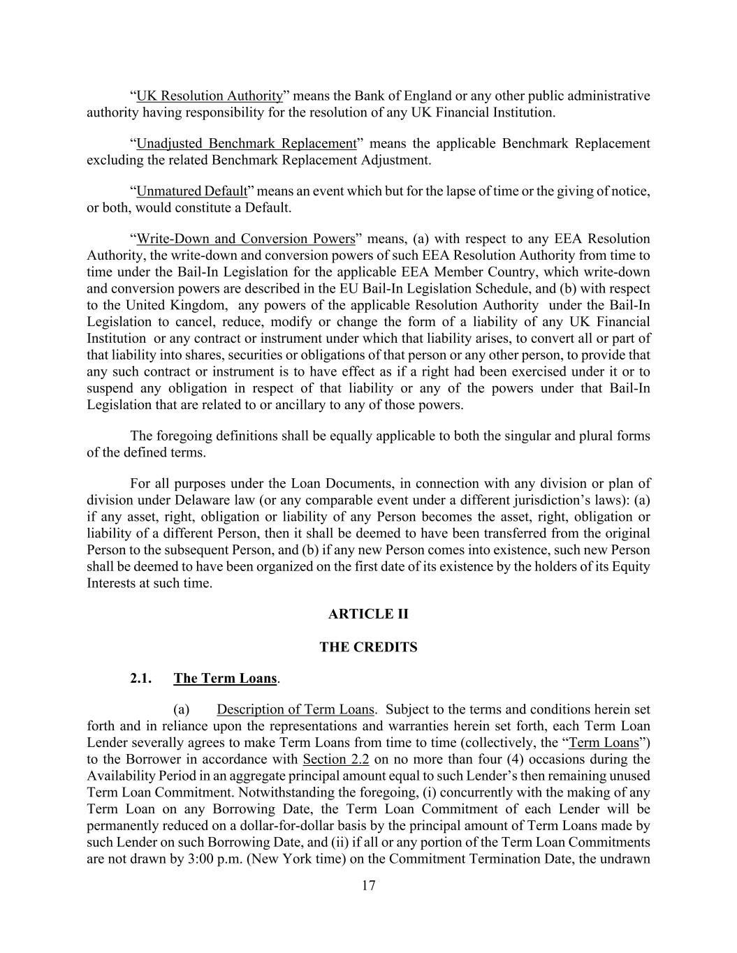 17 “UK Resolution Authority” means the Bank of England or any other public administrative authority having responsibility for the resolution of any UK Financial Institution. “Unadjusted Benchmark Replacement” means the applicable Benchmark Replacement excluding the related Benchmark Replacement Adjustment. “Unmatured Default” means an event which but for the lapse of time or the giving of notice, or both, would constitute a Default. “Write-Down and Conversion Powers” means, (a) with respect to any EEA Resolution Authority, the write-down and conversion powers of such EEA Resolution Authority from time to time under the Bail-In Legislation for the applicable EEA Member Country, which write-down and conversion powers are described in the EU Bail-In Legislation Schedule, and (b) with respect to the United Kingdom, any powers of the applicable Resolution Authority under the Bail-In Legislation to cancel, reduce, modify or change the form of a liability of any UK Financial Institution or any contract or instrument under which that liability arises, to convert all or part of that liability into shares, securities or obligations of that person or any other person, to provide that any such contract or instrument is to have effect as if a right had been exercised under it or to suspend any obligation in respect of that liability or any of the powers under that Bail-In Legislation that are related to or ancillary to any of those powers. The foregoing definitions shall be equally applicable to both the singular and plural forms of the defined terms. For all purposes under the Loan Documents, in connection with any division or plan of division under Delaware law (or any comparable event under a different jurisdiction’s laws): (a) if any asset, right, obligation or liability of any Person becomes the asset, right, obligation or liability of a different Person, then it shall be deemed to have been transferred from the original Person to the subsequent Person, and (b) if any new Person comes into existence, such new Person shall be deemed to have been organized on the first date of its existence by the holders of its Equity Interests at such time. ARTICLE II THE CREDITS 2.1. The Term Loans. (a) Description of Term Loans. Subject to the terms and conditions herein set forth and in reliance upon the representations and warranties herein set forth, each Term Loan Lender severally agrees to make Term Loans from time to time (collectively, the “Term Loans”) to the Borrower in accordance with Section 2.2 on no more than four (4) occasions during the Availability Period in an aggregate principal amount equal to such Lender’s then remaining unused Term Loan Commitment. Notwithstanding the foregoing, (i) concurrently with the making of any Term Loan on any Borrowing Date, the Term Loan Commitment of each Lender will be permanently reduced on a dollar-for-dollar basis by the principal amount of Term Loans made by such Lender on such Borrowing Date, and (ii) if all or any portion of the Term Loan Commitments are not drawn by 3:00 p.m. (New York time) on the Commitment Termination Date, the undrawn
