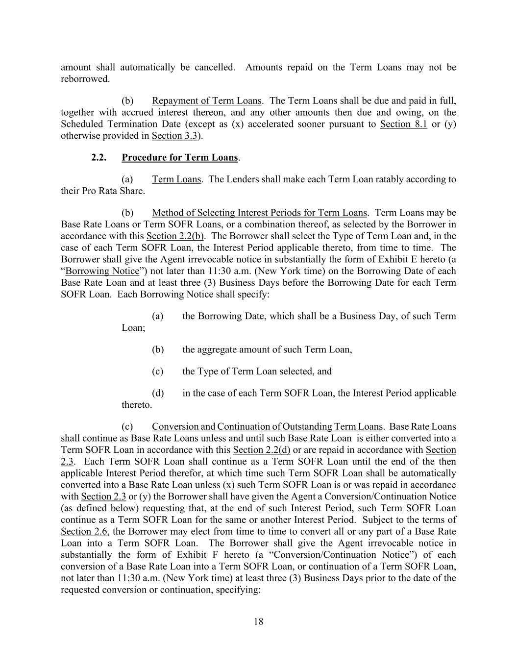 18 amount shall automatically be cancelled. Amounts repaid on the Term Loans may not be reborrowed. (b) Repayment of Term Loans. The Term Loans shall be due and paid in full, together with accrued interest thereon, and any other amounts then due and owing, on the Scheduled Termination Date (except as (x) accelerated sooner pursuant to Section 8.1 or (y) otherwise provided in Section 3.3). 2.2. Procedure for Term Loans. (a) Term Loans. The Lenders shall make each Term Loan ratably according to their Pro Rata Share. (b) Method of Selecting Interest Periods for Term Loans. Term Loans may be Base Rate Loans or Term SOFR Loans, or a combination thereof, as selected by the Borrower in accordance with this Section 2.2(b). The Borrower shall select the Type of Term Loan and, in the case of each Term SOFR Loan, the Interest Period applicable thereto, from time to time. The Borrower shall give the Agent irrevocable notice in substantially the form of Exhibit E hereto (a “Borrowing Notice”) not later than 11:30 a.m. (New York time) on the Borrowing Date of each Base Rate Loan and at least three (3) Business Days before the Borrowing Date for each Term SOFR Loan. Each Borrowing Notice shall specify: (a) the Borrowing Date, which shall be a Business Day, of such Term Loan; (b) the aggregate amount of such Term Loan, (c) the Type of Term Loan selected, and (d) in the case of each Term SOFR Loan, the Interest Period applicable thereto. (c) Conversion and Continuation of Outstanding Term Loans. Base Rate Loans shall continue as Base Rate Loans unless and until such Base Rate Loan is either converted into a Term SOFR Loan in accordance with this Section 2.2(d) or are repaid in accordance with Section 2.3. Each Term SOFR Loan shall continue as a Term SOFR Loan until the end of the then applicable Interest Period therefor, at which time such Term SOFR Loan shall be automatically converted into a Base Rate Loan unless (x) such Term SOFR Loan is or was repaid in accordance with Section 2.3 or (y) the Borrower shall have given the Agent a Conversion/Continuation Notice (as defined below) requesting that, at the end of such Interest Period, such Term SOFR Loan continue as a Term SOFR Loan for the same or another Interest Period. Subject to the terms of Section 2.6, the Borrower may elect from time to time to convert all or any part of a Base Rate Loan into a Term SOFR Loan. The Borrower shall give the Agent irrevocable notice in substantially the form of Exhibit F hereto (a “Conversion/Continuation Notice”) of each conversion of a Base Rate Loan into a Term SOFR Loan, or continuation of a Term SOFR Loan, not later than 11:30 a.m. (New York time) at least three (3) Business Days prior to the date of the requested conversion or continuation, specifying: