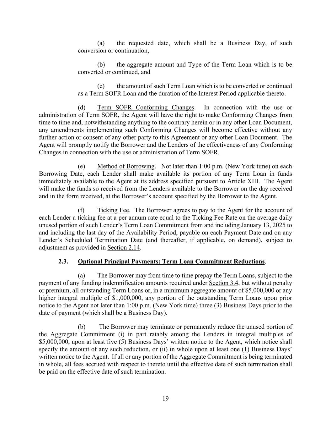 19 (a) the requested date, which shall be a Business Day, of such conversion or continuation, (b) the aggregate amount and Type of the Term Loan which is to be converted or continued, and (c) the amount of such Term Loan which is to be converted or continued as a Term SOFR Loan and the duration of the Interest Period applicable thereto. (d) Term SOFR Conforming Changes. In connection with the use or administration of Term SOFR, the Agent will have the right to make Conforming Changes from time to time and, notwithstanding anything to the contrary herein or in any other Loan Document, any amendments implementing such Conforming Changes will become effective without any further action or consent of any other party to this Agreement or any other Loan Document. The Agent will promptly notify the Borrower and the Lenders of the effectiveness of any Conforming Changes in connection with the use or administration of Term SOFR. (e) Method of Borrowing. Not later than 1:00 p.m. (New York time) on each Borrowing Date, each Lender shall make available its portion of any Term Loan in funds immediately available to the Agent at its address specified pursuant to Article XIII. The Agent will make the funds so received from the Lenders available to the Borrower on the day received and in the form received, at the Borrower’s account specified by the Borrower to the Agent. (f) Ticking Fee. The Borrower agrees to pay to the Agent for the account of each Lender a ticking fee at a per annum rate equal to the Ticking Fee Rate on the average daily unused portion of such Lender’s Term Loan Commitment from and including January 13, 2025 to and including the last day of the Availability Period, payable on each Payment Date and on any Lender’s Scheduled Termination Date (and thereafter, if applicable, on demand), subject to adjustment as provided in Section 2.14. 2.3. Optional Principal Payments; Term Loan Commitment Reductions. (a) The Borrower may from time to time prepay the Term Loans, subject to the payment of any funding indemnification amounts required under Section 3.4, but without penalty or premium, all outstanding Term Loans or, in a minimum aggregate amount of $5,000,000 or any higher integral multiple of $1,000,000, any portion of the outstanding Term Loans upon prior notice to the Agent not later than 1:00 p.m. (New York time) three (3) Business Days prior to the date of payment (which shall be a Business Day). (b) The Borrower may terminate or permanently reduce the unused portion of the Aggregate Commitment (i) in part ratably among the Lenders in integral multiples of $5,000,000, upon at least five (5) Business Days’ written notice to the Agent, which notice shall specify the amount of any such reduction, or (ii) in whole upon at least one (1) Business Days’ written notice to the Agent. If all or any portion of the Aggregate Commitment is being terminated in whole, all fees accrued with respect to thereto until the effective date of such termination shall be paid on the effective date of such termination.