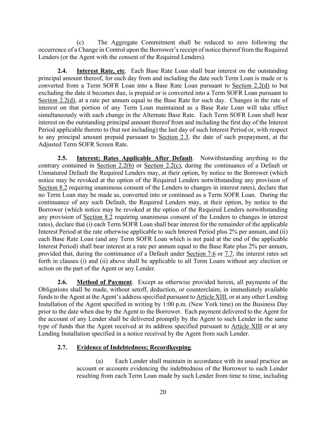 20 (c) The Aggregate Commitment shall be reduced to zero following the occurrence of a Change in Control upon the Borrower’s receipt of notice thereof from the Required Lenders (or the Agent with the consent of the Required Lenders). 2.4. Interest Rate, etc. Each Base Rate Loan shall bear interest on the outstanding principal amount thereof, for each day from and including the date such Term Loan is made or is converted from a Term SOFR Loan into a Base Rate Loan pursuant to Section 2.2(d) to but excluding the date it becomes due, is prepaid or is converted into a Term SOFR Loan pursuant to Section 2.2(d), at a rate per annum equal to the Base Rate for such day. Changes in the rate of interest on that portion of any Term Loan maintained as a Base Rate Loan will take effect simultaneously with each change in the Alternate Base Rate. Each Term SOFR Loan shall bear interest on the outstanding principal amount thereof from and including the first day of the Interest Period applicable thereto to (but not including) the last day of such Interest Period or, with respect to any principal amount prepaid pursuant to Section 2.3, the date of such prepayment, at the Adjusted Term SOFR Screen Rate. 2.5. Interest; Rates Applicable After Default. Notwithstanding anything to the contrary contained in Section 2.2(b) or Section 2.2(c), during the continuance of a Default or Unmatured Default the Required Lenders may, at their option, by notice to the Borrower (which notice may be revoked at the option of the Required Lenders notwithstanding any provision of Section 8.2 requiring unanimous consent of the Lenders to changes in interest rates), declare that no Term Loan may be made as, converted into or continued as a Term SOFR Loan. During the continuance of any such Default, the Required Lenders may, at their option, by notice to the Borrower (which notice may be revoked at the option of the Required Lenders notwithstanding any provision of Section 8.2 requiring unanimous consent of the Lenders to changes in interest rates), declare that (i) each Term SOFR Loan shall bear interest for the remainder of the applicable Interest Period at the rate otherwise applicable to such Interest Period plus 2% per annum, and (ii) each Base Rate Loan (and any Term SOFR Loan which is not paid at the end of the applicable Interest Period) shall bear interest at a rate per annum equal to the Base Rate plus 2% per annum, provided that, during the continuance of a Default under Section 7.6 or 7.7, the interest rates set forth in clauses (i) and (ii) above shall be applicable to all Term Loans without any election or action on the part of the Agent or any Lender. 2.6. Method of Payment. Except as otherwise provided herein, all payments of the Obligations shall be made, without setoff, deduction, or counterclaim, in immediately available funds to the Agent at the Agent’s address specified pursuant to Article XIII, or at any other Lending Installation of the Agent specified in writing by 1:00 p.m. (New York time) on the Business Day prior to the date when due by the Agent to the Borrower. Each payment delivered to the Agent for the account of any Lender shall be delivered promptly by the Agent to such Lender in the same type of funds that the Agent received at its address specified pursuant to Article XIII or at any Lending Installation specified in a notice received by the Agent from such Lender. 2.7. Evidence of Indebtedness; Recordkeeping. (a) Each Lender shall maintain in accordance with its usual practice an account or accounts evidencing the indebtedness of the Borrower to such Lender resulting from each Term Loan made by such Lender from time to time, including