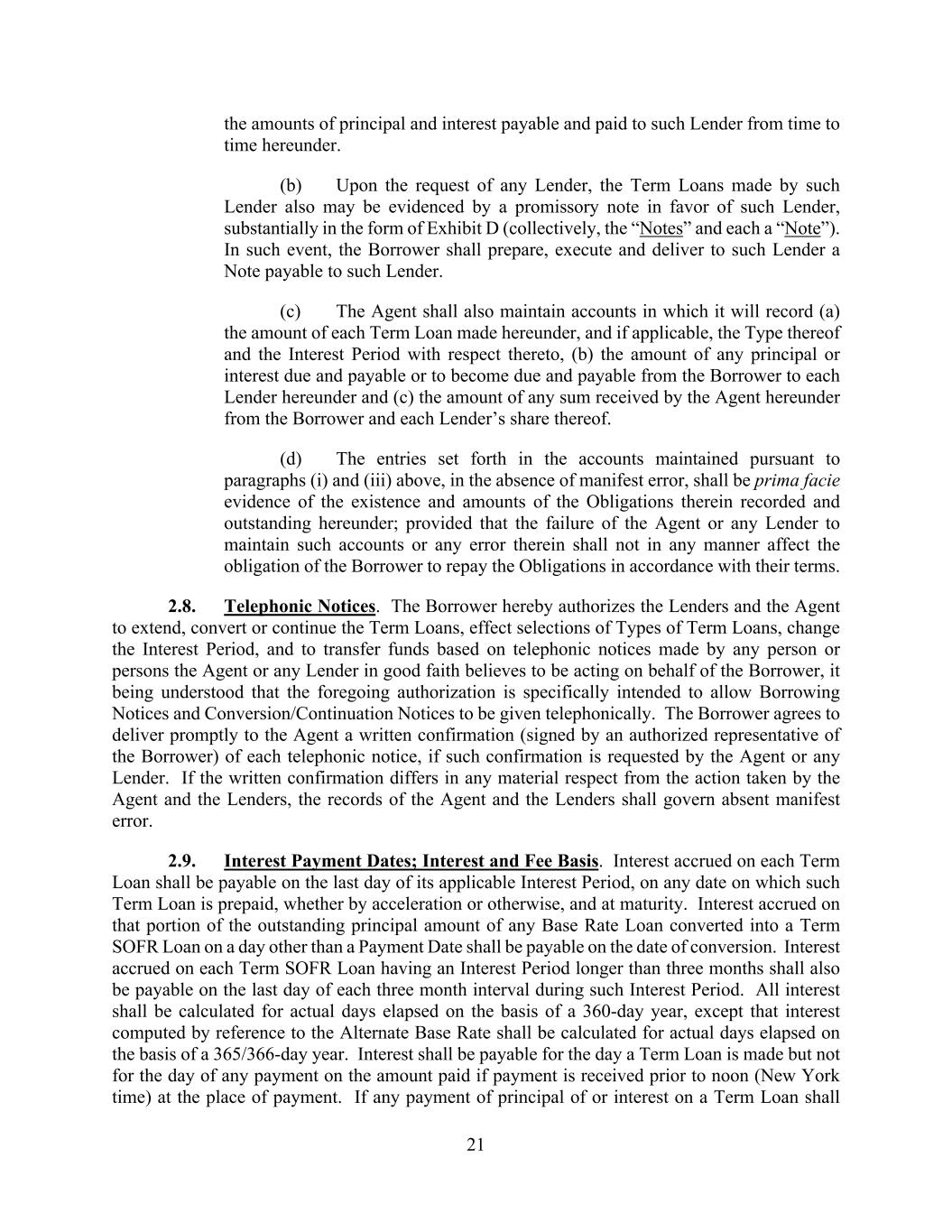 21 the amounts of principal and interest payable and paid to such Lender from time to time hereunder. (b) Upon the request of any Lender, the Term Loans made by such Lender also may be evidenced by a promissory note in favor of such Lender, substantially in the form of Exhibit D (collectively, the “Notes” and each a “Note”). In such event, the Borrower shall prepare, execute and deliver to such Lender a Note payable to such Lender. (c) The Agent shall also maintain accounts in which it will record (a) the amount of each Term Loan made hereunder, and if applicable, the Type thereof and the Interest Period with respect thereto, (b) the amount of any principal or interest due and payable or to become due and payable from the Borrower to each Lender hereunder and (c) the amount of any sum received by the Agent hereunder from the Borrower and each Lender’s share thereof. (d) The entries set forth in the accounts maintained pursuant to paragraphs (i) and (iii) above, in the absence of manifest error, shall be prima facie evidence of the existence and amounts of the Obligations therein recorded and outstanding hereunder; provided that the failure of the Agent or any Lender to maintain such accounts or any error therein shall not in any manner affect the obligation of the Borrower to repay the Obligations in accordance with their terms. 2.8. Telephonic Notices. The Borrower hereby authorizes the Lenders and the Agent to extend, convert or continue the Term Loans, effect selections of Types of Term Loans, change the Interest Period, and to transfer funds based on telephonic notices made by any person or persons the Agent or any Lender in good faith believes to be acting on behalf of the Borrower, it being understood that the foregoing authorization is specifically intended to allow Borrowing Notices and Conversion/Continuation Notices to be given telephonically. The Borrower agrees to deliver promptly to the Agent a written confirmation (signed by an authorized representative of the Borrower) of each telephonic notice, if such confirmation is requested by the Agent or any Lender. If the written confirmation differs in any material respect from the action taken by the Agent and the Lenders, the records of the Agent and the Lenders shall govern absent manifest error. 2.9. Interest Payment Dates; Interest and Fee Basis. Interest accrued on each Term Loan shall be payable on the last day of its applicable Interest Period, on any date on which such Term Loan is prepaid, whether by acceleration or otherwise, and at maturity. Interest accrued on that portion of the outstanding principal amount of any Base Rate Loan converted into a Term SOFR Loan on a day other than a Payment Date shall be payable on the date of conversion. Interest accrued on each Term SOFR Loan having an Interest Period longer than three months shall also be payable on the last day of each three month interval during such Interest Period. All interest shall be calculated for actual days elapsed on the basis of a 360-day year, except that interest computed by reference to the Alternate Base Rate shall be calculated for actual days elapsed on the basis of a 365/366-day year. Interest shall be payable for the day a Term Loan is made but not for the day of any payment on the amount paid if payment is received prior to noon (New York time) at the place of payment. If any payment of principal of or interest on a Term Loan shall