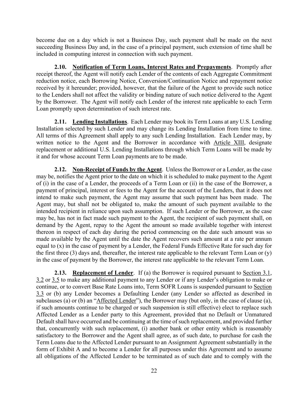 22 become due on a day which is not a Business Day, such payment shall be made on the next succeeding Business Day and, in the case of a principal payment, such extension of time shall be included in computing interest in connection with such payment. 2.10. Notification of Term Loans, Interest Rates and Prepayments. Promptly after receipt thereof, the Agent will notify each Lender of the contents of each Aggregate Commitment reduction notice, each Borrowing Notice, Conversion/Continuation Notice and repayment notice received by it hereunder; provided, however, that the failure of the Agent to provide such notice to the Lenders shall not affect the validity or binding nature of such notice delivered to the Agent by the Borrower. The Agent will notify each Lender of the interest rate applicable to each Term Loan promptly upon determination of such interest rate. 2.11. Lending Installations. Each Lender may book its Term Loans at any U.S. Lending Installation selected by such Lender and may change its Lending Installation from time to time. All terms of this Agreement shall apply to any such Lending Installation. Each Lender may, by written notice to the Agent and the Borrower in accordance with Article XIII, designate replacement or additional U.S. Lending Installations through which Term Loans will be made by it and for whose account Term Loan payments are to be made. 2.12. Non-Receipt of Funds by the Agent. Unless the Borrower or a Lender, as the case may be, notifies the Agent prior to the date on which it is scheduled to make payment to the Agent of (i) in the case of a Lender, the proceeds of a Term Loan or (ii) in the case of the Borrower, a payment of principal, interest or fees to the Agent for the account of the Lenders, that it does not intend to make such payment, the Agent may assume that such payment has been made. The Agent may, but shall not be obligated to, make the amount of such payment available to the intended recipient in reliance upon such assumption. If such Lender or the Borrower, as the case may be, has not in fact made such payment to the Agent, the recipient of such payment shall, on demand by the Agent, repay to the Agent the amount so made available together with interest thereon in respect of each day during the period commencing on the date such amount was so made available by the Agent until the date the Agent recovers such amount at a rate per annum equal to (x) in the case of payment by a Lender, the Federal Funds Effective Rate for such day for the first three (3) days and, thereafter, the interest rate applicable to the relevant Term Loan or (y) in the case of payment by the Borrower, the interest rate applicable to the relevant Term Loan. 2.13. Replacement of Lender. If (a) the Borrower is required pursuant to Section 3.1, 3.2 or 3.5 to make any additional payment to any Lender or if any Lender’s obligation to make or continue, or to convert Base Rate Loans into, Term SOFR Loans is suspended pursuant to Section 3.3 or (b) any Lender becomes a Defaulting Lender (any Lender so affected as described in subclauses (a) or (b) an “Affected Lender”), the Borrower may (but only, in the case of clause (a), if such amounts continue to be charged or such suspension is still effective) elect to replace such Affected Lender as a Lender party to this Agreement, provided that no Default or Unmatured Default shall have occurred and be continuing at the time of such replacement, and provided further that, concurrently with such replacement, (i) another bank or other entity which is reasonably satisfactory to the Borrower and the Agent shall agree, as of such date, to purchase for cash the Term Loans due to the Affected Lender pursuant to an Assignment Agreement substantially in the form of Exhibit A and to become a Lender for all purposes under this Agreement and to assume all obligations of the Affected Lender to be terminated as of such date and to comply with the