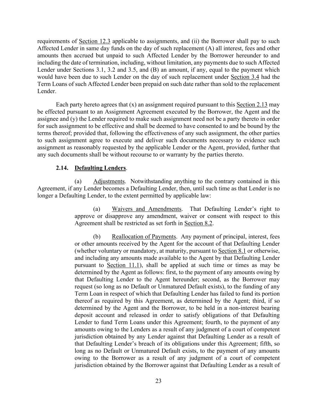 23 requirements of Section 12.3 applicable to assignments, and (ii) the Borrower shall pay to such Affected Lender in same day funds on the day of such replacement (A) all interest, fees and other amounts then accrued but unpaid to such Affected Lender by the Borrower hereunder to and including the date of termination, including, without limitation, any payments due to such Affected Lender under Sections 3.1, 3.2 and 3.5, and (B) an amount, if any, equal to the payment which would have been due to such Lender on the day of such replacement under Section 3.4 had the Term Loans of such Affected Lender been prepaid on such date rather than sold to the replacement Lender. Each party hereto agrees that (x) an assignment required pursuant to this Section 2.13 may be effected pursuant to an Assignment Agreement executed by the Borrower, the Agent and the assignee and (y) the Lender required to make such assignment need not be a party thereto in order for such assignment to be effective and shall be deemed to have consented to and be bound by the terms thereof; provided that, following the effectiveness of any such assignment, the other parties to such assignment agree to execute and deliver such documents necessary to evidence such assignment as reasonably requested by the applicable Lender or the Agent, provided, further that any such documents shall be without recourse to or warranty by the parties thereto. 2.14. Defaulting Lenders. (a) Adjustments. Notwithstanding anything to the contrary contained in this Agreement, if any Lender becomes a Defaulting Lender, then, until such time as that Lender is no longer a Defaulting Lender, to the extent permitted by applicable law: (a) Waivers and Amendments. That Defaulting Lender’s right to approve or disapprove any amendment, waiver or consent with respect to this Agreement shall be restricted as set forth in Section 8.2. (b) Reallocation of Payments. Any payment of principal, interest, fees or other amounts received by the Agent for the account of that Defaulting Lender (whether voluntary or mandatory, at maturity, pursuant to Section 8.1 or otherwise, and including any amounts made available to the Agent by that Defaulting Lender pursuant to Section 11.1), shall be applied at such time or times as may be determined by the Agent as follows: first, to the payment of any amounts owing by that Defaulting Lender to the Agent hereunder; second, as the Borrower may request (so long as no Default or Unmatured Default exists), to the funding of any Term Loan in respect of which that Defaulting Lender has failed to fund its portion thereof as required by this Agreement, as determined by the Agent; third, if so determined by the Agent and the Borrower, to be held in a non-interest bearing deposit account and released in order to satisfy obligations of that Defaulting Lender to fund Term Loans under this Agreement; fourth, to the payment of any amounts owing to the Lenders as a result of any judgment of a court of competent jurisdiction obtained by any Lender against that Defaulting Lender as a result of that Defaulting Lender’s breach of its obligations under this Agreement; fifth, so long as no Default or Unmatured Default exists, to the payment of any amounts owing to the Borrower as a result of any judgment of a court of competent jurisdiction obtained by the Borrower against that Defaulting Lender as a result of