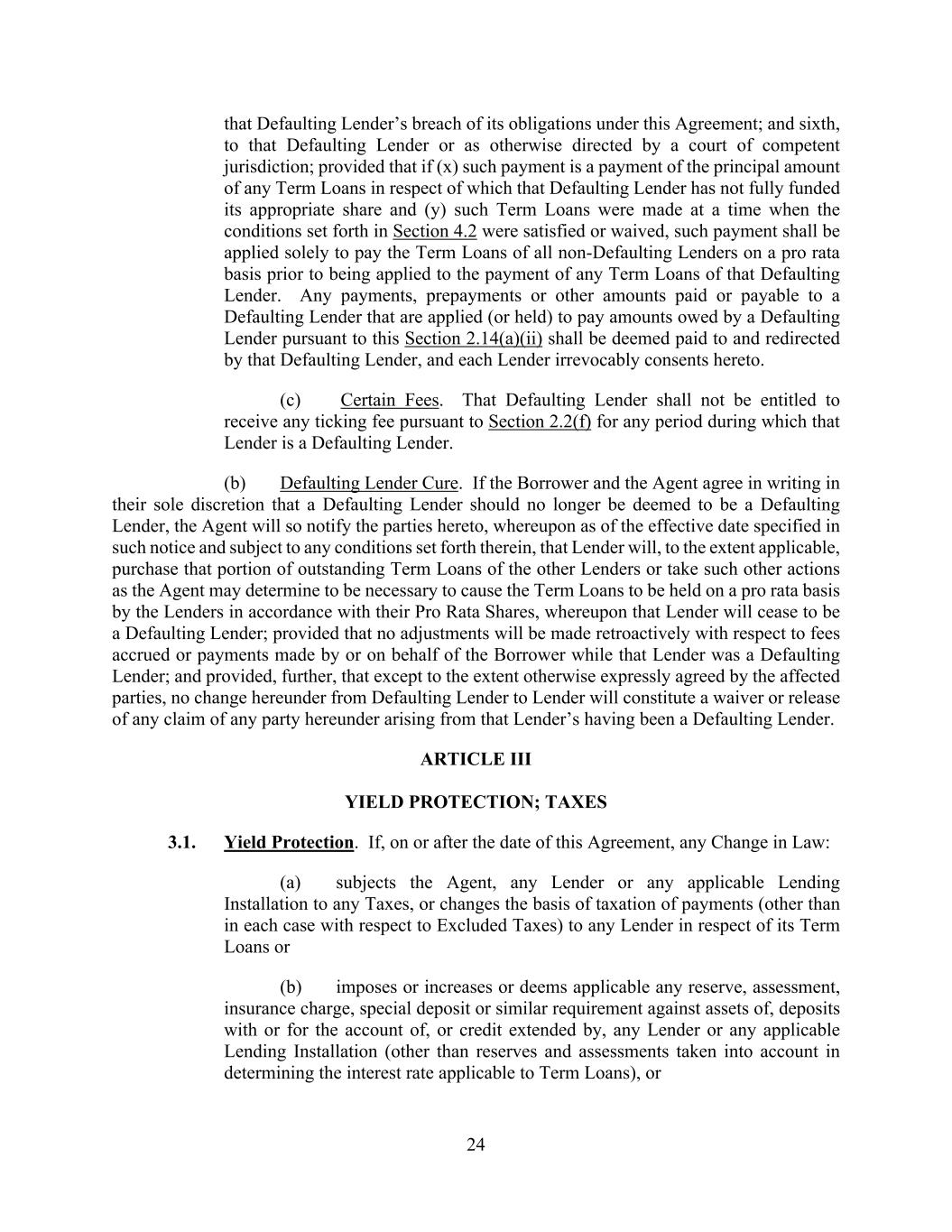 24 that Defaulting Lender’s breach of its obligations under this Agreement; and sixth, to that Defaulting Lender or as otherwise directed by a court of competent jurisdiction; provided that if (x) such payment is a payment of the principal amount of any Term Loans in respect of which that Defaulting Lender has not fully funded its appropriate share and (y) such Term Loans were made at a time when the conditions set forth in Section 4.2 were satisfied or waived, such payment shall be applied solely to pay the Term Loans of all non-Defaulting Lenders on a pro rata basis prior to being applied to the payment of any Term Loans of that Defaulting Lender. Any payments, prepayments or other amounts paid or payable to a Defaulting Lender that are applied (or held) to pay amounts owed by a Defaulting Lender pursuant to this Section 2.14(a)(ii) shall be deemed paid to and redirected by that Defaulting Lender, and each Lender irrevocably consents hereto. (c) Certain Fees. That Defaulting Lender shall not be entitled to receive any ticking fee pursuant to Section 2.2(f) for any period during which that Lender is a Defaulting Lender. (b) Defaulting Lender Cure. If the Borrower and the Agent agree in writing in their sole discretion that a Defaulting Lender should no longer be deemed to be a Defaulting Lender, the Agent will so notify the parties hereto, whereupon as of the effective date specified in such notice and subject to any conditions set forth therein, that Lender will, to the extent applicable, purchase that portion of outstanding Term Loans of the other Lenders or take such other actions as the Agent may determine to be necessary to cause the Term Loans to be held on a pro rata basis by the Lenders in accordance with their Pro Rata Shares, whereupon that Lender will cease to be a Defaulting Lender; provided that no adjustments will be made retroactively with respect to fees accrued or payments made by or on behalf of the Borrower while that Lender was a Defaulting Lender; and provided, further, that except to the extent otherwise expressly agreed by the affected parties, no change hereunder from Defaulting Lender to Lender will constitute a waiver or release of any claim of any party hereunder arising from that Lender’s having been a Defaulting Lender. ARTICLE III YIELD PROTECTION; TAXES 3.1. Yield Protection. If, on or after the date of this Agreement, any Change in Law: (a) subjects the Agent, any Lender or any applicable Lending Installation to any Taxes, or changes the basis of taxation of payments (other than in each case with respect to Excluded Taxes) to any Lender in respect of its Term Loans or (b) imposes or increases or deems applicable any reserve, assessment, insurance charge, special deposit or similar requirement against assets of, deposits with or for the account of, or credit extended by, any Lender or any applicable Lending Installation (other than reserves and assessments taken into account in determining the interest rate applicable to Term Loans), or