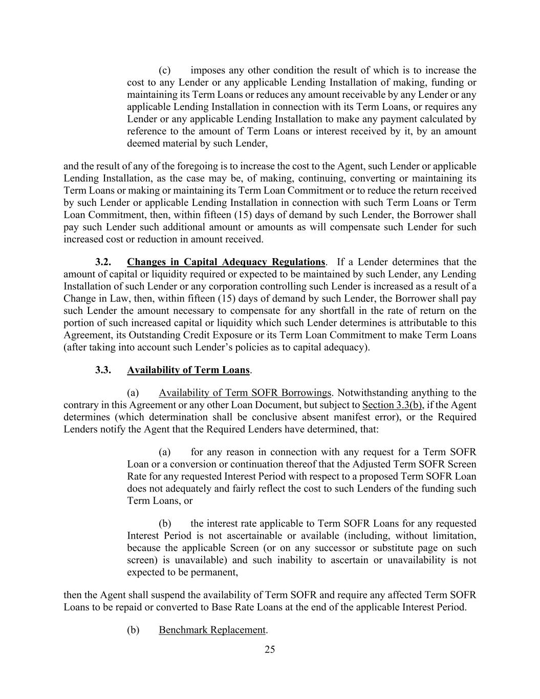 25 (c) imposes any other condition the result of which is to increase the cost to any Lender or any applicable Lending Installation of making, funding or maintaining its Term Loans or reduces any amount receivable by any Lender or any applicable Lending Installation in connection with its Term Loans, or requires any Lender or any applicable Lending Installation to make any payment calculated by reference to the amount of Term Loans or interest received by it, by an amount deemed material by such Lender, and the result of any of the foregoing is to increase the cost to the Agent, such Lender or applicable Lending Installation, as the case may be, of making, continuing, converting or maintaining its Term Loans or making or maintaining its Term Loan Commitment or to reduce the return received by such Lender or applicable Lending Installation in connection with such Term Loans or Term Loan Commitment, then, within fifteen (15) days of demand by such Lender, the Borrower shall pay such Lender such additional amount or amounts as will compensate such Lender for such increased cost or reduction in amount received. 3.2. Changes in Capital Adequacy Regulations. If a Lender determines that the amount of capital or liquidity required or expected to be maintained by such Lender, any Lending Installation of such Lender or any corporation controlling such Lender is increased as a result of a Change in Law, then, within fifteen (15) days of demand by such Lender, the Borrower shall pay such Lender the amount necessary to compensate for any shortfall in the rate of return on the portion of such increased capital or liquidity which such Lender determines is attributable to this Agreement, its Outstanding Credit Exposure or its Term Loan Commitment to make Term Loans (after taking into account such Lender’s policies as to capital adequacy). 3.3. Availability of Term Loans. (a) Availability of Term SOFR Borrowings. Notwithstanding anything to the contrary in this Agreement or any other Loan Document, but subject to Section 3.3(b), if the Agent determines (which determination shall be conclusive absent manifest error), or the Required Lenders notify the Agent that the Required Lenders have determined, that: (a) for any reason in connection with any request for a Term SOFR Loan or a conversion or continuation thereof that the Adjusted Term SOFR Screen Rate for any requested Interest Period with respect to a proposed Term SOFR Loan does not adequately and fairly reflect the cost to such Lenders of the funding such Term Loans, or (b) the interest rate applicable to Term SOFR Loans for any requested Interest Period is not ascertainable or available (including, without limitation, because the applicable Screen (or on any successor or substitute page on such screen) is unavailable) and such inability to ascertain or unavailability is not expected to be permanent, then the Agent shall suspend the availability of Term SOFR and require any affected Term SOFR Loans to be repaid or converted to Base Rate Loans at the end of the applicable Interest Period. (b) Benchmark Replacement.