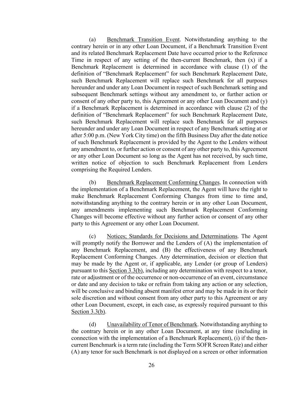 26 (a) Benchmark Transition Event. Notwithstanding anything to the contrary herein or in any other Loan Document, if a Benchmark Transition Event and its related Benchmark Replacement Date have occurred prior to the Reference Time in respect of any setting of the then-current Benchmark, then (x) if a Benchmark Replacement is determined in accordance with clause (1) of the definition of “Benchmark Replacement” for such Benchmark Replacement Date, such Benchmark Replacement will replace such Benchmark for all purposes hereunder and under any Loan Document in respect of such Benchmark setting and subsequent Benchmark settings without any amendment to, or further action or consent of any other party to, this Agreement or any other Loan Document and (y) if a Benchmark Replacement is determined in accordance with clause (2) of the definition of “Benchmark Replacement” for such Benchmark Replacement Date, such Benchmark Replacement will replace such Benchmark for all purposes hereunder and under any Loan Document in respect of any Benchmark setting at or after 5:00 p.m. (New York City time) on the fifth Business Day after the date notice of such Benchmark Replacement is provided by the Agent to the Lenders without any amendment to, or further action or consent of any other party to, this Agreement or any other Loan Document so long as the Agent has not received, by such time, written notice of objection to such Benchmark Replacement from Lenders comprising the Required Lenders. (b) Benchmark Replacement Conforming Changes. In connection with the implementation of a Benchmark Replacement, the Agent will have the right to make Benchmark Replacement Conforming Changes from time to time and, notwithstanding anything to the contrary herein or in any other Loan Document, any amendments implementing such Benchmark Replacement Conforming Changes will become effective without any further action or consent of any other party to this Agreement or any other Loan Document. (c) Notices; Standards for Decisions and Determinations. The Agent will promptly notify the Borrower and the Lenders of (A) the implementation of any Benchmark Replacement, and (B) the effectiveness of any Benchmark Replacement Conforming Changes. Any determination, decision or election that may be made by the Agent or, if applicable, any Lender (or group of Lenders) pursuant to this Section 3.3(b), including any determination with respect to a tenor, rate or adjustment or of the occurrence or non-occurrence of an event, circumstance or date and any decision to take or refrain from taking any action or any selection, will be conclusive and binding absent manifest error and may be made in its or their sole discretion and without consent from any other party to this Agreement or any other Loan Document, except, in each case, as expressly required pursuant to this Section 3.3(b). (d) Unavailability of Tenor of Benchmark. Notwithstanding anything to the contrary herein or in any other Loan Document, at any time (including in connection with the implementation of a Benchmark Replacement), (i) if the then- current Benchmark is a term rate (including the Term SOFR Screen Rate) and either (A) any tenor for such Benchmark is not displayed on a screen or other information