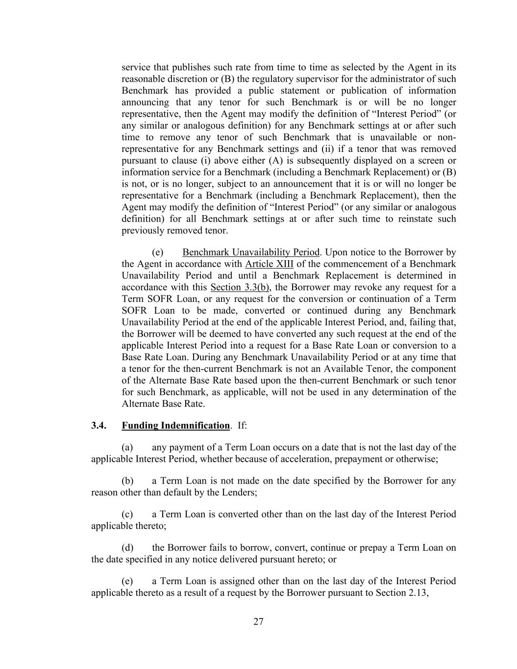 27 service that publishes such rate from time to time as selected by the Agent in its reasonable discretion or (B) the regulatory supervisor for the administrator of such Benchmark has provided a public statement or publication of information announcing that any tenor for such Benchmark is or will be no longer representative, then the Agent may modify the definition of “Interest Period” (or any similar or analogous definition) for any Benchmark settings at or after such time to remove any tenor of such Benchmark that is unavailable or non- representative for any Benchmark settings and (ii) if a tenor that was removed pursuant to clause (i) above either (A) is subsequently displayed on a screen or information service for a Benchmark (including a Benchmark Replacement) or (B) is not, or is no longer, subject to an announcement that it is or will no longer be representative for a Benchmark (including a Benchmark Replacement), then the Agent may modify the definition of “Interest Period” (or any similar or analogous definition) for all Benchmark settings at or after such time to reinstate such previously removed tenor. (e) Benchmark Unavailability Period. Upon notice to the Borrower by the Agent in accordance with Article XIII of the commencement of a Benchmark Unavailability Period and until a Benchmark Replacement is determined in accordance with this Section 3.3(b), the Borrower may revoke any request for a Term SOFR Loan, or any request for the conversion or continuation of a Term SOFR Loan to be made, converted or continued during any Benchmark Unavailability Period at the end of the applicable Interest Period, and, failing that, the Borrower will be deemed to have converted any such request at the end of the applicable Interest Period into a request for a Base Rate Loan or conversion to a Base Rate Loan. During any Benchmark Unavailability Period or at any time that a tenor for the then-current Benchmark is not an Available Tenor, the component of the Alternate Base Rate based upon the then-current Benchmark or such tenor for such Benchmark, as applicable, will not be used in any determination of the Alternate Base Rate. 3.4. Funding Indemnification. If: (a) any payment of a Term Loan occurs on a date that is not the last day of the applicable Interest Period, whether because of acceleration, prepayment or otherwise; (b) a Term Loan is not made on the date specified by the Borrower for any reason other than default by the Lenders; (c) a Term Loan is converted other than on the last day of the Interest Period applicable thereto; (d) the Borrower fails to borrow, convert, continue or prepay a Term Loan on the date specified in any notice delivered pursuant hereto; or (e) a Term Loan is assigned other than on the last day of the Interest Period applicable thereto as a result of a request by the Borrower pursuant to Section 2.13,