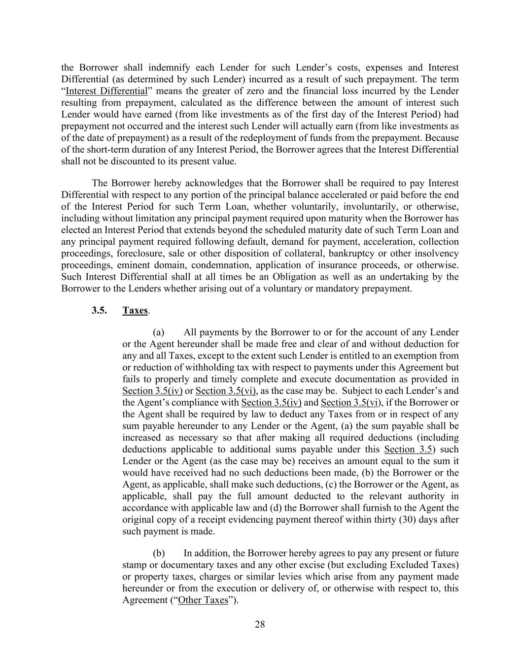 28 the Borrower shall indemnify each Lender for such Lender’s costs, expenses and Interest Differential (as determined by such Lender) incurred as a result of such prepayment. The term “Interest Differential” means the greater of zero and the financial loss incurred by the Lender resulting from prepayment, calculated as the difference between the amount of interest such Lender would have earned (from like investments as of the first day of the Interest Period) had prepayment not occurred and the interest such Lender will actually earn (from like investments as of the date of prepayment) as a result of the redeployment of funds from the prepayment. Because of the short-term duration of any Interest Period, the Borrower agrees that the Interest Differential shall not be discounted to its present value. The Borrower hereby acknowledges that the Borrower shall be required to pay Interest Differential with respect to any portion of the principal balance accelerated or paid before the end of the Interest Period for such Term Loan, whether voluntarily, involuntarily, or otherwise, including without limitation any principal payment required upon maturity when the Borrower has elected an Interest Period that extends beyond the scheduled maturity date of such Term Loan and any principal payment required following default, demand for payment, acceleration, collection proceedings, foreclosure, sale or other disposition of collateral, bankruptcy or other insolvency proceedings, eminent domain, condemnation, application of insurance proceeds, or otherwise. Such Interest Differential shall at all times be an Obligation as well as an undertaking by the Borrower to the Lenders whether arising out of a voluntary or mandatory prepayment. 3.5. Taxes. (a) All payments by the Borrower to or for the account of any Lender or the Agent hereunder shall be made free and clear of and without deduction for any and all Taxes, except to the extent such Lender is entitled to an exemption from or reduction of withholding tax with respect to payments under this Agreement but fails to properly and timely complete and execute documentation as provided in Section 3.5(iv) or Section 3.5(vi), as the case may be. Subject to each Lender’s and the Agent’s compliance with Section 3.5(iv) and Section 3.5(vi), if the Borrower or the Agent shall be required by law to deduct any Taxes from or in respect of any sum payable hereunder to any Lender or the Agent, (a) the sum payable shall be increased as necessary so that after making all required deductions (including deductions applicable to additional sums payable under this Section 3.5) such Lender or the Agent (as the case may be) receives an amount equal to the sum it would have received had no such deductions been made, (b) the Borrower or the Agent, as applicable, shall make such deductions, (c) the Borrower or the Agent, as applicable, shall pay the full amount deducted to the relevant authority in accordance with applicable law and (d) the Borrower shall furnish to the Agent the original copy of a receipt evidencing payment thereof within thirty (30) days after such payment is made. (b) In addition, the Borrower hereby agrees to pay any present or future stamp or documentary taxes and any other excise (but excluding Excluded Taxes) or property taxes, charges or similar levies which arise from any payment made hereunder or from the execution or delivery of, or otherwise with respect to, this Agreement (“Other Taxes”).