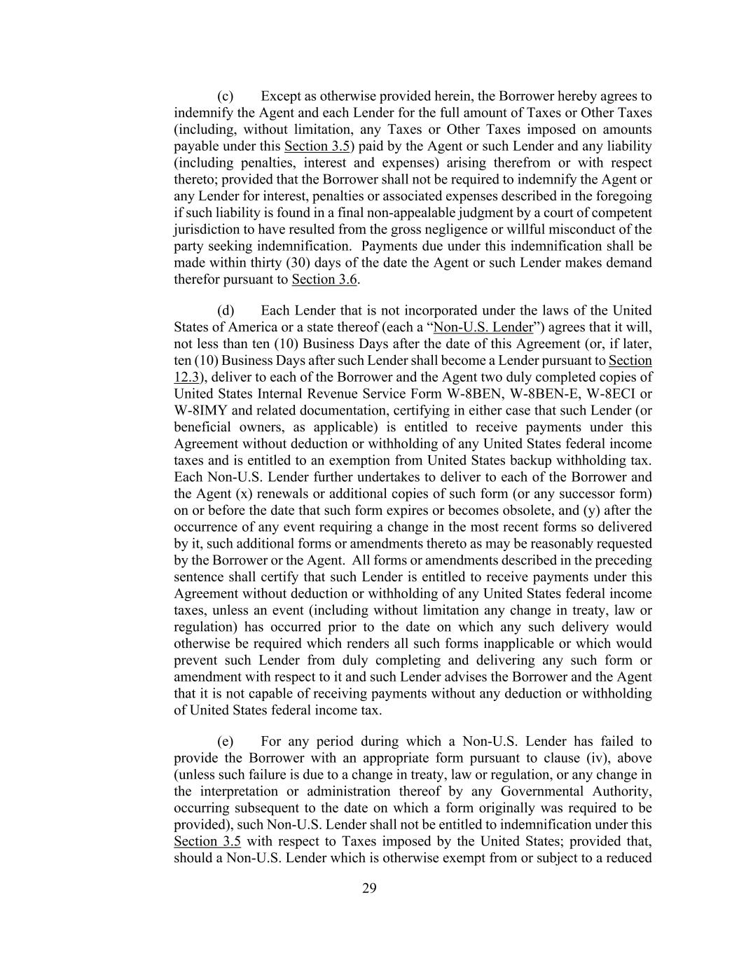 29 (c) Except as otherwise provided herein, the Borrower hereby agrees to indemnify the Agent and each Lender for the full amount of Taxes or Other Taxes (including, without limitation, any Taxes or Other Taxes imposed on amounts payable under this Section 3.5) paid by the Agent or such Lender and any liability (including penalties, interest and expenses) arising therefrom or with respect thereto; provided that the Borrower shall not be required to indemnify the Agent or any Lender for interest, penalties or associated expenses described in the foregoing if such liability is found in a final non-appealable judgment by a court of competent jurisdiction to have resulted from the gross negligence or willful misconduct of the party seeking indemnification. Payments due under this indemnification shall be made within thirty (30) days of the date the Agent or such Lender makes demand therefor pursuant to Section 3.6. (d) Each Lender that is not incorporated under the laws of the United States of America or a state thereof (each a “Non-U.S. Lender”) agrees that it will, not less than ten (10) Business Days after the date of this Agreement (or, if later, ten (10) Business Days after such Lender shall become a Lender pursuant to Section 12.3), deliver to each of the Borrower and the Agent two duly completed copies of United States Internal Revenue Service Form W-8BEN, W-8BEN-E, W-8ECI or W-8IMY and related documentation, certifying in either case that such Lender (or beneficial owners, as applicable) is entitled to receive payments under this Agreement without deduction or withholding of any United States federal income taxes and is entitled to an exemption from United States backup withholding tax. Each Non-U.S. Lender further undertakes to deliver to each of the Borrower and the Agent (x) renewals or additional copies of such form (or any successor form) on or before the date that such form expires or becomes obsolete, and (y) after the occurrence of any event requiring a change in the most recent forms so delivered by it, such additional forms or amendments thereto as may be reasonably requested by the Borrower or the Agent. All forms or amendments described in the preceding sentence shall certify that such Lender is entitled to receive payments under this Agreement without deduction or withholding of any United States federal income taxes, unless an event (including without limitation any change in treaty, law or regulation) has occurred prior to the date on which any such delivery would otherwise be required which renders all such forms inapplicable or which would prevent such Lender from duly completing and delivering any such form or amendment with respect to it and such Lender advises the Borrower and the Agent that it is not capable of receiving payments without any deduction or withholding of United States federal income tax. (e) For any period during which a Non-U.S. Lender has failed to provide the Borrower with an appropriate form pursuant to clause (iv), above (unless such failure is due to a change in treaty, law or regulation, or any change in the interpretation or administration thereof by any Governmental Authority, occurring subsequent to the date on which a form originally was required to be provided), such Non-U.S. Lender shall not be entitled to indemnification under this Section 3.5 with respect to Taxes imposed by the United States; provided that, should a Non-U.S. Lender which is otherwise exempt from or subject to a reduced