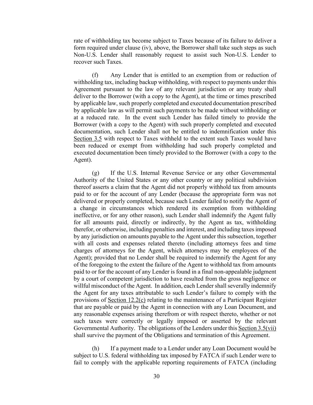 30 rate of withholding tax become subject to Taxes because of its failure to deliver a form required under clause (iv), above, the Borrower shall take such steps as such Non-U.S. Lender shall reasonably request to assist such Non-U.S. Lender to recover such Taxes. (f) Any Lender that is entitled to an exemption from or reduction of withholding tax, including backup withholding, with respect to payments under this Agreement pursuant to the law of any relevant jurisdiction or any treaty shall deliver to the Borrower (with a copy to the Agent), at the time or times prescribed by applicable law, such properly completed and executed documentation prescribed by applicable law as will permit such payments to be made without withholding or at a reduced rate. In the event such Lender has failed timely to provide the Borrower (with a copy to the Agent) with such properly completed and executed documentation, such Lender shall not be entitled to indemnification under this Section 3.5 with respect to Taxes withheld to the extent such Taxes would have been reduced or exempt from withholding had such properly completed and executed documentation been timely provided to the Borrower (with a copy to the Agent). (g) If the U.S. Internal Revenue Service or any other Governmental Authority of the United States or any other country or any political subdivision thereof asserts a claim that the Agent did not properly withhold tax from amounts paid to or for the account of any Lender (because the appropriate form was not delivered or properly completed, because such Lender failed to notify the Agent of a change in circumstances which rendered its exemption from withholding ineffective, or for any other reason), such Lender shall indemnify the Agent fully for all amounts paid, directly or indirectly, by the Agent as tax, withholding therefor, or otherwise, including penalties and interest, and including taxes imposed by any jurisdiction on amounts payable to the Agent under this subsection, together with all costs and expenses related thereto (including attorneys fees and time charges of attorneys for the Agent, which attorneys may be employees of the Agent); provided that no Lender shall be required to indemnify the Agent for any of the foregoing to the extent the failure of the Agent to withhold tax from amounts paid to or for the account of any Lender is found in a final non-appealable judgment by a court of competent jurisdiction to have resulted from the gross negligence or willful misconduct of the Agent. In addition, each Lender shall severally indemnify the Agent for any taxes attributable to such Lender’s failure to comply with the provisions of Section 12.2(c) relating to the maintenance of a Participant Register that are payable or paid by the Agent in connection with any Loan Document, and any reasonable expenses arising therefrom or with respect thereto, whether or not such taxes were correctly or legally imposed or asserted by the relevant Governmental Authority. The obligations of the Lenders under this Section 3.5(vii) shall survive the payment of the Obligations and termination of this Agreement. (h) If a payment made to a Lender under any Loan Document would be subject to U.S. federal withholding tax imposed by FATCA if such Lender were to fail to comply with the applicable reporting requirements of FATCA (including