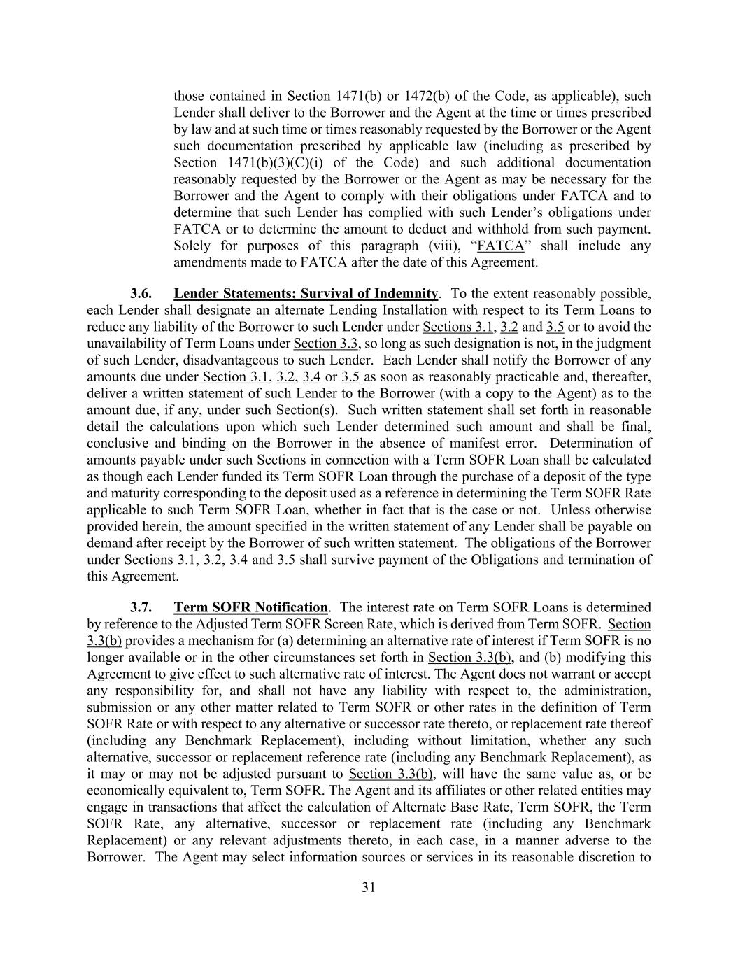 31 those contained in Section 1471(b) or 1472(b) of the Code, as applicable), such Lender shall deliver to the Borrower and the Agent at the time or times prescribed by law and at such time or times reasonably requested by the Borrower or the Agent such documentation prescribed by applicable law (including as prescribed by Section 1471(b)(3)(C)(i) of the Code) and such additional documentation reasonably requested by the Borrower or the Agent as may be necessary for the Borrower and the Agent to comply with their obligations under FATCA and to determine that such Lender has complied with such Lender’s obligations under FATCA or to determine the amount to deduct and withhold from such payment. Solely for purposes of this paragraph (viii), “FATCA” shall include any amendments made to FATCA after the date of this Agreement. 3.6. Lender Statements; Survival of Indemnity. To the extent reasonably possible, each Lender shall designate an alternate Lending Installation with respect to its Term Loans to reduce any liability of the Borrower to such Lender under Sections 3.1, 3.2 and 3.5 or to avoid the unavailability of Term Loans under Section 3.3, so long as such designation is not, in the judgment of such Lender, disadvantageous to such Lender. Each Lender shall notify the Borrower of any amounts due under Section 3.1, 3.2, 3.4 or 3.5 as soon as reasonably practicable and, thereafter, deliver a written statement of such Lender to the Borrower (with a copy to the Agent) as to the amount due, if any, under such Section(s). Such written statement shall set forth in reasonable detail the calculations upon which such Lender determined such amount and shall be final, conclusive and binding on the Borrower in the absence of manifest error. Determination of amounts payable under such Sections in connection with a Term SOFR Loan shall be calculated as though each Lender funded its Term SOFR Loan through the purchase of a deposit of the type and maturity corresponding to the deposit used as a reference in determining the Term SOFR Rate applicable to such Term SOFR Loan, whether in fact that is the case or not. Unless otherwise provided herein, the amount specified in the written statement of any Lender shall be payable on demand after receipt by the Borrower of such written statement. The obligations of the Borrower under Sections 3.1, 3.2, 3.4 and 3.5 shall survive payment of the Obligations and termination of this Agreement. 3.7. Term SOFR Notification. The interest rate on Term SOFR Loans is determined by reference to the Adjusted Term SOFR Screen Rate, which is derived from Term SOFR. Section 3.3(b) provides a mechanism for (a) determining an alternative rate of interest if Term SOFR is no longer available or in the other circumstances set forth in Section 3.3(b), and (b) modifying this Agreement to give effect to such alternative rate of interest. The Agent does not warrant or accept any responsibility for, and shall not have any liability with respect to, the administration, submission or any other matter related to Term SOFR or other rates in the definition of Term SOFR Rate or with respect to any alternative or successor rate thereto, or replacement rate thereof (including any Benchmark Replacement), including without limitation, whether any such alternative, successor or replacement reference rate (including any Benchmark Replacement), as it may or may not be adjusted pursuant to Section 3.3(b), will have the same value as, or be economically equivalent to, Term SOFR. The Agent and its affiliates or other related entities may engage in transactions that affect the calculation of Alternate Base Rate, Term SOFR, the Term SOFR Rate, any alternative, successor or replacement rate (including any Benchmark Replacement) or any relevant adjustments thereto, in each case, in a manner adverse to the Borrower. The Agent may select information sources or services in its reasonable discretion to