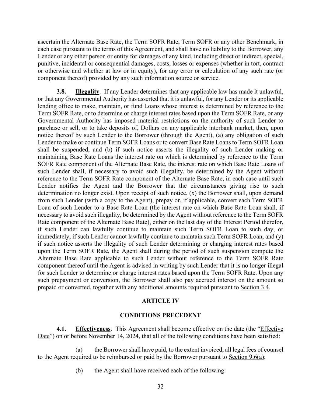 32 ascertain the Alternate Base Rate, the Term SOFR Rate, Term SOFR or any other Benchmark, in each case pursuant to the terms of this Agreement, and shall have no liability to the Borrower, any Lender or any other person or entity for damages of any kind, including direct or indirect, special, punitive, incidental or consequential damages, costs, losses or expenses (whether in tort, contract or otherwise and whether at law or in equity), for any error or calculation of any such rate (or component thereof) provided by any such information source or service. 3.8. Illegality. If any Lender determines that any applicable law has made it unlawful, or that any Governmental Authority has asserted that it is unlawful, for any Lender or its applicable lending office to make, maintain, or fund Loans whose interest is determined by reference to the Term SOFR Rate, or to determine or charge interest rates based upon the Term SOFR Rate, or any Governmental Authority has imposed material restrictions on the authority of such Lender to purchase or sell, or to take deposits of, Dollars on any applicable interbank market, then, upon notice thereof by such Lender to the Borrower (through the Agent), (a) any obligation of such Lender to make or continue Term SOFR Loans or to convert Base Rate Loans to Term SOFR Loan shall be suspended, and (b) if such notice asserts the illegality of such Lender making or maintaining Base Rate Loans the interest rate on which is determined by reference to the Term SOFR Rate component of the Alternate Base Rate, the interest rate on which Base Rate Loans of such Lender shall, if necessary to avoid such illegality, be determined by the Agent without reference to the Term SOFR Rate component of the Alternate Base Rate, in each case until such Lender notifies the Agent and the Borrower that the circumstances giving rise to such determination no longer exist. Upon receipt of such notice, (x) the Borrower shall, upon demand from such Lender (with a copy to the Agent), prepay or, if applicable, convert each Term SOFR Loan of such Lender to a Base Rate Loan (the interest rate on which Base Rate Loan shall, if necessary to avoid such illegality, be determined by the Agent without reference to the Term SOFR Rate component of the Alternate Base Rate), either on the last day of the Interest Period therefor, if such Lender can lawfully continue to maintain such Term SOFR Loan to such day, or immediately, if such Lender cannot lawfully continue to maintain such Term SOFR Loan, and (y) if such notice asserts the illegality of such Lender determining or charging interest rates based upon the Term SOFR Rate, the Agent shall during the period of such suspension compute the Alternate Base Rate applicable to such Lender without reference to the Term SOFR Rate component thereof until the Agent is advised in writing by such Lender that it is no longer illegal for such Lender to determine or charge interest rates based upon the Term SOFR Rate. Upon any such prepayment or conversion, the Borrower shall also pay accrued interest on the amount so prepaid or converted, together with any additional amounts required pursuant to Section 3.4. ARTICLE IV CONDITIONS PRECEDENT 4.1. Effectiveness. This Agreement shall become effective on the date (the “Effective Date”) on or before November 14, 2024, that all of the following conditions have been satisfied: (a) the Borrower shall have paid, to the extent invoiced, all legal fees of counsel to the Agent required to be reimbursed or paid by the Borrower pursuant to Section 9.6(a); (b) the Agent shall have received each of the following: