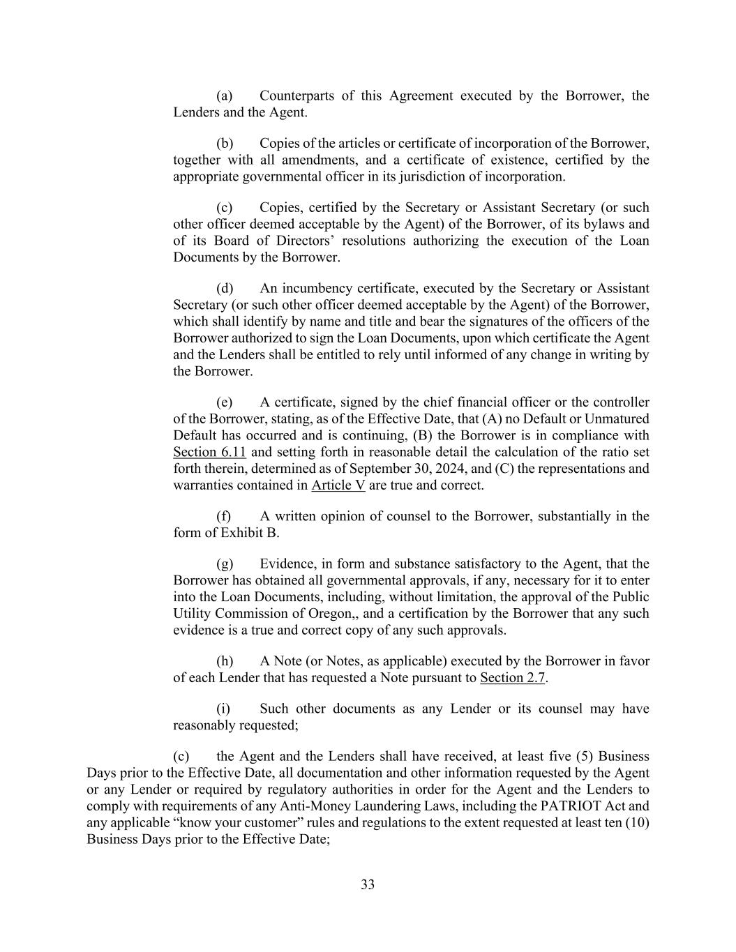 33 (a) Counterparts of this Agreement executed by the Borrower, the Lenders and the Agent. (b) Copies of the articles or certificate of incorporation of the Borrower, together with all amendments, and a certificate of existence, certified by the appropriate governmental officer in its jurisdiction of incorporation. (c) Copies, certified by the Secretary or Assistant Secretary (or such other officer deemed acceptable by the Agent) of the Borrower, of its bylaws and of its Board of Directors’ resolutions authorizing the execution of the Loan Documents by the Borrower. (d) An incumbency certificate, executed by the Secretary or Assistant Secretary (or such other officer deemed acceptable by the Agent) of the Borrower, which shall identify by name and title and bear the signatures of the officers of the Borrower authorized to sign the Loan Documents, upon which certificate the Agent and the Lenders shall be entitled to rely until informed of any change in writing by the Borrower. (e) A certificate, signed by the chief financial officer or the controller of the Borrower, stating, as of the Effective Date, that (A) no Default or Unmatured Default has occurred and is continuing, (B) the Borrower is in compliance with Section 6.11 and setting forth in reasonable detail the calculation of the ratio set forth therein, determined as of September 30, 2024, and (C) the representations and warranties contained in Article V are true and correct. (f) A written opinion of counsel to the Borrower, substantially in the form of Exhibit B. (g) Evidence, in form and substance satisfactory to the Agent, that the Borrower has obtained all governmental approvals, if any, necessary for it to enter into the Loan Documents, including, without limitation, the approval of the Public Utility Commission of Oregon,, and a certification by the Borrower that any such evidence is a true and correct copy of any such approvals. (h) A Note (or Notes, as applicable) executed by the Borrower in favor of each Lender that has requested a Note pursuant to Section 2.7. (i) Such other documents as any Lender or its counsel may have reasonably requested; (c) the Agent and the Lenders shall have received, at least five (5) Business Days prior to the Effective Date, all documentation and other information requested by the Agent or any Lender or required by regulatory authorities in order for the Agent and the Lenders to comply with requirements of any Anti-Money Laundering Laws, including the PATRIOT Act and any applicable “know your customer” rules and regulations to the extent requested at least ten (10) Business Days prior to the Effective Date;