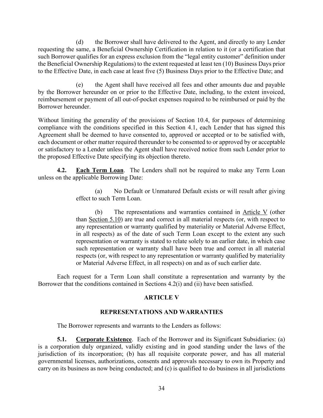 34 (d) the Borrower shall have delivered to the Agent, and directly to any Lender requesting the same, a Beneficial Ownership Certification in relation to it (or a certification that such Borrower qualifies for an express exclusion from the “legal entity customer” definition under the Beneficial Ownership Regulations) to the extent requested at least ten (10) Business Days prior to the Effective Date, in each case at least five (5) Business Days prior to the Effective Date; and (e) the Agent shall have received all fees and other amounts due and payable by the Borrower hereunder on or prior to the Effective Date, including, to the extent invoiced, reimbursement or payment of all out-of-pocket expenses required to be reimbursed or paid by the Borrower hereunder. Without limiting the generality of the provisions of Section 10.4, for purposes of determining compliance with the conditions specified in this Section 4.1, each Lender that has signed this Agreement shall be deemed to have consented to, approved or accepted or to be satisfied with, each document or other matter required thereunder to be consented to or approved by or acceptable or satisfactory to a Lender unless the Agent shall have received notice from such Lender prior to the proposed Effective Date specifying its objection thereto. 4.2. Each Term Loan. The Lenders shall not be required to make any Term Loan unless on the applicable Borrowing Date: (a) No Default or Unmatured Default exists or will result after giving effect to such Term Loan. (b) The representations and warranties contained in Article V (other than Section 5.10) are true and correct in all material respects (or, with respect to any representation or warranty qualified by materiality or Material Adverse Effect, in all respects) as of the date of such Term Loan except to the extent any such representation or warranty is stated to relate solely to an earlier date, in which case such representation or warranty shall have been true and correct in all material respects (or, with respect to any representation or warranty qualified by materiality or Material Adverse Effect, in all respects) on and as of such earlier date. Each request for a Term Loan shall constitute a representation and warranty by the Borrower that the conditions contained in Sections 4.2(i) and (ii) have been satisfied. ARTICLE V REPRESENTATIONS AND WARRANTIES The Borrower represents and warrants to the Lenders as follows: 5.1. Corporate Existence. Each of the Borrower and its Significant Subsidiaries: (a) is a corporation duly organized, validly existing and in good standing under the laws of the jurisdiction of its incorporation; (b) has all requisite corporate power, and has all material governmental licenses, authorizations, consents and approvals necessary to own its Property and carry on its business as now being conducted; and (c) is qualified to do business in all jurisdictions