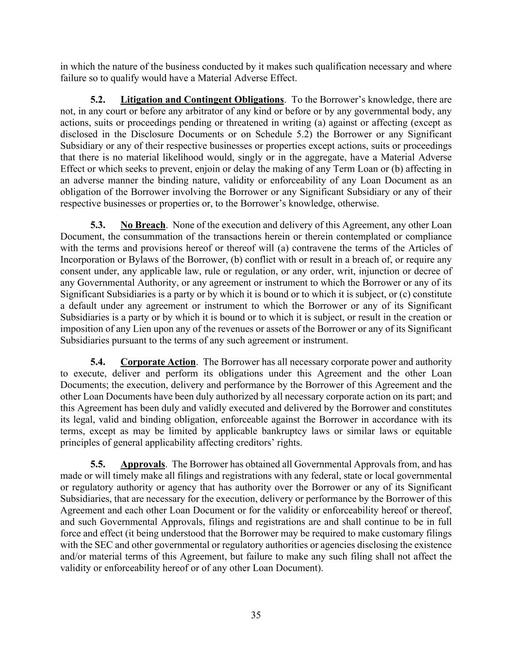 35 in which the nature of the business conducted by it makes such qualification necessary and where failure so to qualify would have a Material Adverse Effect. 5.2. Litigation and Contingent Obligations. To the Borrower’s knowledge, there are not, in any court or before any arbitrator of any kind or before or by any governmental body, any actions, suits or proceedings pending or threatened in writing (a) against or affecting (except as disclosed in the Disclosure Documents or on Schedule 5.2) the Borrower or any Significant Subsidiary or any of their respective businesses or properties except actions, suits or proceedings that there is no material likelihood would, singly or in the aggregate, have a Material Adverse Effect or which seeks to prevent, enjoin or delay the making of any Term Loan or (b) affecting in an adverse manner the binding nature, validity or enforceability of any Loan Document as an obligation of the Borrower involving the Borrower or any Significant Subsidiary or any of their respective businesses or properties or, to the Borrower’s knowledge, otherwise. 5.3. No Breach. None of the execution and delivery of this Agreement, any other Loan Document, the consummation of the transactions herein or therein contemplated or compliance with the terms and provisions hereof or thereof will (a) contravene the terms of the Articles of Incorporation or Bylaws of the Borrower, (b) conflict with or result in a breach of, or require any consent under, any applicable law, rule or regulation, or any order, writ, injunction or decree of any Governmental Authority, or any agreement or instrument to which the Borrower or any of its Significant Subsidiaries is a party or by which it is bound or to which it is subject, or (c) constitute a default under any agreement or instrument to which the Borrower or any of its Significant Subsidiaries is a party or by which it is bound or to which it is subject, or result in the creation or imposition of any Lien upon any of the revenues or assets of the Borrower or any of its Significant Subsidiaries pursuant to the terms of any such agreement or instrument. 5.4. Corporate Action. The Borrower has all necessary corporate power and authority to execute, deliver and perform its obligations under this Agreement and the other Loan Documents; the execution, delivery and performance by the Borrower of this Agreement and the other Loan Documents have been duly authorized by all necessary corporate action on its part; and this Agreement has been duly and validly executed and delivered by the Borrower and constitutes its legal, valid and binding obligation, enforceable against the Borrower in accordance with its terms, except as may be limited by applicable bankruptcy laws or similar laws or equitable principles of general applicability affecting creditors’ rights. 5.5. Approvals. The Borrower has obtained all Governmental Approvals from, and has made or will timely make all filings and registrations with any federal, state or local governmental or regulatory authority or agency that has authority over the Borrower or any of its Significant Subsidiaries, that are necessary for the execution, delivery or performance by the Borrower of this Agreement and each other Loan Document or for the validity or enforceability hereof or thereof, and such Governmental Approvals, filings and registrations are and shall continue to be in full force and effect (it being understood that the Borrower may be required to make customary filings with the SEC and other governmental or regulatory authorities or agencies disclosing the existence and/or material terms of this Agreement, but failure to make any such filing shall not affect the validity or enforceability hereof or of any other Loan Document).