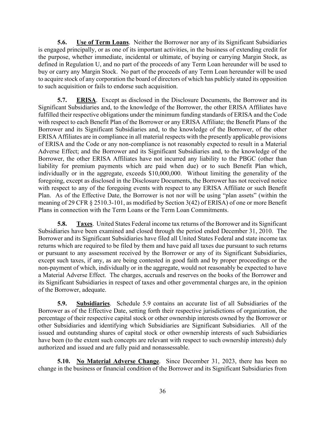 36 5.6. Use of Term Loans. Neither the Borrower nor any of its Significant Subsidiaries is engaged principally, or as one of its important activities, in the business of extending credit for the purpose, whether immediate, incidental or ultimate, of buying or carrying Margin Stock, as defined in Regulation U, and no part of the proceeds of any Term Loan hereunder will be used to buy or carry any Margin Stock. No part of the proceeds of any Term Loan hereunder will be used to acquire stock of any corporation the board of directors of which has publicly stated its opposition to such acquisition or fails to endorse such acquisition. 5.7. ERISA. Except as disclosed in the Disclosure Documents, the Borrower and its Significant Subsidiaries and, to the knowledge of the Borrower, the other ERISA Affiliates have fulfilled their respective obligations under the minimum funding standards of ERISA and the Code with respect to each Benefit Plan of the Borrower or any ERISA Affiliate; the Benefit Plans of the Borrower and its Significant Subsidiaries and, to the knowledge of the Borrower, of the other ERISA Affiliates are in compliance in all material respects with the presently applicable provisions of ERISA and the Code or any non-compliance is not reasonably expected to result in a Material Adverse Effect; and the Borrower and its Significant Subsidiaries and, to the knowledge of the Borrower, the other ERISA Affiliates have not incurred any liability to the PBGC (other than liability for premium payments which are paid when due) or to such Benefit Plan which, individually or in the aggregate, exceeds $10,000,000. Without limiting the generality of the foregoing, except as disclosed in the Disclosure Documents, the Borrower has not received notice with respect to any of the foregoing events with respect to any ERISA Affiliate or such Benefit Plan. As of the Effective Date, the Borrower is not nor will be using “plan assets” (within the meaning of 29 CFR § 2510.3-101, as modified by Section 3(42) of ERISA) of one or more Benefit Plans in connection with the Term Loans or the Term Loan Commitments. 5.8. Taxes. United States Federal income tax returns of the Borrower and its Significant Subsidiaries have been examined and closed through the period ended December 31, 2010. The Borrower and its Significant Subsidiaries have filed all United States Federal and state income tax returns which are required to be filed by them and have paid all taxes due pursuant to such returns or pursuant to any assessment received by the Borrower or any of its Significant Subsidiaries, except such taxes, if any, as are being contested in good faith and by proper proceedings or the non-payment of which, individually or in the aggregate, would not reasonably be expected to have a Material Adverse Effect. The charges, accruals and reserves on the books of the Borrower and its Significant Subsidiaries in respect of taxes and other governmental charges are, in the opinion of the Borrower, adequate. 5.9. Subsidiaries. Schedule 5.9 contains an accurate list of all Subsidiaries of the Borrower as of the Effective Date, setting forth their respective jurisdictions of organization, the percentage of their respective capital stock or other ownership interests owned by the Borrower or other Subsidiaries and identifying which Subsidiaries are Significant Subsidiaries. All of the issued and outstanding shares of capital stock or other ownership interests of such Subsidiaries have been (to the extent such concepts are relevant with respect to such ownership interests) duly authorized and issued and are fully paid and nonassessable. 5.10. No Material Adverse Change. Since December 31, 2023, there has been no change in the business or financial condition of the Borrower and its Significant Subsidiaries from