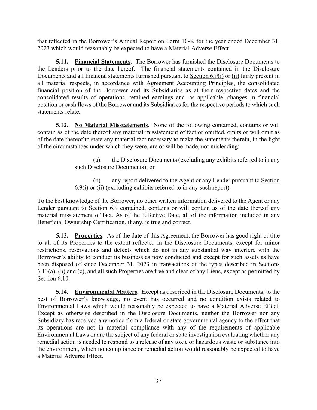 37 that reflected in the Borrower’s Annual Report on Form 10-K for the year ended December 31, 2023 which would reasonably be expected to have a Material Adverse Effect. 5.11. Financial Statements. The Borrower has furnished the Disclosure Documents to the Lenders prior to the date hereof. The financial statements contained in the Disclosure Documents and all financial statements furnished pursuant to Section 6.9(i) or (ii) fairly present in all material respects, in accordance with Agreement Accounting Principles, the consolidated financial position of the Borrower and its Subsidiaries as at their respective dates and the consolidated results of operations, retained earnings and, as applicable, changes in financial position or cash flows of the Borrower and its Subsidiaries for the respective periods to which such statements relate. 5.12. No Material Misstatements. None of the following contained, contains or will contain as of the date thereof any material misstatement of fact or omitted, omits or will omit as of the date thereof to state any material fact necessary to make the statements therein, in the light of the circumstances under which they were, are or will be made, not misleading: (a) the Disclosure Documents (excluding any exhibits referred to in any such Disclosure Documents); or (b) any report delivered to the Agent or any Lender pursuant to Section 6.9(i) or (ii) (excluding exhibits referred to in any such report). To the best knowledge of the Borrower, no other written information delivered to the Agent or any Lender pursuant to Section 6.9 contained, contains or will contain as of the date thereof any material misstatement of fact. As of the Effective Date, all of the information included in any Beneficial Ownership Certification, if any, is true and correct. 5.13. Properties. As of the date of this Agreement, the Borrower has good right or title to all of its Properties to the extent reflected in the Disclosure Documents, except for minor restrictions, reservations and defects which do not in any substantial way interfere with the Borrower’s ability to conduct its business as now conducted and except for such assets as have been disposed of since December 31, 2023 in transactions of the types described in Sections 6.13(a), (b) and (c), and all such Properties are free and clear of any Liens, except as permitted by Section 6.10. 5.14. Environmental Matters. Except as described in the Disclosure Documents, to the best of Borrower’s knowledge, no event has occurred and no condition exists related to Environmental Laws which would reasonably be expected to have a Material Adverse Effect. Except as otherwise described in the Disclosure Documents, neither the Borrower nor any Subsidiary has received any notice from a federal or state governmental agency to the effect that its operations are not in material compliance with any of the requirements of applicable Environmental Laws or are the subject of any federal or state investigation evaluating whether any remedial action is needed to respond to a release of any toxic or hazardous waste or substance into the environment, which noncompliance or remedial action would reasonably be expected to have a Material Adverse Effect.