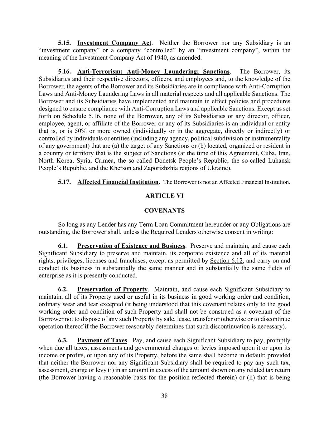 38 5.15. Investment Company Act. Neither the Borrower nor any Subsidiary is an “investment company” or a company “controlled” by an “investment company”, within the meaning of the Investment Company Act of 1940, as amended. 5.16. Anti-Terrorism; Anti-Money Laundering; Sanctions. The Borrower, its Subsidiaries and their respective directors, officers, and employees and, to the knowledge of the Borrower, the agents of the Borrower and its Subsidiaries are in compliance with Anti-Corruption Laws and Anti-Money Laundering Laws in all material respects and all applicable Sanctions. The Borrower and its Subsidiaries have implemented and maintain in effect policies and procedures designed to ensure compliance with Anti-Corruption Laws and applicable Sanctions. Except as set forth on Schedule 5.16, none of the Borrower, any of its Subsidiaries or any director, officer, employee, agent, or affiliate of the Borrower or any of its Subsidiaries is an individual or entity that is, or is 50% or more owned (individually or in the aggregate, directly or indirectly) or controlled by individuals or entities (including any agency, political subdivision or instrumentality of any government) that are (a) the target of any Sanctions or (b) located, organized or resident in a country or territory that is the subject of Sanctions (at the time of this Agreement, Cuba, Iran, North Korea, Syria, Crimea, the so-called Donetsk People’s Republic, the so-called Luhansk People’s Republic, and the Kherson and Zaporizhzhia regions of Ukraine). 5.17. Affected Financial Institution. The Borrower is not an Affected Financial Institution. ARTICLE VI COVENANTS So long as any Lender has any Term Loan Commitment hereunder or any Obligations are outstanding, the Borrower shall, unless the Required Lenders otherwise consent in writing: 6.1. Preservation of Existence and Business. Preserve and maintain, and cause each Significant Subsidiary to preserve and maintain, its corporate existence and all of its material rights, privileges, licenses and franchises, except as permitted by Section 6.12, and carry on and conduct its business in substantially the same manner and in substantially the same fields of enterprise as it is presently conducted. 6.2. Preservation of Property. Maintain, and cause each Significant Subsidiary to maintain, all of its Property used or useful in its business in good working order and condition, ordinary wear and tear excepted (it being understood that this covenant relates only to the good working order and condition of such Property and shall not be construed as a covenant of the Borrower not to dispose of any such Property by sale, lease, transfer or otherwise or to discontinue operation thereof if the Borrower reasonably determines that such discontinuation is necessary). 6.3. Payment of Taxes. Pay, and cause each Significant Subsidiary to pay, promptly when due all taxes, assessments and governmental charges or levies imposed upon it or upon its income or profits, or upon any of its Property, before the same shall become in default; provided that neither the Borrower nor any Significant Subsidiary shall be required to pay any such tax, assessment, charge or levy (i) in an amount in excess of the amount shown on any related tax return (the Borrower having a reasonable basis for the position reflected therein) or (ii) that is being