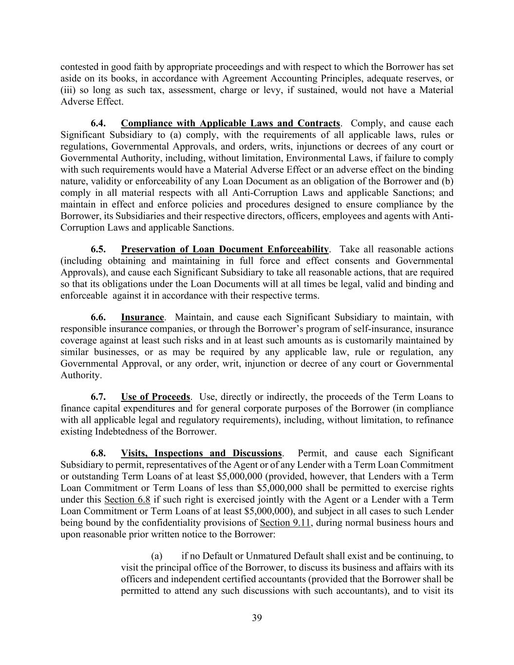 39 contested in good faith by appropriate proceedings and with respect to which the Borrower has set aside on its books, in accordance with Agreement Accounting Principles, adequate reserves, or (iii) so long as such tax, assessment, charge or levy, if sustained, would not have a Material Adverse Effect. 6.4. Compliance with Applicable Laws and Contracts. Comply, and cause each Significant Subsidiary to (a) comply, with the requirements of all applicable laws, rules or regulations, Governmental Approvals, and orders, writs, injunctions or decrees of any court or Governmental Authority, including, without limitation, Environmental Laws, if failure to comply with such requirements would have a Material Adverse Effect or an adverse effect on the binding nature, validity or enforceability of any Loan Document as an obligation of the Borrower and (b) comply in all material respects with all Anti-Corruption Laws and applicable Sanctions; and maintain in effect and enforce policies and procedures designed to ensure compliance by the Borrower, its Subsidiaries and their respective directors, officers, employees and agents with Anti- Corruption Laws and applicable Sanctions. 6.5. Preservation of Loan Document Enforceability. Take all reasonable actions (including obtaining and maintaining in full force and effect consents and Governmental Approvals), and cause each Significant Subsidiary to take all reasonable actions, that are required so that its obligations under the Loan Documents will at all times be legal, valid and binding and enforceable against it in accordance with their respective terms. 6.6. Insurance. Maintain, and cause each Significant Subsidiary to maintain, with responsible insurance companies, or through the Borrower’s program of self-insurance, insurance coverage against at least such risks and in at least such amounts as is customarily maintained by similar businesses, or as may be required by any applicable law, rule or regulation, any Governmental Approval, or any order, writ, injunction or decree of any court or Governmental Authority. 6.7. Use of Proceeds. Use, directly or indirectly, the proceeds of the Term Loans to finance capital expenditures and for general corporate purposes of the Borrower (in compliance with all applicable legal and regulatory requirements), including, without limitation, to refinance existing Indebtedness of the Borrower. 6.8. Visits, Inspections and Discussions. Permit, and cause each Significant Subsidiary to permit, representatives of the Agent or of any Lender with a Term Loan Commitment or outstanding Term Loans of at least $5,000,000 (provided, however, that Lenders with a Term Loan Commitment or Term Loans of less than $5,000,000 shall be permitted to exercise rights under this Section 6.8 if such right is exercised jointly with the Agent or a Lender with a Term Loan Commitment or Term Loans of at least $5,000,000), and subject in all cases to such Lender being bound by the confidentiality provisions of Section 9.11, during normal business hours and upon reasonable prior written notice to the Borrower: (a) if no Default or Unmatured Default shall exist and be continuing, to visit the principal office of the Borrower, to discuss its business and affairs with its officers and independent certified accountants (provided that the Borrower shall be permitted to attend any such discussions with such accountants), and to visit its