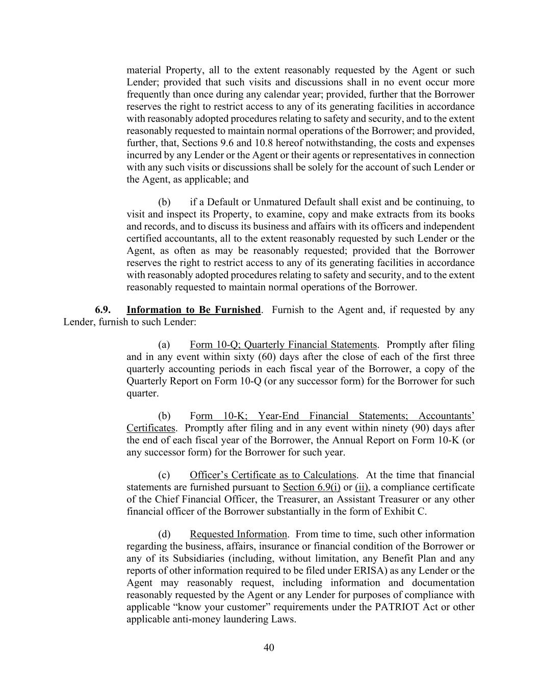 40 material Property, all to the extent reasonably requested by the Agent or such Lender; provided that such visits and discussions shall in no event occur more frequently than once during any calendar year; provided, further that the Borrower reserves the right to restrict access to any of its generating facilities in accordance with reasonably adopted procedures relating to safety and security, and to the extent reasonably requested to maintain normal operations of the Borrower; and provided, further, that, Sections 9.6 and 10.8 hereof notwithstanding, the costs and expenses incurred by any Lender or the Agent or their agents or representatives in connection with any such visits or discussions shall be solely for the account of such Lender or the Agent, as applicable; and (b) if a Default or Unmatured Default shall exist and be continuing, to visit and inspect its Property, to examine, copy and make extracts from its books and records, and to discuss its business and affairs with its officers and independent certified accountants, all to the extent reasonably requested by such Lender or the Agent, as often as may be reasonably requested; provided that the Borrower reserves the right to restrict access to any of its generating facilities in accordance with reasonably adopted procedures relating to safety and security, and to the extent reasonably requested to maintain normal operations of the Borrower. 6.9. Information to Be Furnished. Furnish to the Agent and, if requested by any Lender, furnish to such Lender: (a) Form 10-Q; Quarterly Financial Statements. Promptly after filing and in any event within sixty (60) days after the close of each of the first three quarterly accounting periods in each fiscal year of the Borrower, a copy of the Quarterly Report on Form 10-Q (or any successor form) for the Borrower for such quarter. (b) Form 10-K; Year-End Financial Statements; Accountants’ Certificates. Promptly after filing and in any event within ninety (90) days after the end of each fiscal year of the Borrower, the Annual Report on Form 10-K (or any successor form) for the Borrower for such year. (c) Officer’s Certificate as to Calculations. At the time that financial statements are furnished pursuant to Section 6.9(i) or (ii), a compliance certificate of the Chief Financial Officer, the Treasurer, an Assistant Treasurer or any other financial officer of the Borrower substantially in the form of Exhibit C. (d) Requested Information. From time to time, such other information regarding the business, affairs, insurance or financial condition of the Borrower or any of its Subsidiaries (including, without limitation, any Benefit Plan and any reports of other information required to be filed under ERISA) as any Lender or the Agent may reasonably request, including information and documentation reasonably requested by the Agent or any Lender for purposes of compliance with applicable “know your customer” requirements under the PATRIOT Act or other applicable anti-money laundering Laws.
