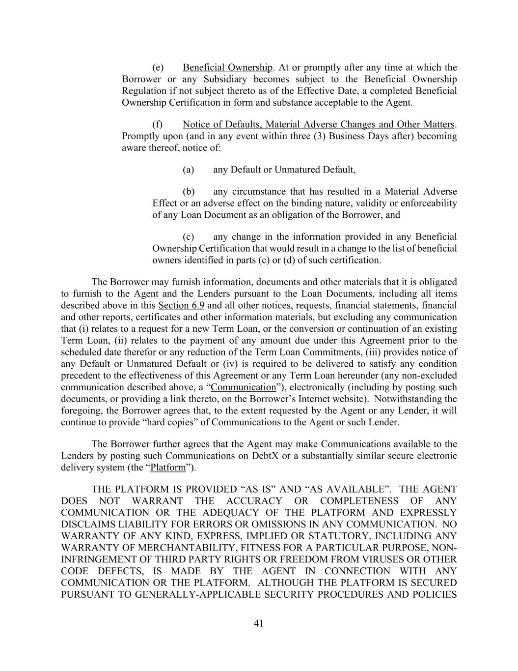 41 (e) Beneficial Ownership. At or promptly after any time at which the Borrower or any Subsidiary becomes subject to the Beneficial Ownership Regulation if not subject thereto as of the Effective Date, a completed Beneficial Ownership Certification in form and substance acceptable to the Agent. (f) Notice of Defaults, Material Adverse Changes and Other Matters. Promptly upon (and in any event within three (3) Business Days after) becoming aware thereof, notice of: (a) any Default or Unmatured Default, (b) any circumstance that has resulted in a Material Adverse Effect or an adverse effect on the binding nature, validity or enforceability of any Loan Document as an obligation of the Borrower, and (c) any change in the information provided in any Beneficial Ownership Certification that would result in a change to the list of beneficial owners identified in parts (c) or (d) of such certification. The Borrower may furnish information, documents and other materials that it is obligated to furnish to the Agent and the Lenders pursuant to the Loan Documents, including all items described above in this Section 6.9 and all other notices, requests, financial statements, financial and other reports, certificates and other information materials, but excluding any communication that (i) relates to a request for a new Term Loan, or the conversion or continuation of an existing Term Loan, (ii) relates to the payment of any amount due under this Agreement prior to the scheduled date therefor or any reduction of the Term Loan Commitments, (iii) provides notice of any Default or Unmatured Default or (iv) is required to be delivered to satisfy any condition precedent to the effectiveness of this Agreement or any Term Loan hereunder (any non-excluded communication described above, a “Communication”), electronically (including by posting such documents, or providing a link thereto, on the Borrower’s Internet website). Notwithstanding the foregoing, the Borrower agrees that, to the extent requested by the Agent or any Lender, it will continue to provide “hard copies” of Communications to the Agent or such Lender. The Borrower further agrees that the Agent may make Communications available to the Lenders by posting such Communications on DebtX or a substantially similar secure electronic delivery system (the “Platform”). THE PLATFORM IS PROVIDED “AS IS” AND “AS AVAILABLE”. THE AGENT DOES NOT WARRANT THE ACCURACY OR COMPLETENESS OF ANY COMMUNICATION OR THE ADEQUACY OF THE PLATFORM AND EXPRESSLY DISCLAIMS LIABILITY FOR ERRORS OR OMISSIONS IN ANY COMMUNICATION. NO WARRANTY OF ANY KIND, EXPRESS, IMPLIED OR STATUTORY, INCLUDING ANY WARRANTY OF MERCHANTABILITY, FITNESS FOR A PARTICULAR PURPOSE, NON- INFRINGEMENT OF THIRD PARTY RIGHTS OR FREEDOM FROM VIRUSES OR OTHER CODE DEFECTS, IS MADE BY THE AGENT IN CONNECTION WITH ANY COMMUNICATION OR THE PLATFORM. ALTHOUGH THE PLATFORM IS SECURED PURSUANT TO GENERALLY-APPLICABLE SECURITY PROCEDURES AND POLICIES