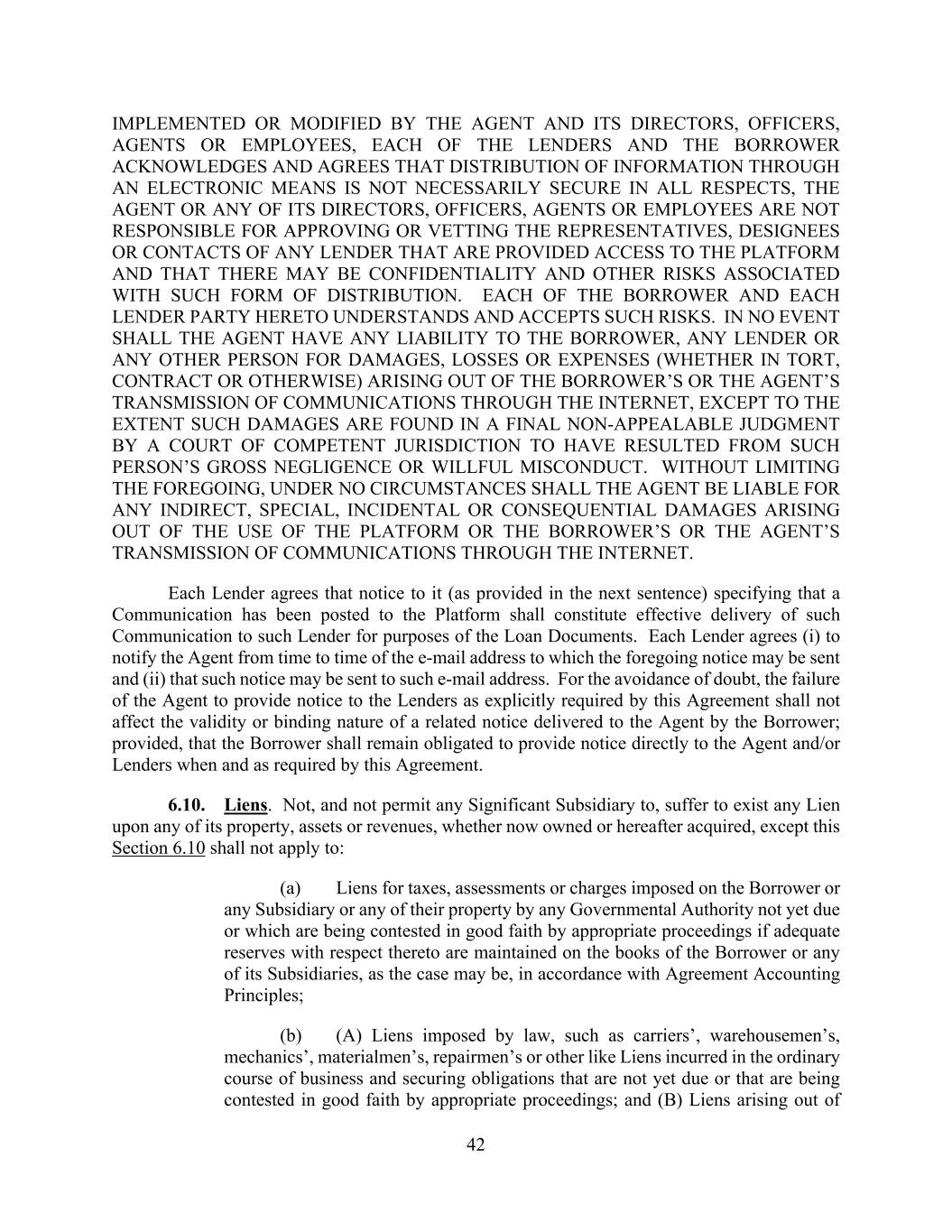 42 IMPLEMENTED OR MODIFIED BY THE AGENT AND ITS DIRECTORS, OFFICERS, AGENTS OR EMPLOYEES, EACH OF THE LENDERS AND THE BORROWER ACKNOWLEDGES AND AGREES THAT DISTRIBUTION OF INFORMATION THROUGH AN ELECTRONIC MEANS IS NOT NECESSARILY SECURE IN ALL RESPECTS, THE AGENT OR ANY OF ITS DIRECTORS, OFFICERS, AGENTS OR EMPLOYEES ARE NOT RESPONSIBLE FOR APPROVING OR VETTING THE REPRESENTATIVES, DESIGNEES OR CONTACTS OF ANY LENDER THAT ARE PROVIDED ACCESS TO THE PLATFORM AND THAT THERE MAY BE CONFIDENTIALITY AND OTHER RISKS ASSOCIATED WITH SUCH FORM OF DISTRIBUTION. EACH OF THE BORROWER AND EACH LENDER PARTY HERETO UNDERSTANDS AND ACCEPTS SUCH RISKS. IN NO EVENT SHALL THE AGENT HAVE ANY LIABILITY TO THE BORROWER, ANY LENDER OR ANY OTHER PERSON FOR DAMAGES, LOSSES OR EXPENSES (WHETHER IN TORT, CONTRACT OR OTHERWISE) ARISING OUT OF THE BORROWER’S OR THE AGENT’S TRANSMISSION OF COMMUNICATIONS THROUGH THE INTERNET, EXCEPT TO THE EXTENT SUCH DAMAGES ARE FOUND IN A FINAL NON-APPEALABLE JUDGMENT BY A COURT OF COMPETENT JURISDICTION TO HAVE RESULTED FROM SUCH PERSON’S GROSS NEGLIGENCE OR WILLFUL MISCONDUCT. WITHOUT LIMITING THE FOREGOING, UNDER NO CIRCUMSTANCES SHALL THE AGENT BE LIABLE FOR ANY INDIRECT, SPECIAL, INCIDENTAL OR CONSEQUENTIAL DAMAGES ARISING OUT OF THE USE OF THE PLATFORM OR THE BORROWER’S OR THE AGENT’S TRANSMISSION OF COMMUNICATIONS THROUGH THE INTERNET. Each Lender agrees that notice to it (as provided in the next sentence) specifying that a Communication has been posted to the Platform shall constitute effective delivery of such Communication to such Lender for purposes of the Loan Documents. Each Lender agrees (i) to notify the Agent from time to time of the e-mail address to which the foregoing notice may be sent and (ii) that such notice may be sent to such e-mail address. For the avoidance of doubt, the failure of the Agent to provide notice to the Lenders as explicitly required by this Agreement shall not affect the validity or binding nature of a related notice delivered to the Agent by the Borrower; provided, that the Borrower shall remain obligated to provide notice directly to the Agent and/or Lenders when and as required by this Agreement. 6.10. Liens. Not, and not permit any Significant Subsidiary to, suffer to exist any Lien upon any of its property, assets or revenues, whether now owned or hereafter acquired, except this Section 6.10 shall not apply to: (a) Liens for taxes, assessments or charges imposed on the Borrower or any Subsidiary or any of their property by any Governmental Authority not yet due or which are being contested in good faith by appropriate proceedings if adequate reserves with respect thereto are maintained on the books of the Borrower or any of its Subsidiaries, as the case may be, in accordance with Agreement Accounting Principles; (b) (A) Liens imposed by law, such as carriers’, warehousemen’s, mechanics’, materialmen’s, repairmen’s or other like Liens incurred in the ordinary course of business and securing obligations that are not yet due or that are being contested in good faith by appropriate proceedings; and (B) Liens arising out of