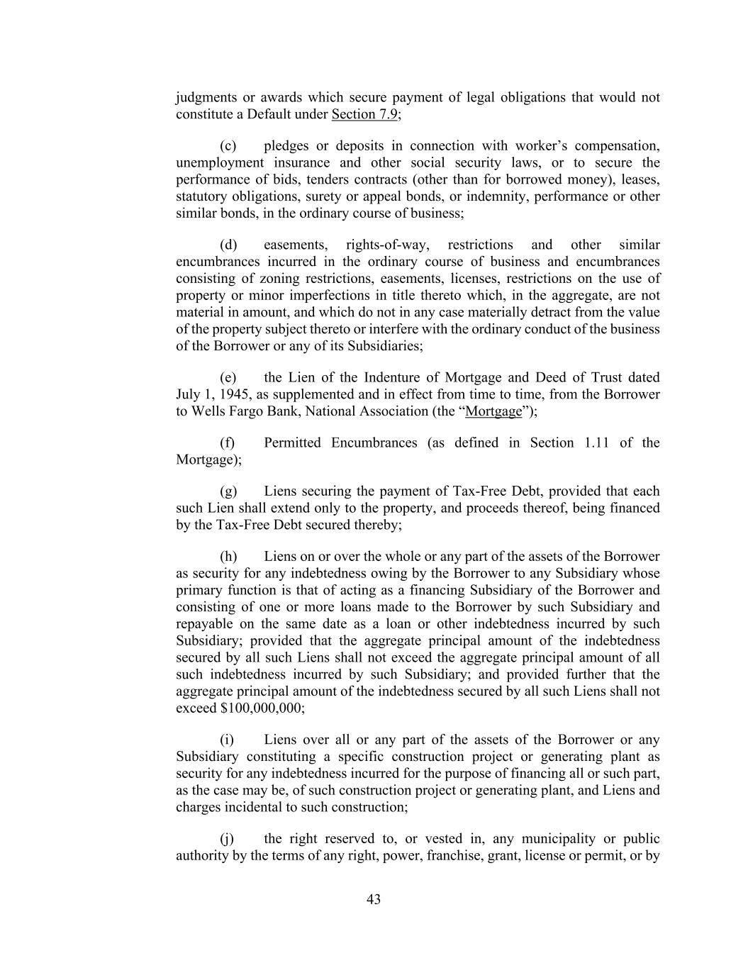 43 judgments or awards which secure payment of legal obligations that would not constitute a Default under Section 7.9; (c) pledges or deposits in connection with worker’s compensation, unemployment insurance and other social security laws, or to secure the performance of bids, tenders contracts (other than for borrowed money), leases, statutory obligations, surety or appeal bonds, or indemnity, performance or other similar bonds, in the ordinary course of business; (d) easements, rights-of-way, restrictions and other similar encumbrances incurred in the ordinary course of business and encumbrances consisting of zoning restrictions, easements, licenses, restrictions on the use of property or minor imperfections in title thereto which, in the aggregate, are not material in amount, and which do not in any case materially detract from the value of the property subject thereto or interfere with the ordinary conduct of the business of the Borrower or any of its Subsidiaries; (e) the Lien of the Indenture of Mortgage and Deed of Trust dated July 1, 1945, as supplemented and in effect from time to time, from the Borrower to Wells Fargo Bank, National Association (the “Mortgage”); (f) Permitted Encumbrances (as defined in Section 1.11 of the Mortgage); (g) Liens securing the payment of Tax-Free Debt, provided that each such Lien shall extend only to the property, and proceeds thereof, being financed by the Tax-Free Debt secured thereby; (h) Liens on or over the whole or any part of the assets of the Borrower as security for any indebtedness owing by the Borrower to any Subsidiary whose primary function is that of acting as a financing Subsidiary of the Borrower and consisting of one or more loans made to the Borrower by such Subsidiary and repayable on the same date as a loan or other indebtedness incurred by such Subsidiary; provided that the aggregate principal amount of the indebtedness secured by all such Liens shall not exceed the aggregate principal amount of all such indebtedness incurred by such Subsidiary; and provided further that the aggregate principal amount of the indebtedness secured by all such Liens shall not exceed $100,000,000; (i) Liens over all or any part of the assets of the Borrower or any Subsidiary constituting a specific construction project or generating plant as security for any indebtedness incurred for the purpose of financing all or such part, as the case may be, of such construction project or generating plant, and Liens and charges incidental to such construction; (j) the right reserved to, or vested in, any municipality or public authority by the terms of any right, power, franchise, grant, license or permit, or by