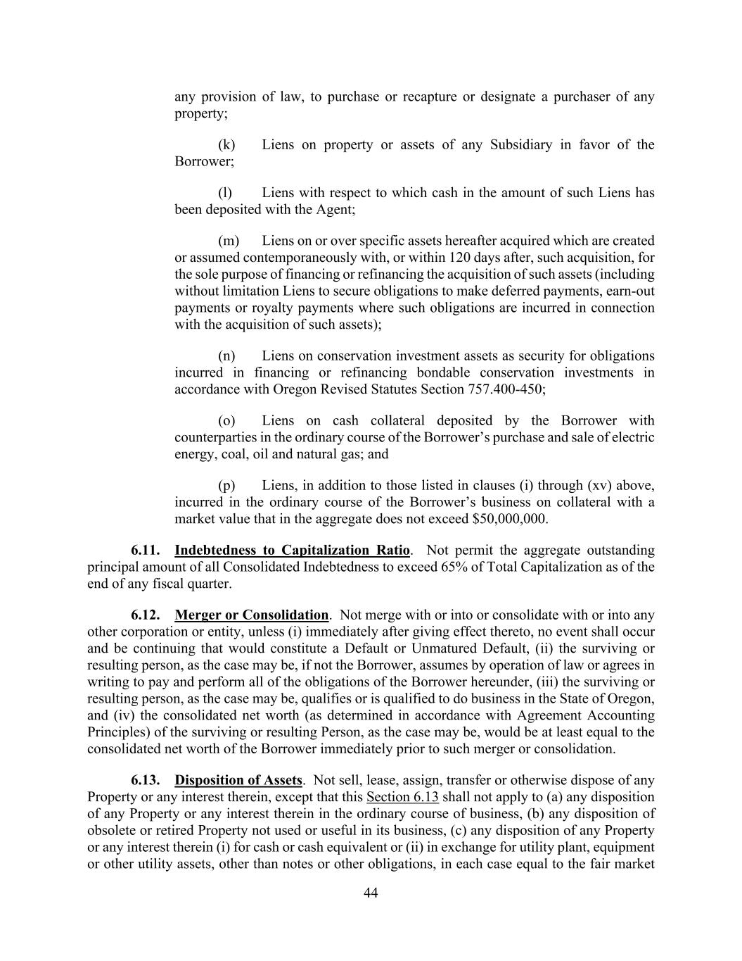 44 any provision of law, to purchase or recapture or designate a purchaser of any property; (k) Liens on property or assets of any Subsidiary in favor of the Borrower; (l) Liens with respect to which cash in the amount of such Liens has been deposited with the Agent; (m) Liens on or over specific assets hereafter acquired which are created or assumed contemporaneously with, or within 120 days after, such acquisition, for the sole purpose of financing or refinancing the acquisition of such assets (including without limitation Liens to secure obligations to make deferred payments, earn-out payments or royalty payments where such obligations are incurred in connection with the acquisition of such assets); (n) Liens on conservation investment assets as security for obligations incurred in financing or refinancing bondable conservation investments in accordance with Oregon Revised Statutes Section 757.400-450; (o) Liens on cash collateral deposited by the Borrower with counterparties in the ordinary course of the Borrower’s purchase and sale of electric energy, coal, oil and natural gas; and (p) Liens, in addition to those listed in clauses (i) through (xv) above, incurred in the ordinary course of the Borrower’s business on collateral with a market value that in the aggregate does not exceed $50,000,000. 6.11. Indebtedness to Capitalization Ratio. Not permit the aggregate outstanding principal amount of all Consolidated Indebtedness to exceed 65% of Total Capitalization as of the end of any fiscal quarter. 6.12. Merger or Consolidation. Not merge with or into or consolidate with or into any other corporation or entity, unless (i) immediately after giving effect thereto, no event shall occur and be continuing that would constitute a Default or Unmatured Default, (ii) the surviving or resulting person, as the case may be, if not the Borrower, assumes by operation of law or agrees in writing to pay and perform all of the obligations of the Borrower hereunder, (iii) the surviving or resulting person, as the case may be, qualifies or is qualified to do business in the State of Oregon, and (iv) the consolidated net worth (as determined in accordance with Agreement Accounting Principles) of the surviving or resulting Person, as the case may be, would be at least equal to the consolidated net worth of the Borrower immediately prior to such merger or consolidation. 6.13. Disposition of Assets. Not sell, lease, assign, transfer or otherwise dispose of any Property or any interest therein, except that this Section 6.13 shall not apply to (a) any disposition of any Property or any interest therein in the ordinary course of business, (b) any disposition of obsolete or retired Property not used or useful in its business, (c) any disposition of any Property or any interest therein (i) for cash or cash equivalent or (ii) in exchange for utility plant, equipment or other utility assets, other than notes or other obligations, in each case equal to the fair market