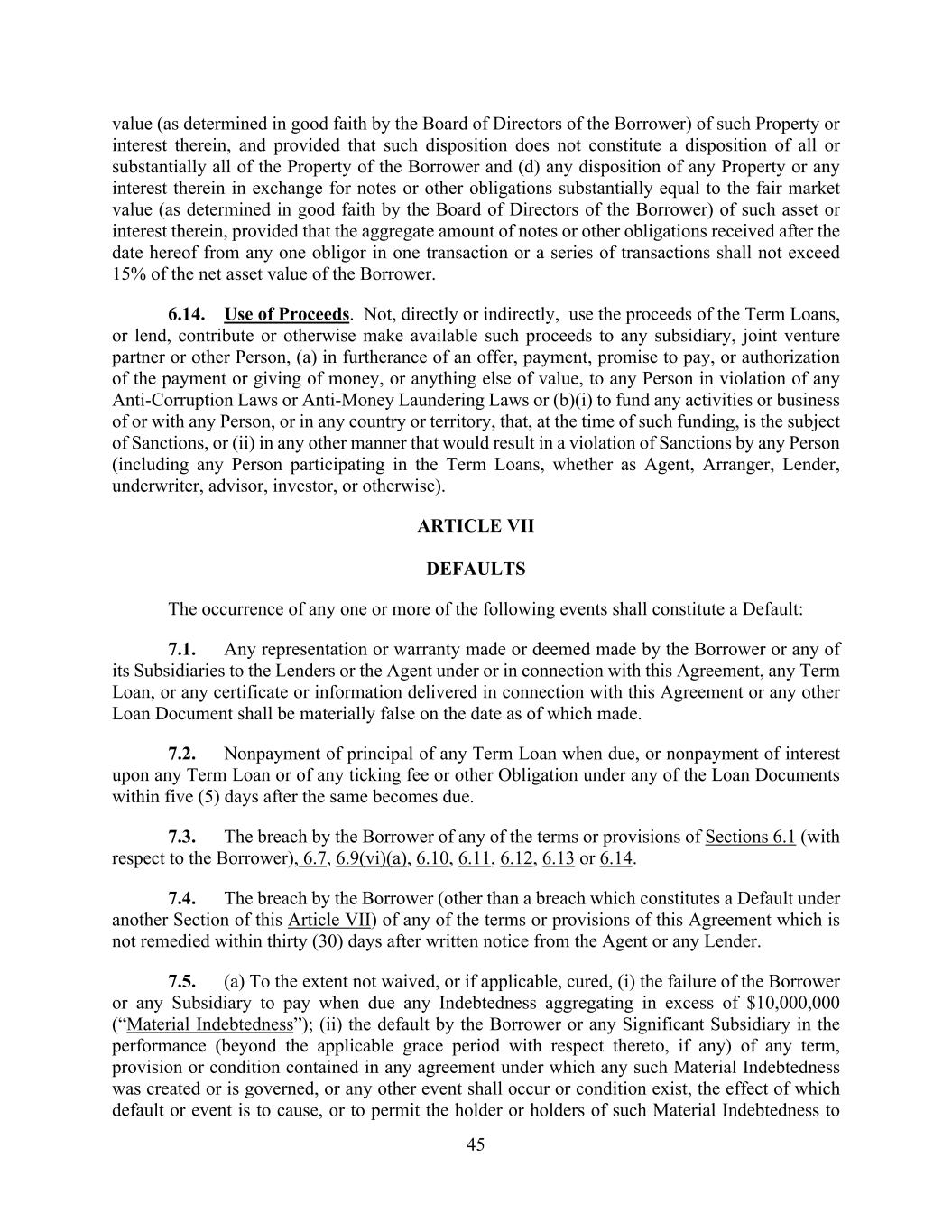 45 value (as determined in good faith by the Board of Directors of the Borrower) of such Property or interest therein, and provided that such disposition does not constitute a disposition of all or substantially all of the Property of the Borrower and (d) any disposition of any Property or any interest therein in exchange for notes or other obligations substantially equal to the fair market value (as determined in good faith by the Board of Directors of the Borrower) of such asset or interest therein, provided that the aggregate amount of notes or other obligations received after the date hereof from any one obligor in one transaction or a series of transactions shall not exceed 15% of the net asset value of the Borrower. 6.14. Use of Proceeds. Not, directly or indirectly, use the proceeds of the Term Loans, or lend, contribute or otherwise make available such proceeds to any subsidiary, joint venture partner or other Person, (a) in furtherance of an offer, payment, promise to pay, or authorization of the payment or giving of money, or anything else of value, to any Person in violation of any Anti-Corruption Laws or Anti-Money Laundering Laws or (b)(i) to fund any activities or business of or with any Person, or in any country or territory, that, at the time of such funding, is the subject of Sanctions, or (ii) in any other manner that would result in a violation of Sanctions by any Person (including any Person participating in the Term Loans, whether as Agent, Arranger, Lender, underwriter, advisor, investor, or otherwise). ARTICLE VII DEFAULTS The occurrence of any one or more of the following events shall constitute a Default: 7.1. Any representation or warranty made or deemed made by the Borrower or any of its Subsidiaries to the Lenders or the Agent under or in connection with this Agreement, any Term Loan, or any certificate or information delivered in connection with this Agreement or any other Loan Document shall be materially false on the date as of which made. 7.2. Nonpayment of principal of any Term Loan when due, or nonpayment of interest upon any Term Loan or of any ticking fee or other Obligation under any of the Loan Documents within five (5) days after the same becomes due. 7.3. The breach by the Borrower of any of the terms or provisions of Sections 6.1 (with respect to the Borrower), 6.7, 6.9(vi)(a), 6.10, 6.11, 6.12, 6.13 or 6.14. 7.4. The breach by the Borrower (other than a breach which constitutes a Default under another Section of this Article VII) of any of the terms or provisions of this Agreement which is not remedied within thirty (30) days after written notice from the Agent or any Lender. 7.5. (a) To the extent not waived, or if applicable, cured, (i) the failure of the Borrower or any Subsidiary to pay when due any Indebtedness aggregating in excess of $10,000,000 (“Material Indebtedness”); (ii) the default by the Borrower or any Significant Subsidiary in the performance (beyond the applicable grace period with respect thereto, if any) of any term, provision or condition contained in any agreement under which any such Material Indebtedness was created or is governed, or any other event shall occur or condition exist, the effect of which default or event is to cause, or to permit the holder or holders of such Material Indebtedness to