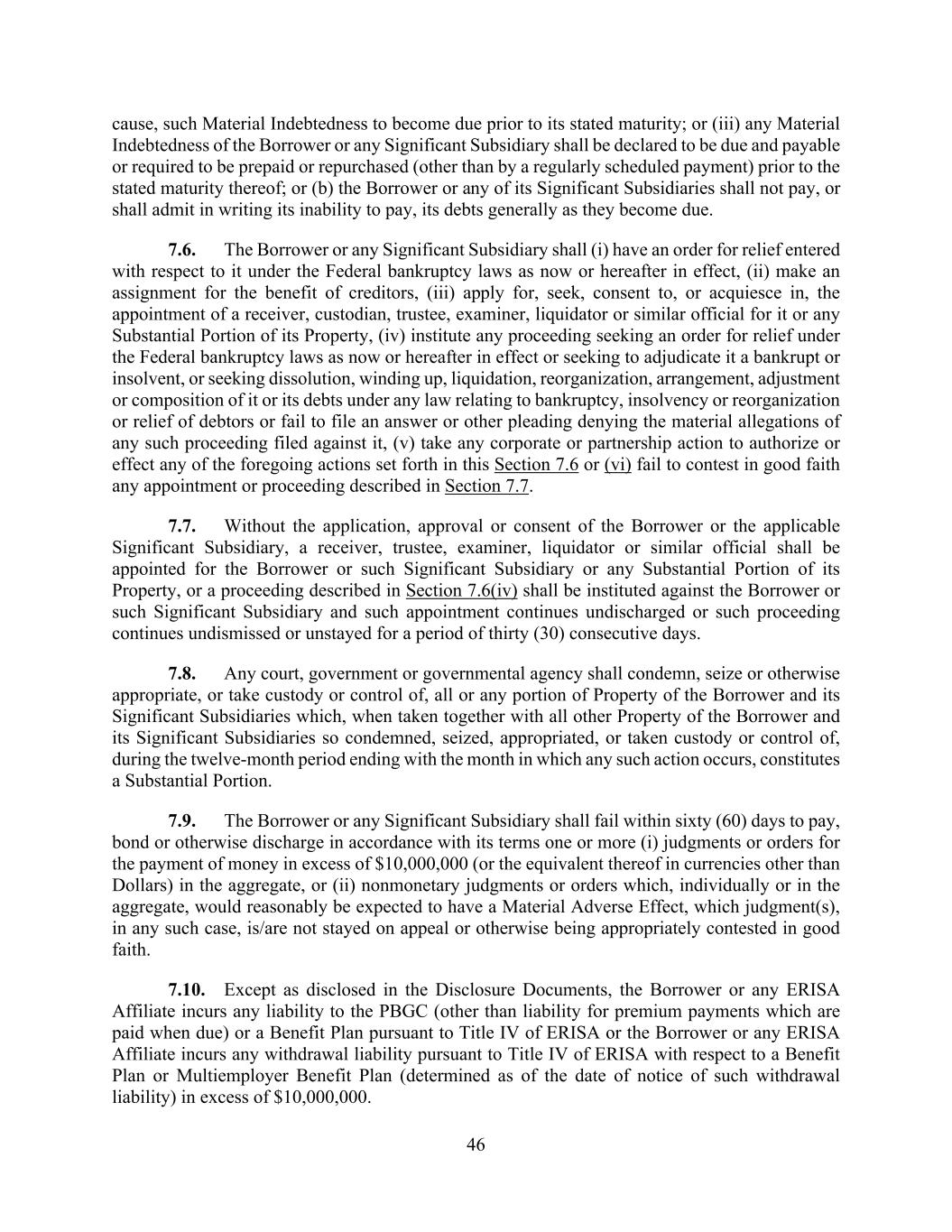 46 cause, such Material Indebtedness to become due prior to its stated maturity; or (iii) any Material Indebtedness of the Borrower or any Significant Subsidiary shall be declared to be due and payable or required to be prepaid or repurchased (other than by a regularly scheduled payment) prior to the stated maturity thereof; or (b) the Borrower or any of its Significant Subsidiaries shall not pay, or shall admit in writing its inability to pay, its debts generally as they become due. 7.6. The Borrower or any Significant Subsidiary shall (i) have an order for relief entered with respect to it under the Federal bankruptcy laws as now or hereafter in effect, (ii) make an assignment for the benefit of creditors, (iii) apply for, seek, consent to, or acquiesce in, the appointment of a receiver, custodian, trustee, examiner, liquidator or similar official for it or any Substantial Portion of its Property, (iv) institute any proceeding seeking an order for relief under the Federal bankruptcy laws as now or hereafter in effect or seeking to adjudicate it a bankrupt or insolvent, or seeking dissolution, winding up, liquidation, reorganization, arrangement, adjustment or composition of it or its debts under any law relating to bankruptcy, insolvency or reorganization or relief of debtors or fail to file an answer or other pleading denying the material allegations of any such proceeding filed against it, (v) take any corporate or partnership action to authorize or effect any of the foregoing actions set forth in this Section 7.6 or (vi) fail to contest in good faith any appointment or proceeding described in Section 7.7. 7.7. Without the application, approval or consent of the Borrower or the applicable Significant Subsidiary, a receiver, trustee, examiner, liquidator or similar official shall be appointed for the Borrower or such Significant Subsidiary or any Substantial Portion of its Property, or a proceeding described in Section 7.6(iv) shall be instituted against the Borrower or such Significant Subsidiary and such appointment continues undischarged or such proceeding continues undismissed or unstayed for a period of thirty (30) consecutive days. 7.8. Any court, government or governmental agency shall condemn, seize or otherwise appropriate, or take custody or control of, all or any portion of Property of the Borrower and its Significant Subsidiaries which, when taken together with all other Property of the Borrower and its Significant Subsidiaries so condemned, seized, appropriated, or taken custody or control of, during the twelve-month period ending with the month in which any such action occurs, constitutes a Substantial Portion. 7.9. The Borrower or any Significant Subsidiary shall fail within sixty (60) days to pay, bond or otherwise discharge in accordance with its terms one or more (i) judgments or orders for the payment of money in excess of $10,000,000 (or the equivalent thereof in currencies other than Dollars) in the aggregate, or (ii) nonmonetary judgments or orders which, individually or in the aggregate, would reasonably be expected to have a Material Adverse Effect, which judgment(s), in any such case, is/are not stayed on appeal or otherwise being appropriately contested in good faith. 7.10. Except as disclosed in the Disclosure Documents, the Borrower or any ERISA Affiliate incurs any liability to the PBGC (other than liability for premium payments which are paid when due) or a Benefit Plan pursuant to Title IV of ERISA or the Borrower or any ERISA Affiliate incurs any withdrawal liability pursuant to Title IV of ERISA with respect to a Benefit Plan or Multiemployer Benefit Plan (determined as of the date of notice of such withdrawal liability) in excess of $10,000,000.