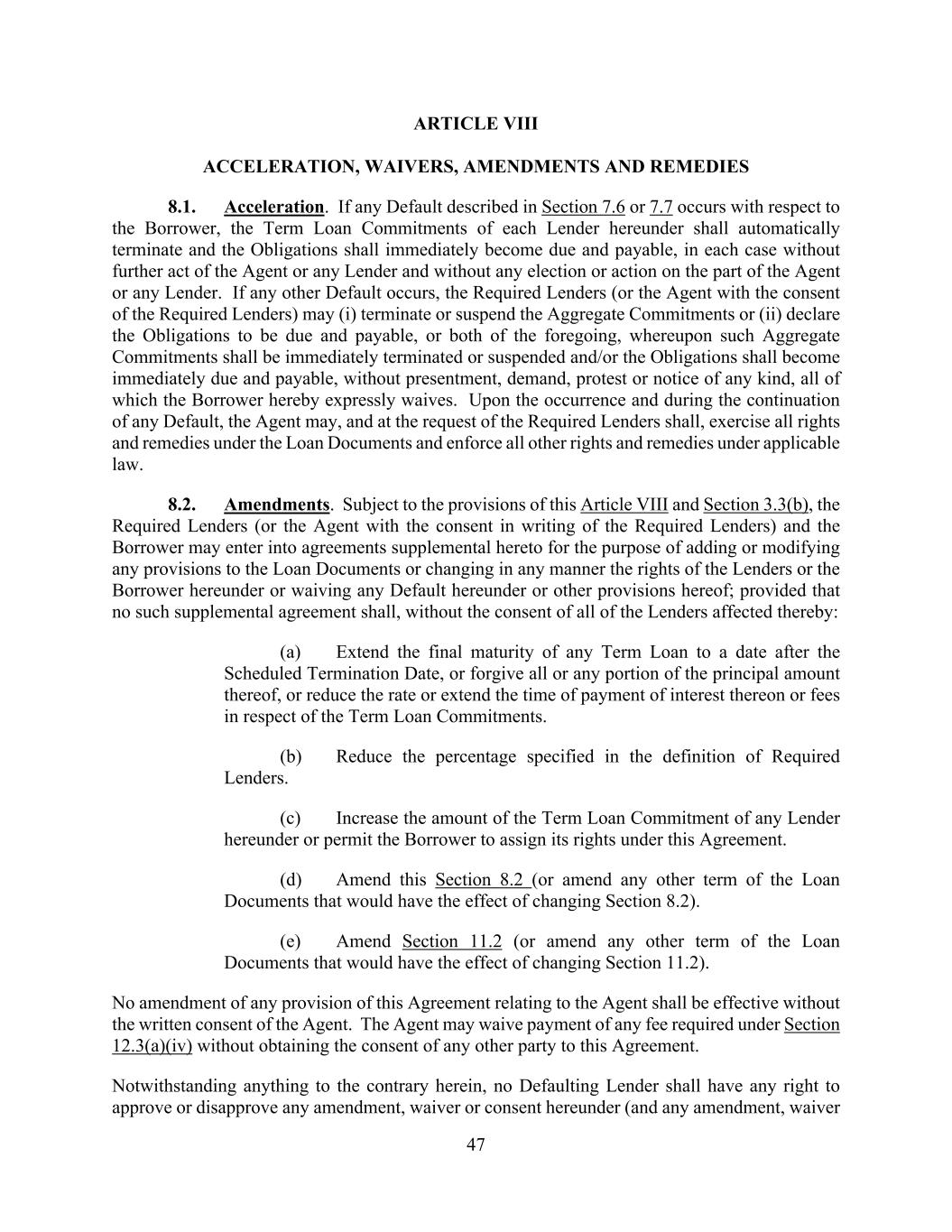 47 ARTICLE VIII ACCELERATION, WAIVERS, AMENDMENTS AND REMEDIES 8.1. Acceleration. If any Default described in Section 7.6 or 7.7 occurs with respect to the Borrower, the Term Loan Commitments of each Lender hereunder shall automatically terminate and the Obligations shall immediately become due and payable, in each case without further act of the Agent or any Lender and without any election or action on the part of the Agent or any Lender. If any other Default occurs, the Required Lenders (or the Agent with the consent of the Required Lenders) may (i) terminate or suspend the Aggregate Commitments or (ii) declare the Obligations to be due and payable, or both of the foregoing, whereupon such Aggregate Commitments shall be immediately terminated or suspended and/or the Obligations shall become immediately due and payable, without presentment, demand, protest or notice of any kind, all of which the Borrower hereby expressly waives. Upon the occurrence and during the continuation of any Default, the Agent may, and at the request of the Required Lenders shall, exercise all rights and remedies under the Loan Documents and enforce all other rights and remedies under applicable law. 8.2. Amendments. Subject to the provisions of this Article VIII and Section 3.3(b), the Required Lenders (or the Agent with the consent in writing of the Required Lenders) and the Borrower may enter into agreements supplemental hereto for the purpose of adding or modifying any provisions to the Loan Documents or changing in any manner the rights of the Lenders or the Borrower hereunder or waiving any Default hereunder or other provisions hereof; provided that no such supplemental agreement shall, without the consent of all of the Lenders affected thereby: (a) Extend the final maturity of any Term Loan to a date after the Scheduled Termination Date, or forgive all or any portion of the principal amount thereof, or reduce the rate or extend the time of payment of interest thereon or fees in respect of the Term Loan Commitments. (b) Reduce the percentage specified in the definition of Required Lenders. (c) Increase the amount of the Term Loan Commitment of any Lender hereunder or permit the Borrower to assign its rights under this Agreement. (d) Amend this Section 8.2 (or amend any other term of the Loan Documents that would have the effect of changing Section 8.2). (e) Amend Section 11.2 (or amend any other term of the Loan Documents that would have the effect of changing Section 11.2). No amendment of any provision of this Agreement relating to the Agent shall be effective without the written consent of the Agent. The Agent may waive payment of any fee required under Section 12.3(a)(iv) without obtaining the consent of any other party to this Agreement. Notwithstanding anything to the contrary herein, no Defaulting Lender shall have any right to approve or disapprove any amendment, waiver or consent hereunder (and any amendment, waiver