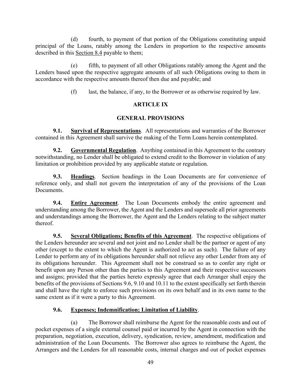 49 (d) fourth, to payment of that portion of the Obligations constituting unpaid principal of the Loans, ratably among the Lenders in proportion to the respective amounts described in this Section 8.4 payable to them; (e) fifth, to payment of all other Obligations ratably among the Agent and the Lenders based upon the respective aggregate amounts of all such Obligations owing to them in accordance with the respective amounts thereof then due and payable; and (f) last, the balance, if any, to the Borrower or as otherwise required by law. ARTICLE IX GENERAL PROVISIONS 9.1. Survival of Representations. All representations and warranties of the Borrower contained in this Agreement shall survive the making of the Term Loans herein contemplated. 9.2. Governmental Regulation. Anything contained in this Agreement to the contrary notwithstanding, no Lender shall be obligated to extend credit to the Borrower in violation of any limitation or prohibition provided by any applicable statute or regulation. 9.3. Headings. Section headings in the Loan Documents are for convenience of reference only, and shall not govern the interpretation of any of the provisions of the Loan Documents. 9.4. Entire Agreement. The Loan Documents embody the entire agreement and understanding among the Borrower, the Agent and the Lenders and supersede all prior agreements and understandings among the Borrower, the Agent and the Lenders relating to the subject matter thereof. 9.5. Several Obligations; Benefits of this Agreement. The respective obligations of the Lenders hereunder are several and not joint and no Lender shall be the partner or agent of any other (except to the extent to which the Agent is authorized to act as such). The failure of any Lender to perform any of its obligations hereunder shall not relieve any other Lender from any of its obligations hereunder. This Agreement shall not be construed so as to confer any right or benefit upon any Person other than the parties to this Agreement and their respective successors and assigns; provided that the parties hereto expressly agree that each Arranger shall enjoy the benefits of the provisions of Sections 9.6, 9.10 and 10.11 to the extent specifically set forth therein and shall have the right to enforce such provisions on its own behalf and in its own name to the same extent as if it were a party to this Agreement. 9.6. Expenses; Indemnification; Limitation of Liability. (a) The Borrower shall reimburse the Agent for the reasonable costs and out of pocket expenses of a single external counsel paid or incurred by the Agent in connection with the preparation, negotiation, execution, delivery, syndication, review, amendment, modification and administration of the Loan Documents. The Borrower also agrees to reimburse the Agent, the Arrangers and the Lenders for all reasonable costs, internal charges and out of pocket expenses