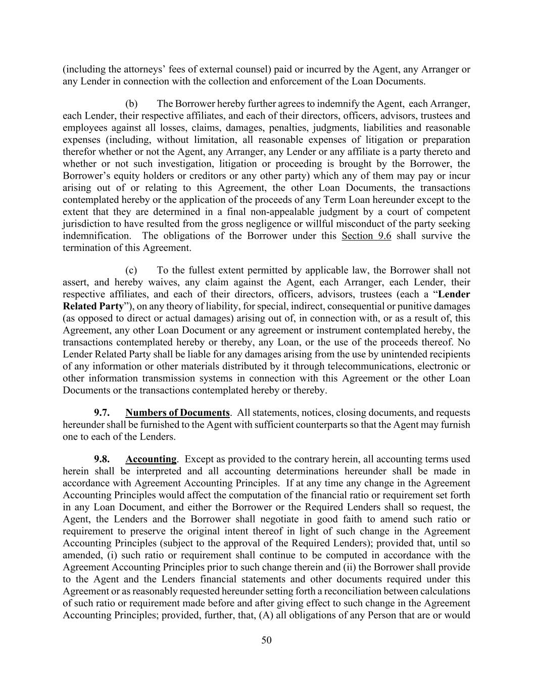 50 (including the attorneys’ fees of external counsel) paid or incurred by the Agent, any Arranger or any Lender in connection with the collection and enforcement of the Loan Documents. (b) The Borrower hereby further agrees to indemnify the Agent, each Arranger, each Lender, their respective affiliates, and each of their directors, officers, advisors, trustees and employees against all losses, claims, damages, penalties, judgments, liabilities and reasonable expenses (including, without limitation, all reasonable expenses of litigation or preparation therefor whether or not the Agent, any Arranger, any Lender or any affiliate is a party thereto and whether or not such investigation, litigation or proceeding is brought by the Borrower, the Borrower’s equity holders or creditors or any other party) which any of them may pay or incur arising out of or relating to this Agreement, the other Loan Documents, the transactions contemplated hereby or the application of the proceeds of any Term Loan hereunder except to the extent that they are determined in a final non-appealable judgment by a court of competent jurisdiction to have resulted from the gross negligence or willful misconduct of the party seeking indemnification. The obligations of the Borrower under this Section 9.6 shall survive the termination of this Agreement. (c) To the fullest extent permitted by applicable law, the Borrower shall not assert, and hereby waives, any claim against the Agent, each Arranger, each Lender, their respective affiliates, and each of their directors, officers, advisors, trustees (each a “Lender Related Party”), on any theory of liability, for special, indirect, consequential or punitive damages (as opposed to direct or actual damages) arising out of, in connection with, or as a result of, this Agreement, any other Loan Document or any agreement or instrument contemplated hereby, the transactions contemplated hereby or thereby, any Loan, or the use of the proceeds thereof. No Lender Related Party shall be liable for any damages arising from the use by unintended recipients of any information or other materials distributed by it through telecommunications, electronic or other information transmission systems in connection with this Agreement or the other Loan Documents or the transactions contemplated hereby or thereby. 9.7. Numbers of Documents. All statements, notices, closing documents, and requests hereunder shall be furnished to the Agent with sufficient counterparts so that the Agent may furnish one to each of the Lenders. 9.8. Accounting. Except as provided to the contrary herein, all accounting terms used herein shall be interpreted and all accounting determinations hereunder shall be made in accordance with Agreement Accounting Principles. If at any time any change in the Agreement Accounting Principles would affect the computation of the financial ratio or requirement set forth in any Loan Document, and either the Borrower or the Required Lenders shall so request, the Agent, the Lenders and the Borrower shall negotiate in good faith to amend such ratio or requirement to preserve the original intent thereof in light of such change in the Agreement Accounting Principles (subject to the approval of the Required Lenders); provided that, until so amended, (i) such ratio or requirement shall continue to be computed in accordance with the Agreement Accounting Principles prior to such change therein and (ii) the Borrower shall provide to the Agent and the Lenders financial statements and other documents required under this Agreement or as reasonably requested hereunder setting forth a reconciliation between calculations of such ratio or requirement made before and after giving effect to such change in the Agreement Accounting Principles; provided, further, that, (A) all obligations of any Person that are or would